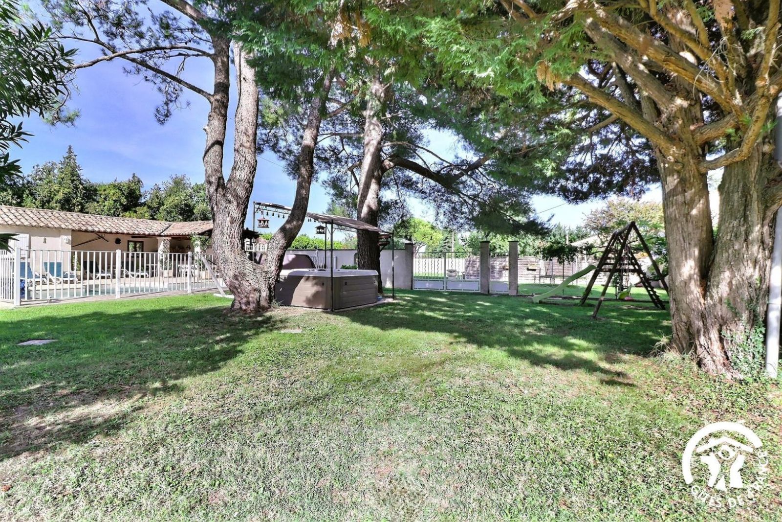 Le jardin de 1200 m² est paysagé avec de grands arbres et des fleurs, et est entièrement clôturé.