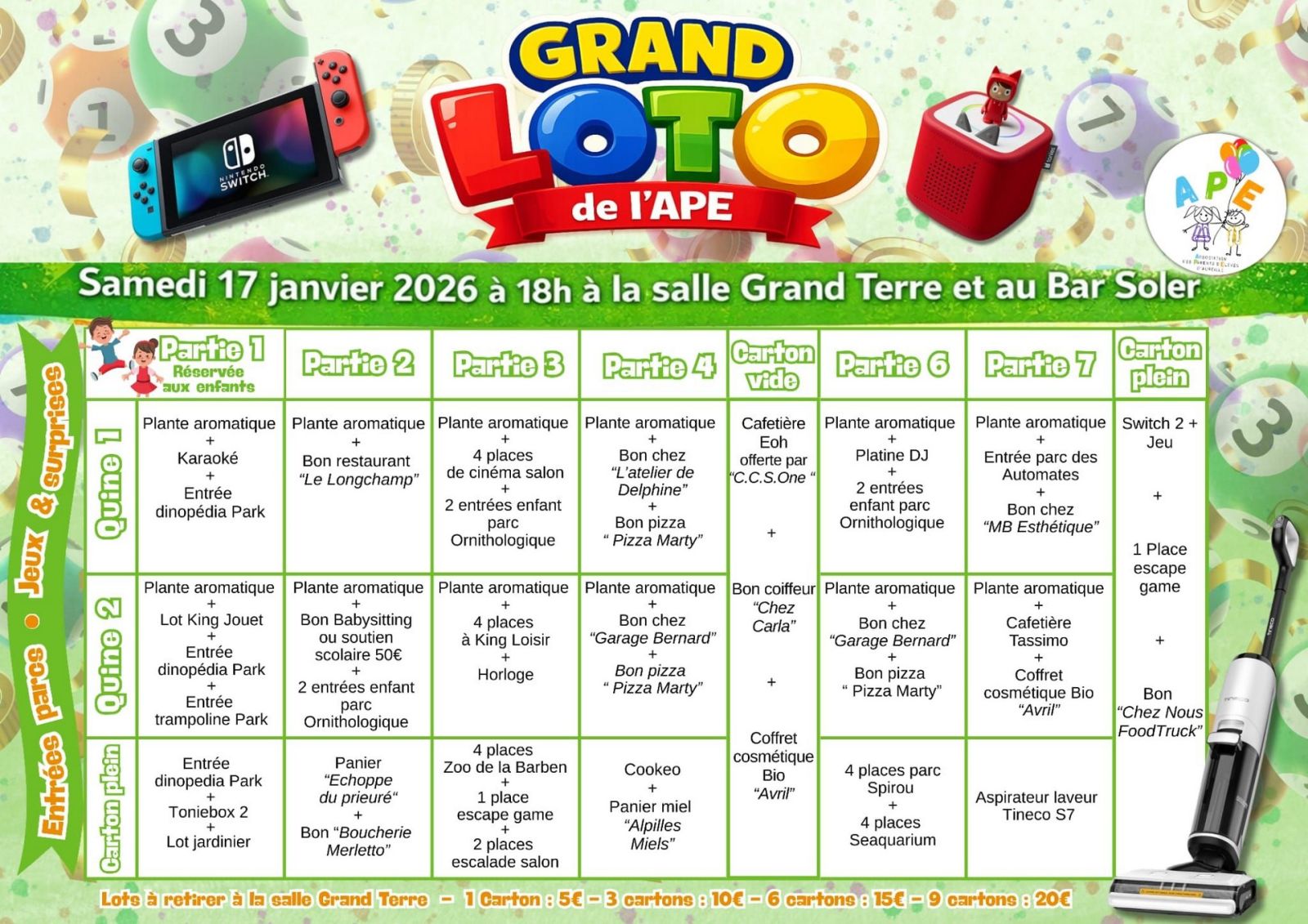 Les lotos se dérouleront à la Salle de la Grand-Terre et au Bar Soler à 18h précises