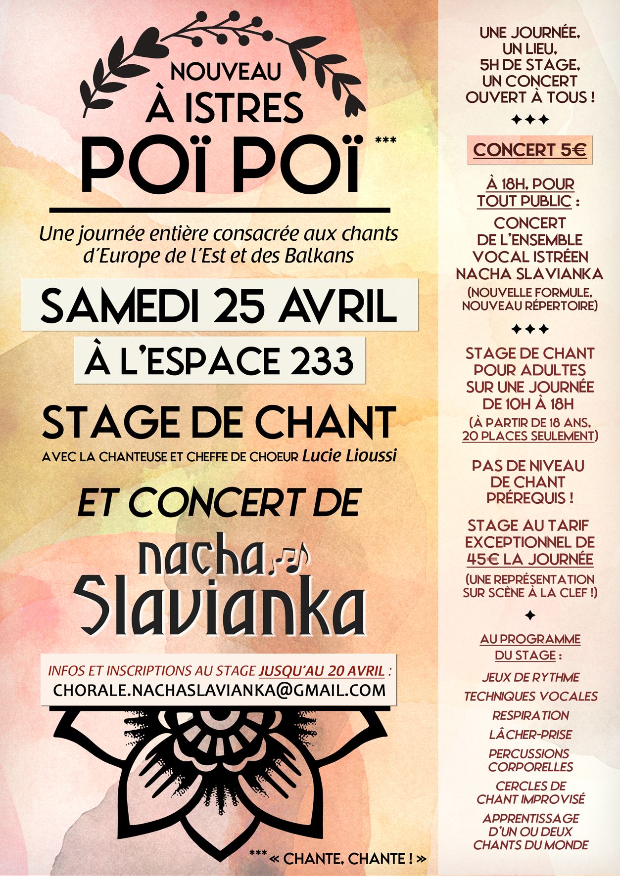 Pour tous renseignements et pour vous inscrire au stage, merci de nous contacter à l'adresse suivante : chorale.nachaslavianka@gmail.com