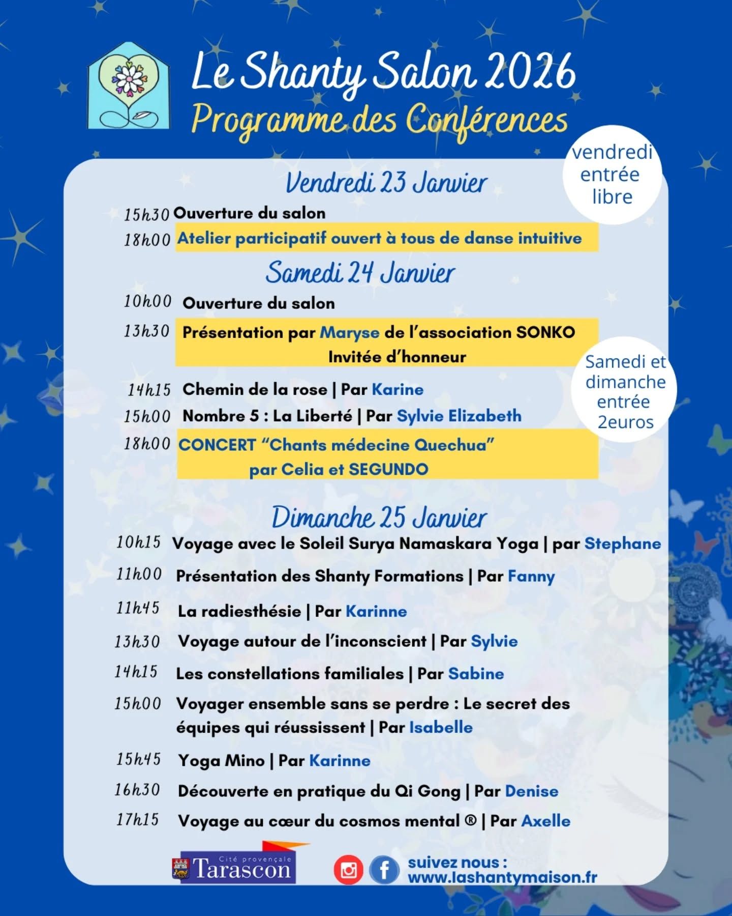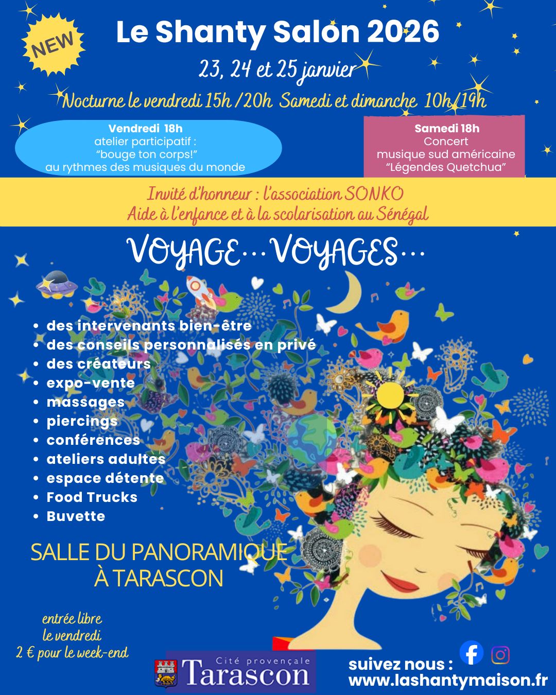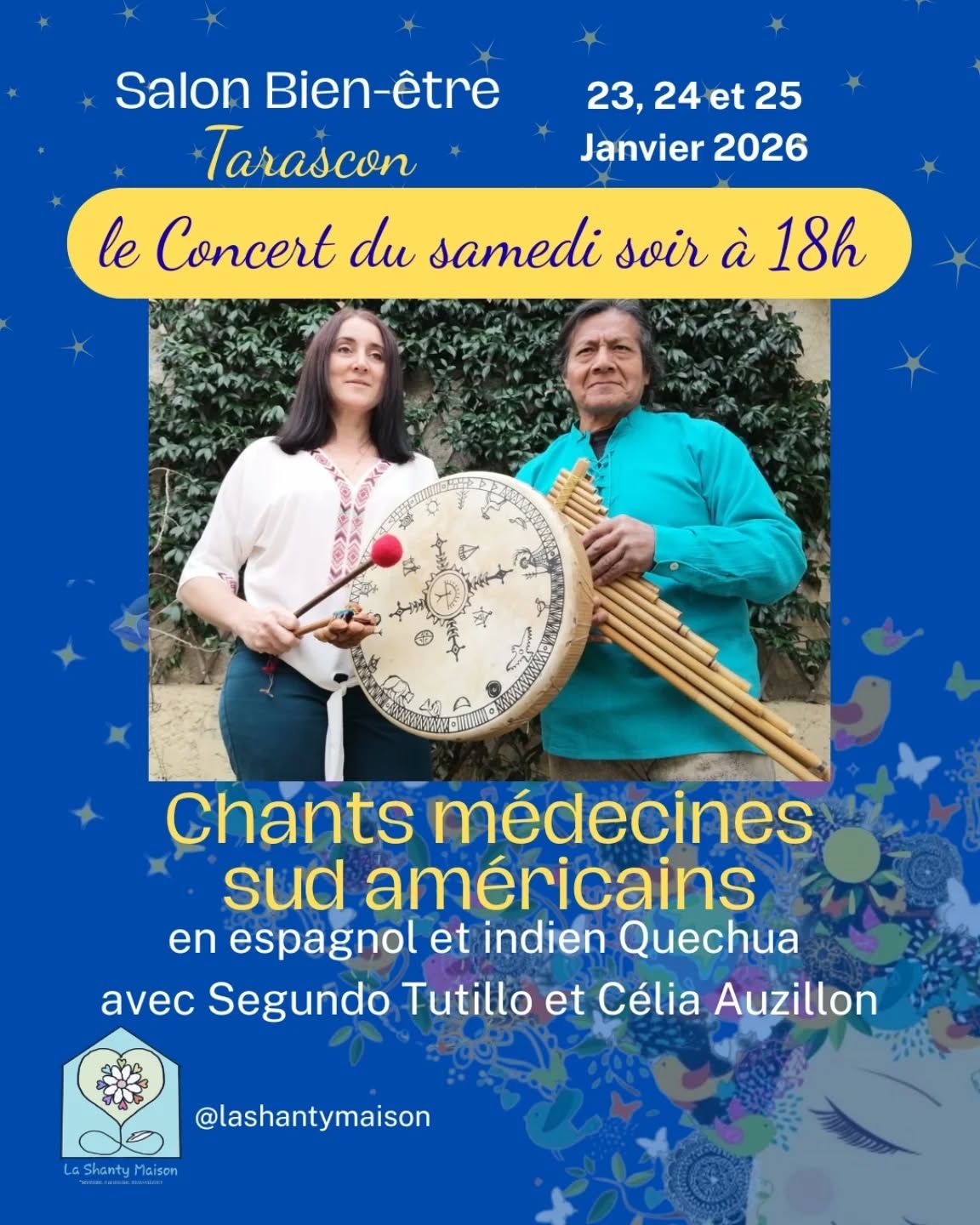 Un véritable voyage des sens, entre bien-être, musiques du monde et découvertes inspirantes, des exposants de qualité passionnés, un espace cocooning, un espace massages, des moments de relaxation, du yoga, des échanges, des conférences etc... Une restauration originale de qualité rendez-vous sur la page facebook La Shanty Maison pour retrouver tous les détails de cet évènement bien être à Tarascon ! Le concert "Chants Médecines Sud Américaines" en Espagnol et Indien Queshua avec Segundo Tutillo et Célia Auzillon clôturera la journée du samedi 24 janvier !
