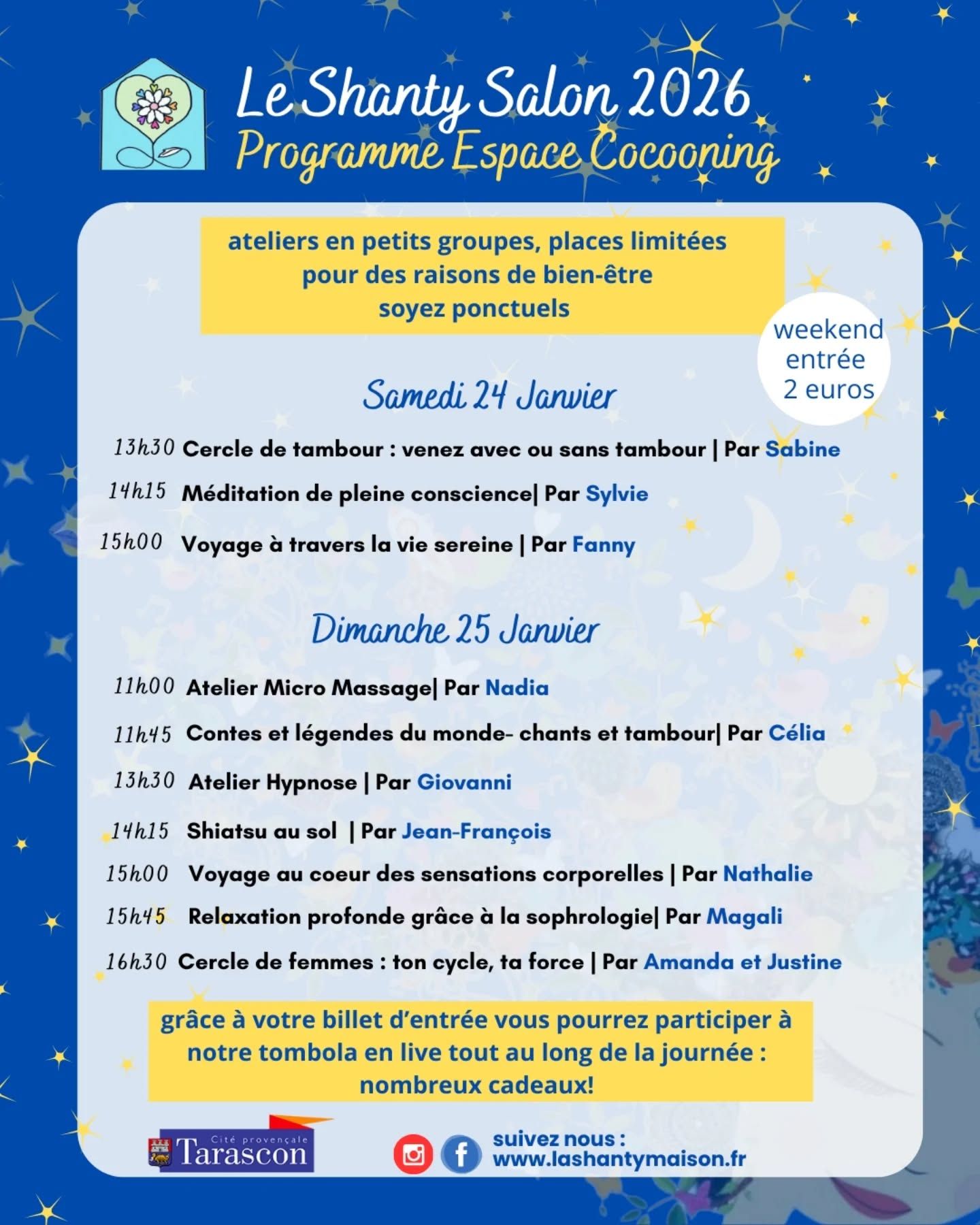 Le salon du bien-être de la Shanty Maison est organisé du 23 au 25 janvier 2026 en partenariat avec la ville de Tarascon ! Des conférences, des animations dans l'espace cocooning et la restauration durant les deux jours du salon, sur place ou à emporter !