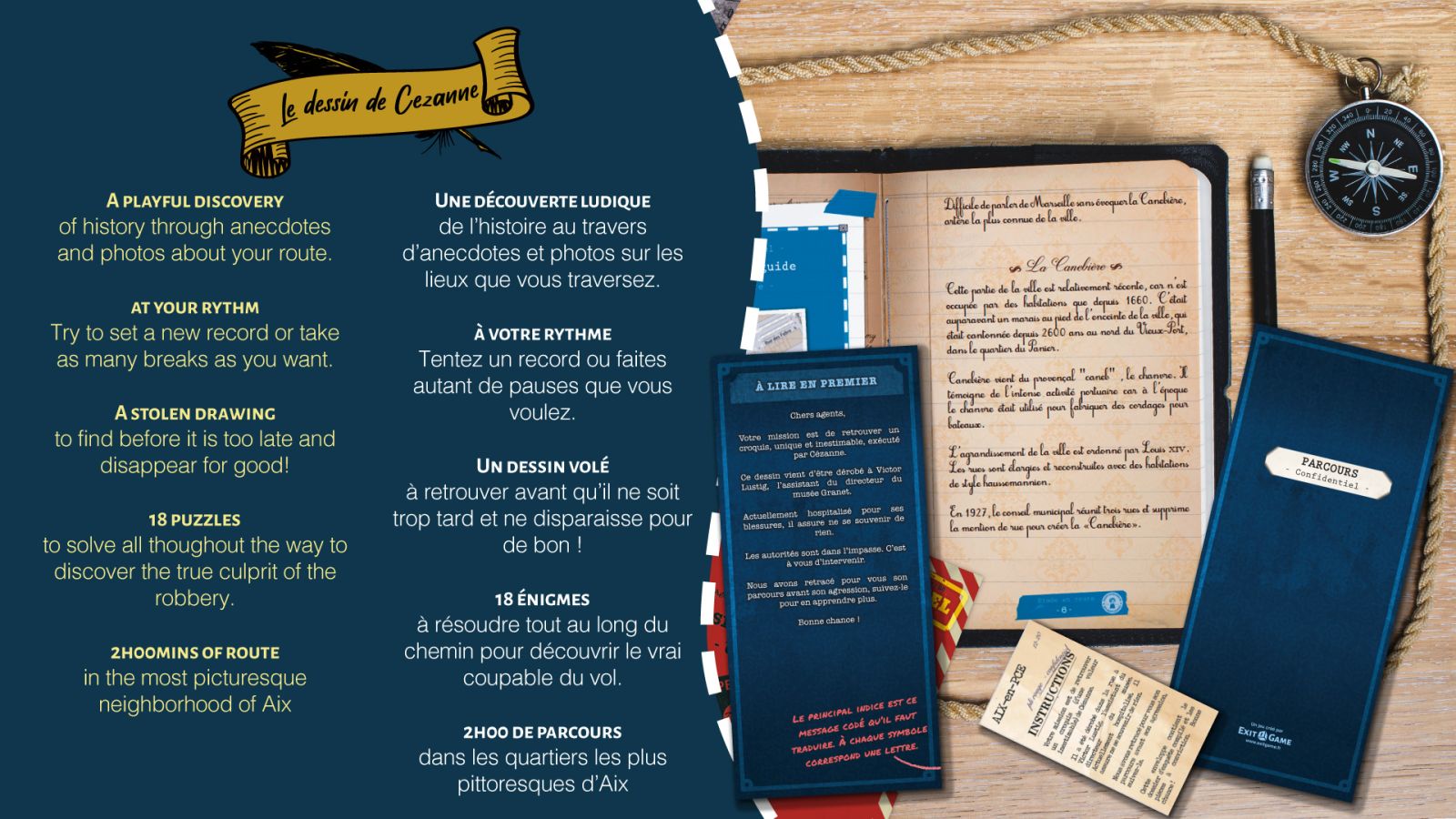 Guidé par un kit d’enquêteur fourni par l’Office de Tourisme d'Aix-en-Provence, à vous de résoudre les 18 énigmes de l’aventure tout en profitant d’un parcours original à travers la ville, ponctué d’anecdotes historiques.