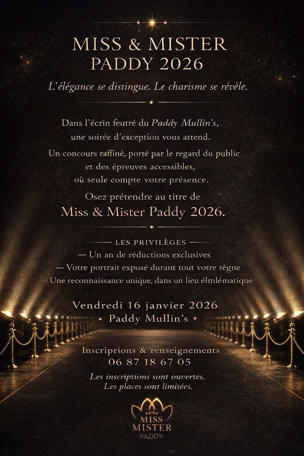 Le concours le plus fun de l’année débarque au Paddy Mullin’s ! En 2026, le pub te donne rendez-vous pour l’élection de Miss & Mister Paddy : un événement 100 % bonne humeur, ouvert à toutes et à tous, placé sous le signe du rire et de la convivialité. Sur place, l’ambiance promet d’être ultra festive avec un vote du public et une série de défis aussi marrants qu’inattendus, pour une soirée pleine de surprises et de fous rires.