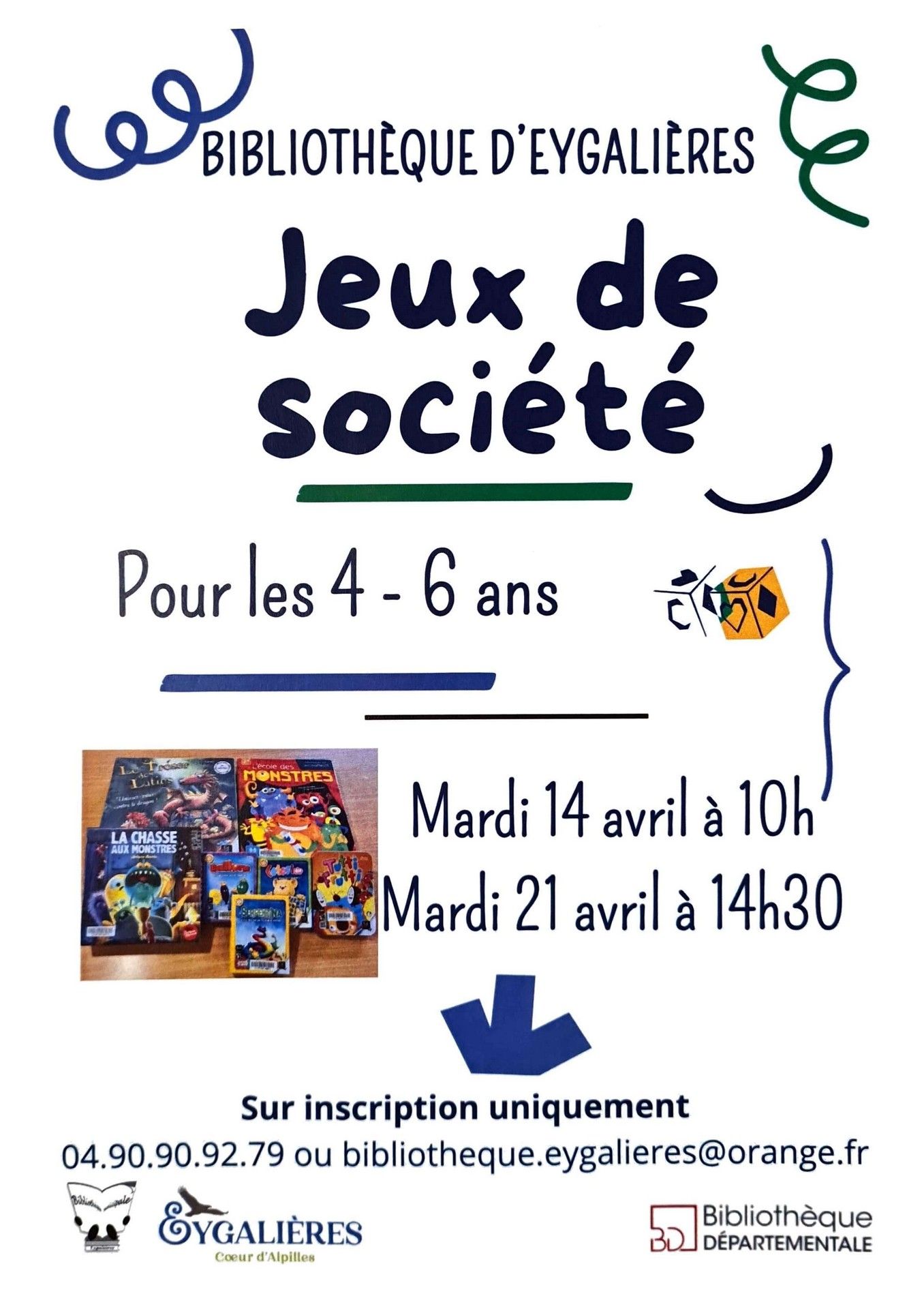 © Médiathèque Charles Galtier Affiche Animation jeux de société pour les pitchouns Médiathèque d'Eygalières 14.04 et 21.04.26