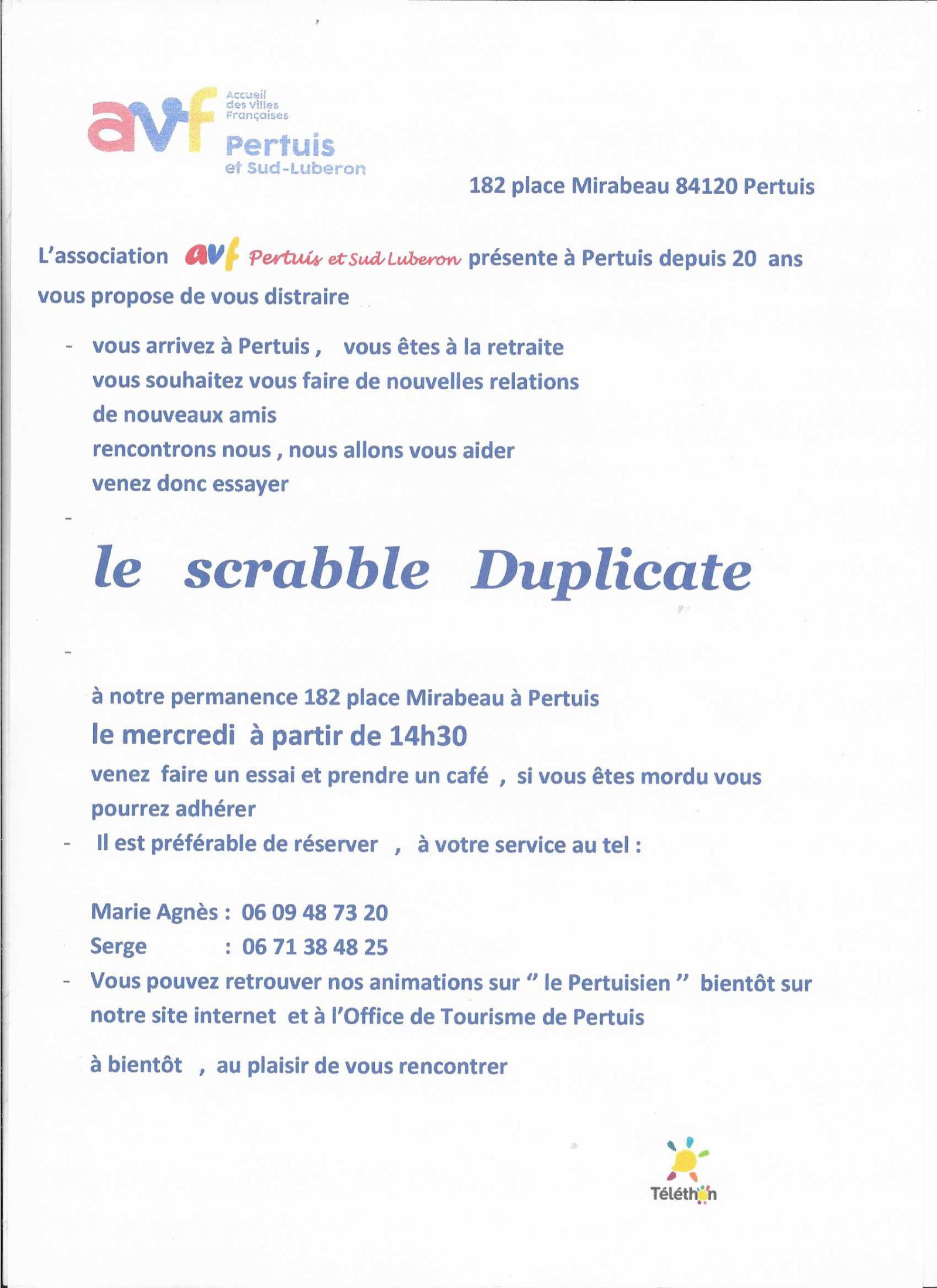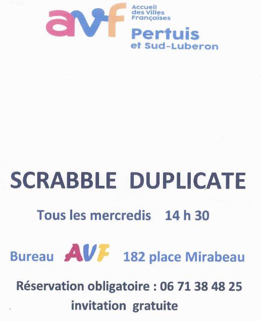Jouer au scrabble duplicate tous les mercredis à 14h30 au bureau AVF 182 Place mirabeau Pour tous les membres de l'association AVF.