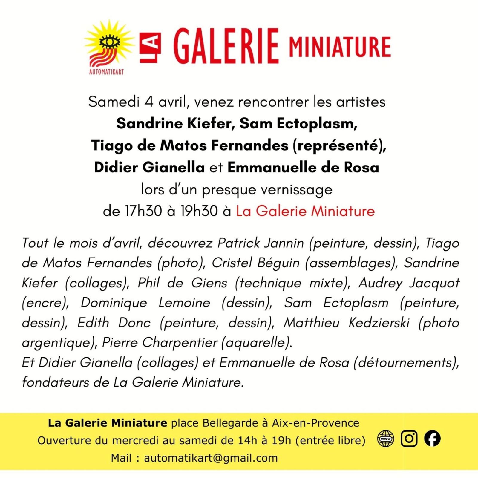 Un presque vernissage c'est la rencontre conviviale d'une partie des artistes exposant à La Galerie Miniature avec le public. C'est aussi l'occasion de présenter la démarche de cette galerie associative et alternative.
