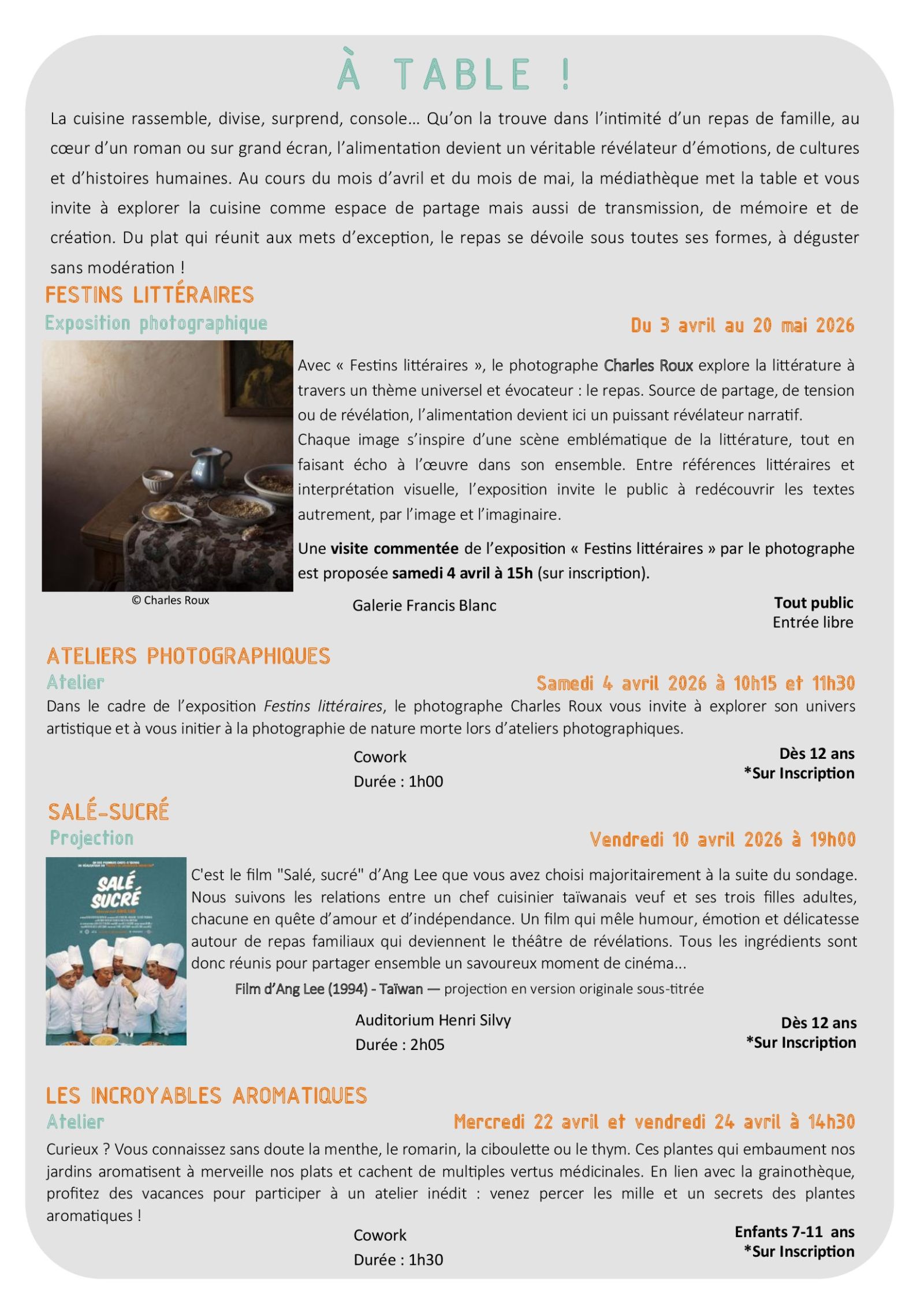 Du 3 avril au 20 mai « Festins Littéraires » de Charles Roux- Exposition - Tout public