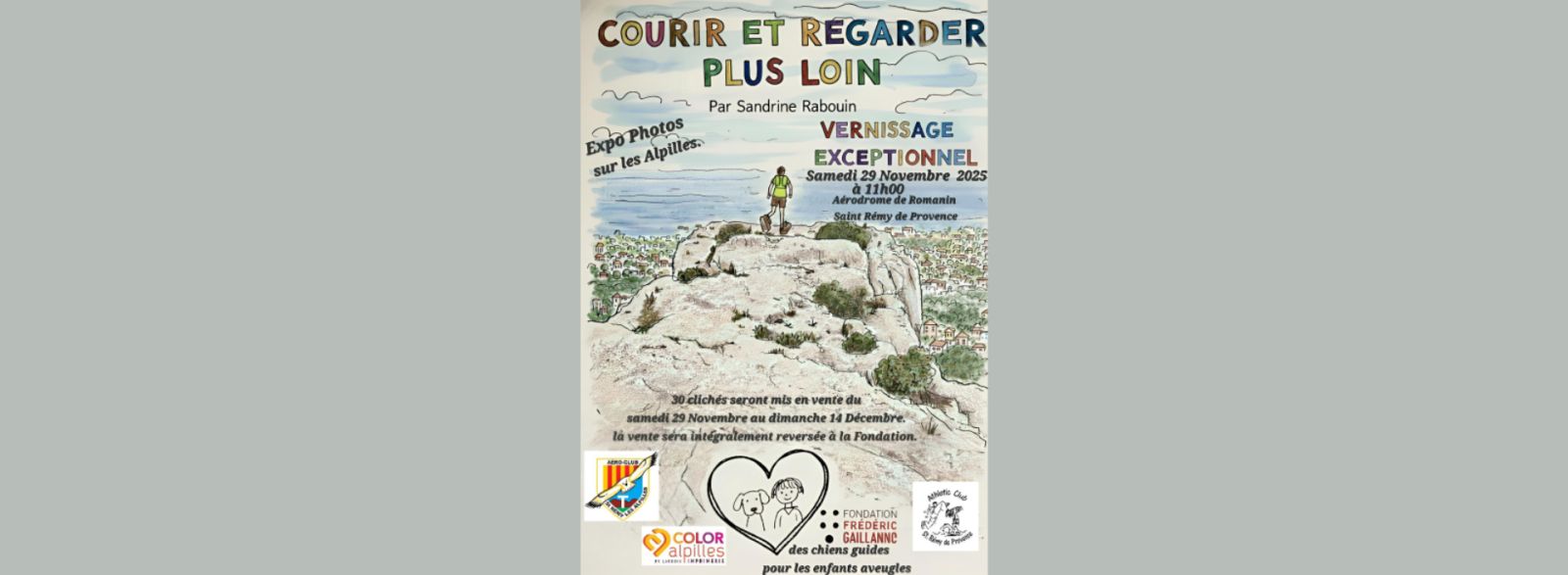 L'aéro-club de Saint-Rémy-de -Provence avec le club de Trail de Saint Rémy, vous invite à venir voir l'exposition de photos de Sandrine Rabouin au profit de la fondation Frédéric Gaillanne, l'intégralité de la vente des photographies sera reversée à cette fondation pour le financement de chiens guide pour les enfants aveugles.