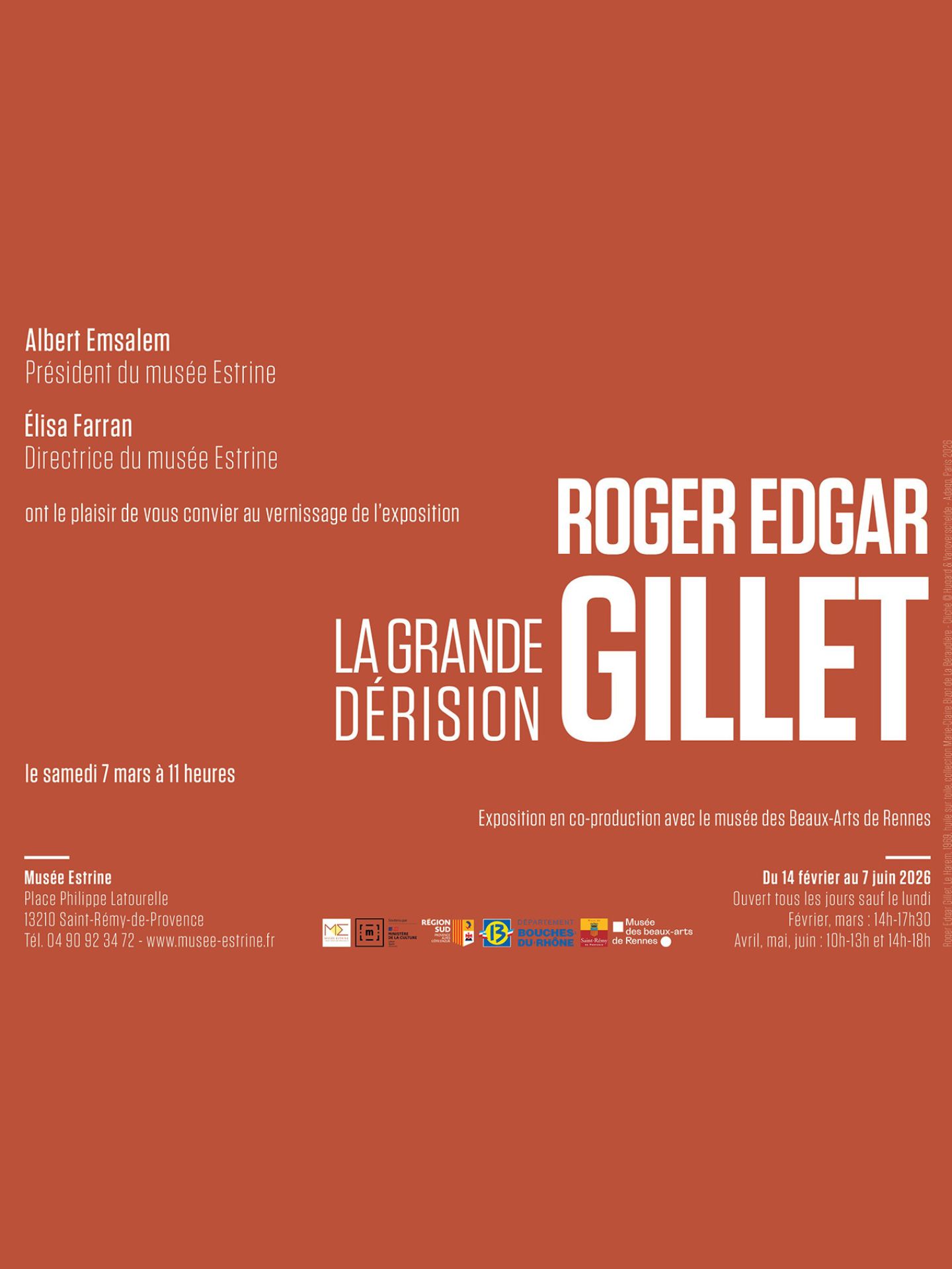Le musée Estrine vous invite au vernissage de l'exposition "La grande dérision" de Roger Edgar Gillet le samedi 7 mars à 11h à Saint-Rémy-de-Provence !