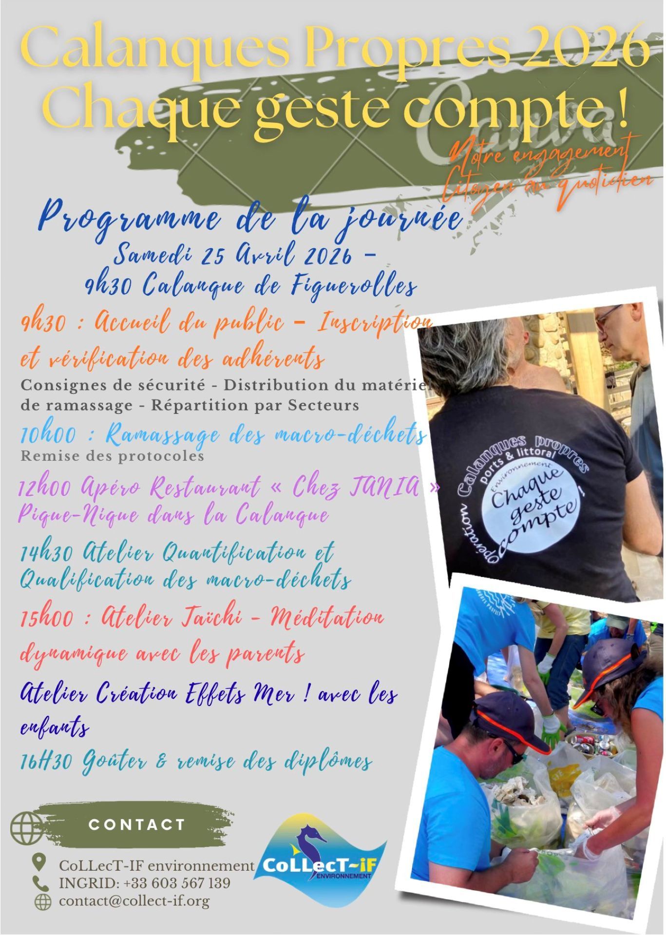 9h30 : accueil du public, inscription et vérification des adhérents par les associations Collect-If Environnement et Les Sentinelles de la Mer Méditerranée. Consignes de sécurité, distribution du matériel de ramassage et répartition par secteurs.