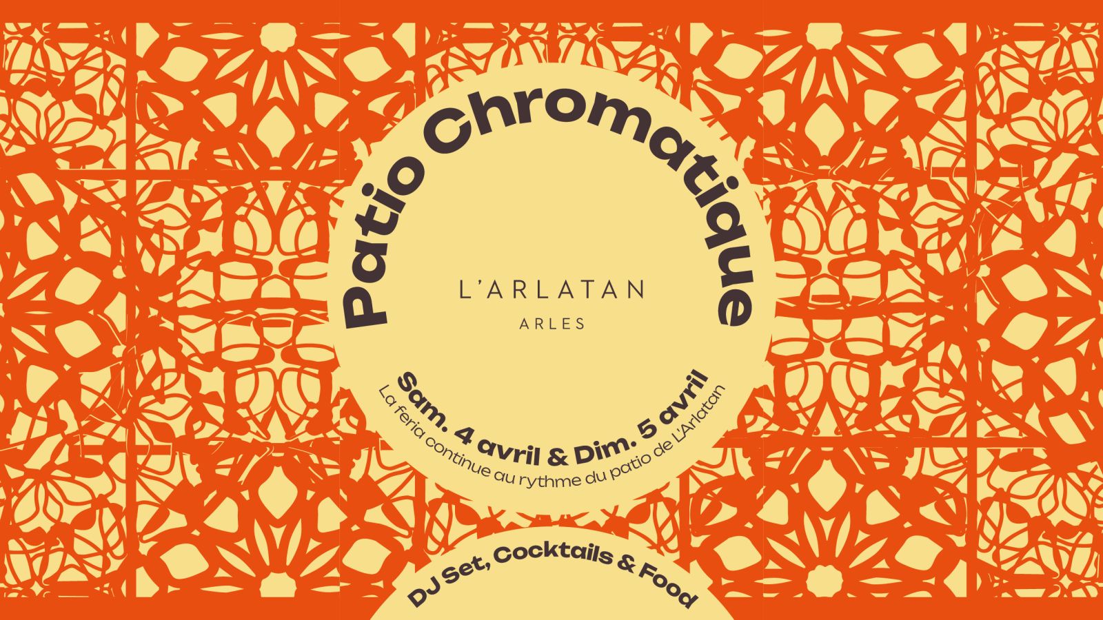 Les samedi 4 et dimanche 5 avril, de 18h à minuit, le patio accueillera la première édition de « Patio Chromatique » ! Un DJ set accompagnera la soirée d'une bande-son discrète pour profiter, boire un verre, dîner et se retrouver à son rythme.