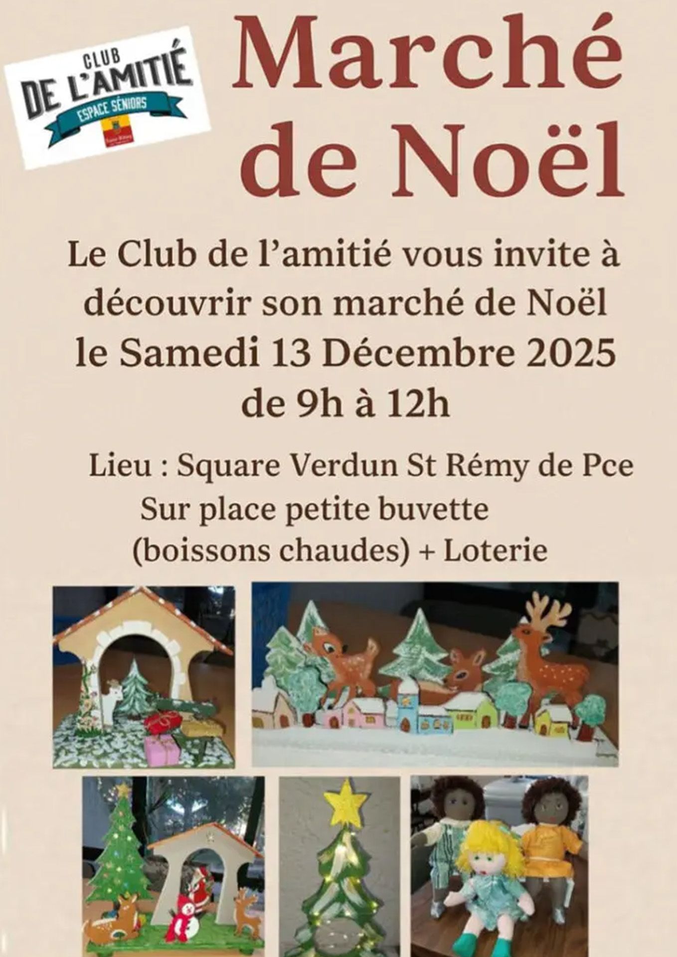 Marché de Noël du Club de l’amitié à Saint‑Rémy‑de‑Provence : petit marché festif sur le Square Verdun le samedi 13 décembre de 9h à 12h, avec buvette et loterie.