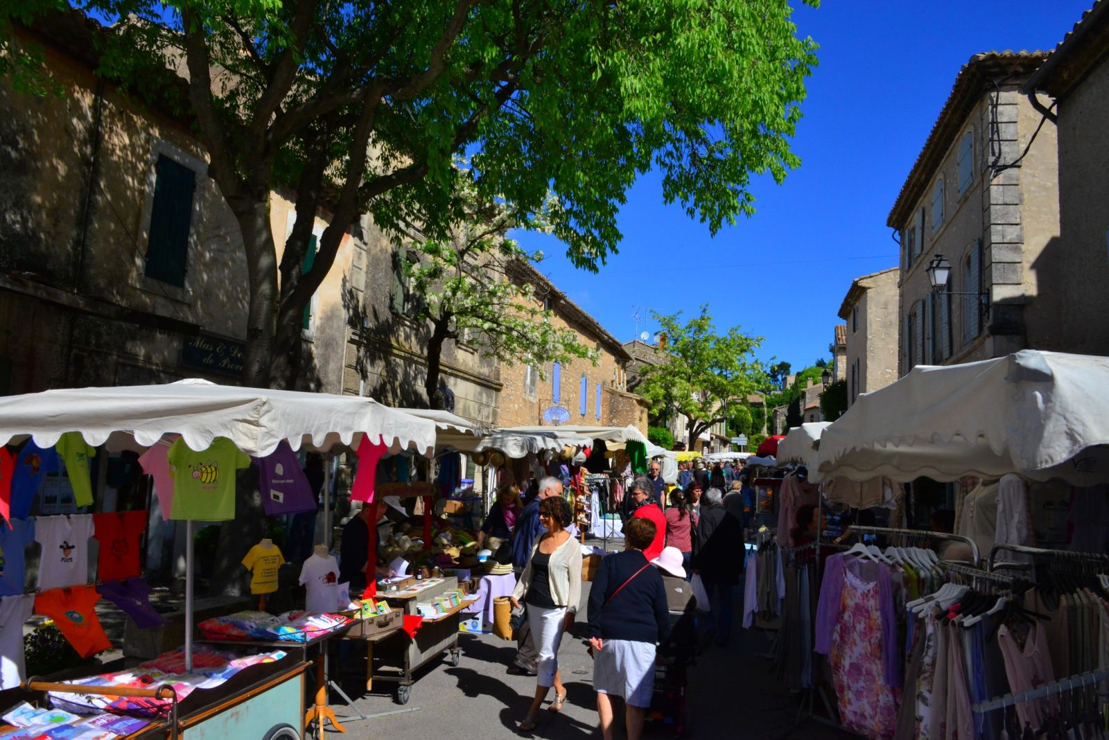 Très beau marché provençal à Eygalières : on y vend fruits et légumes, fromage, charcuterie ainsi que vêtements, ustensiles, meubles, jouets ou autres produits non-alimentaires.