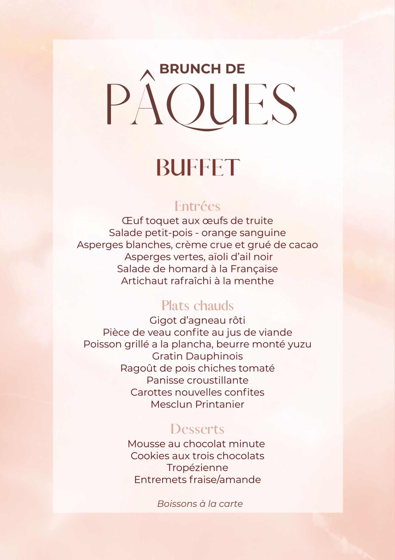 Avis à tous les gourmands, nos Pâtissiers feront également la part belle aux classiques douceurs de Pâques. Divers cocktails spécialement imaginés pour l'occasion pourront accompagner votre déjeuner, tout comme les vins du domaine.