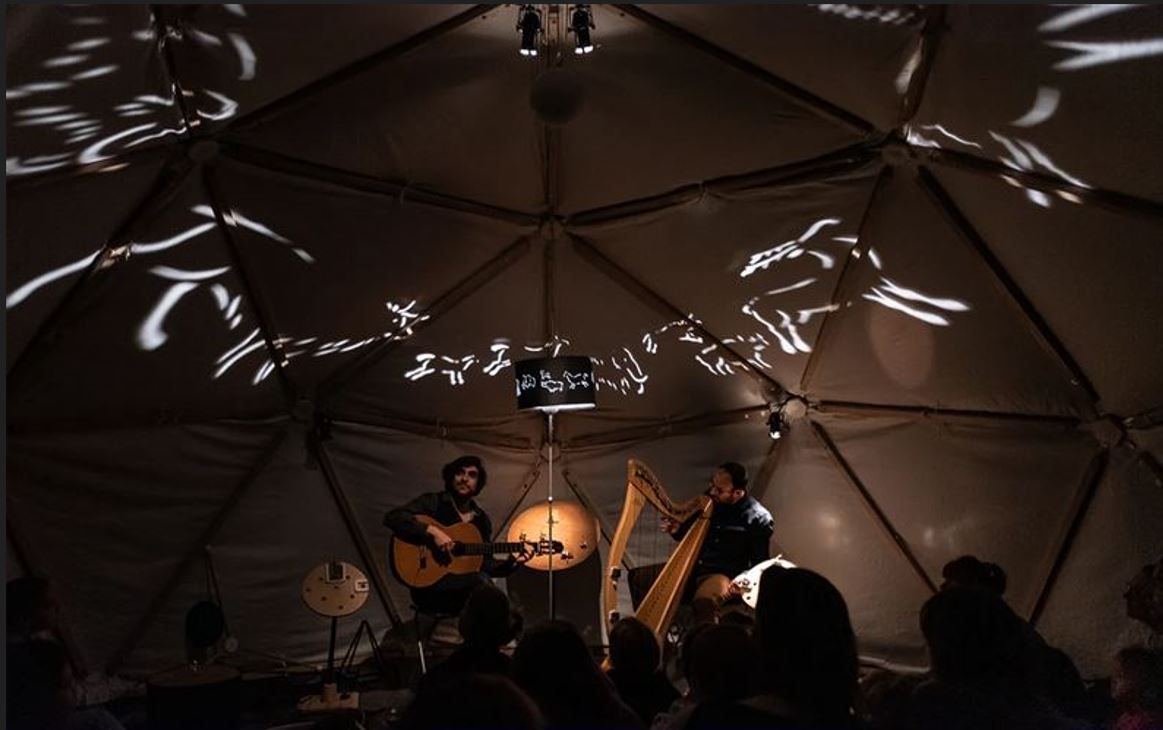 Dans une géode, une harpe et une guitare accompagnées d’une vingtaine de boîtes à musique vous proposent un voyage imaginaire jusqu’aux étoiles…