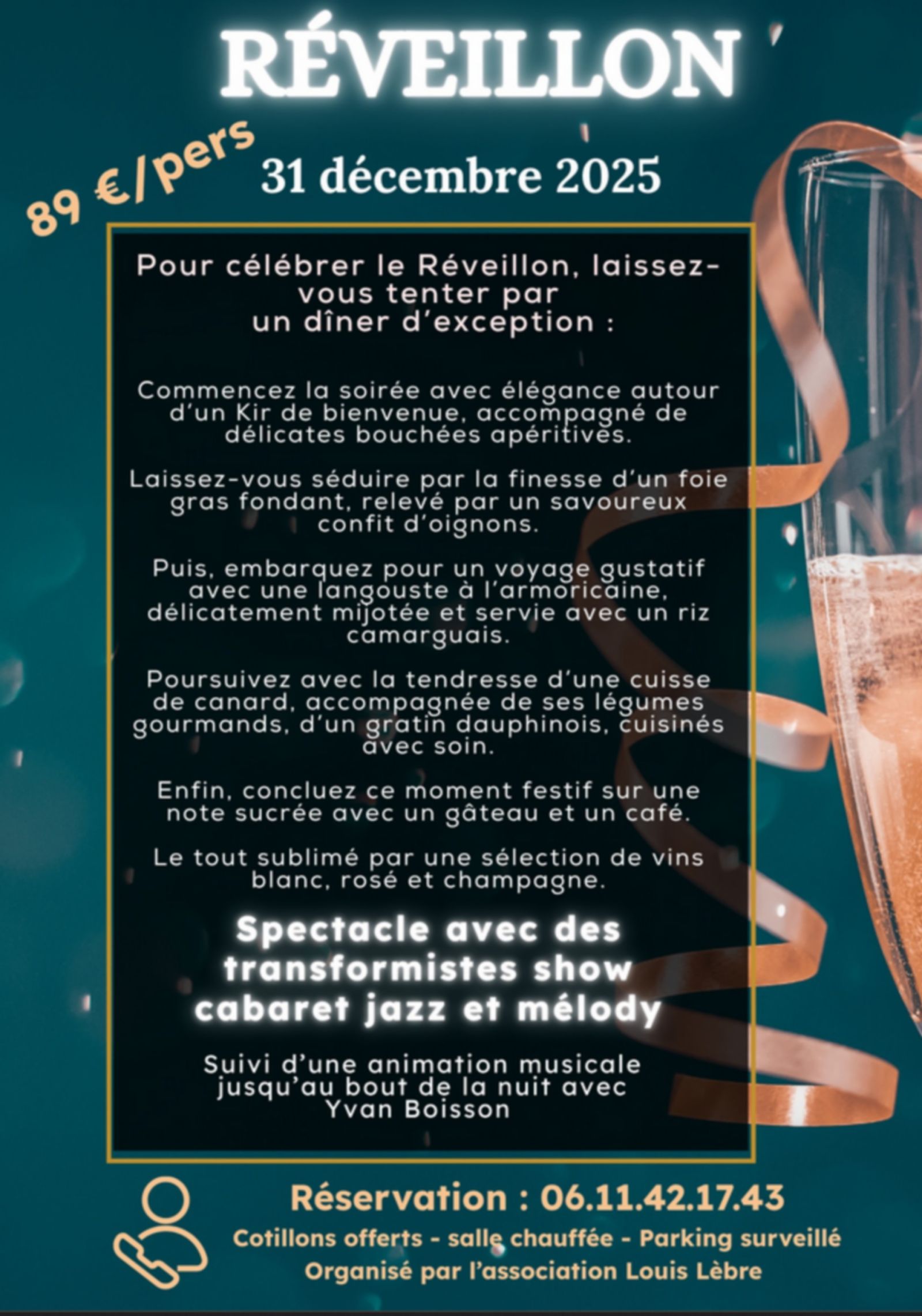 89€ - Réservation obligatoire au 06 11 42 17 43