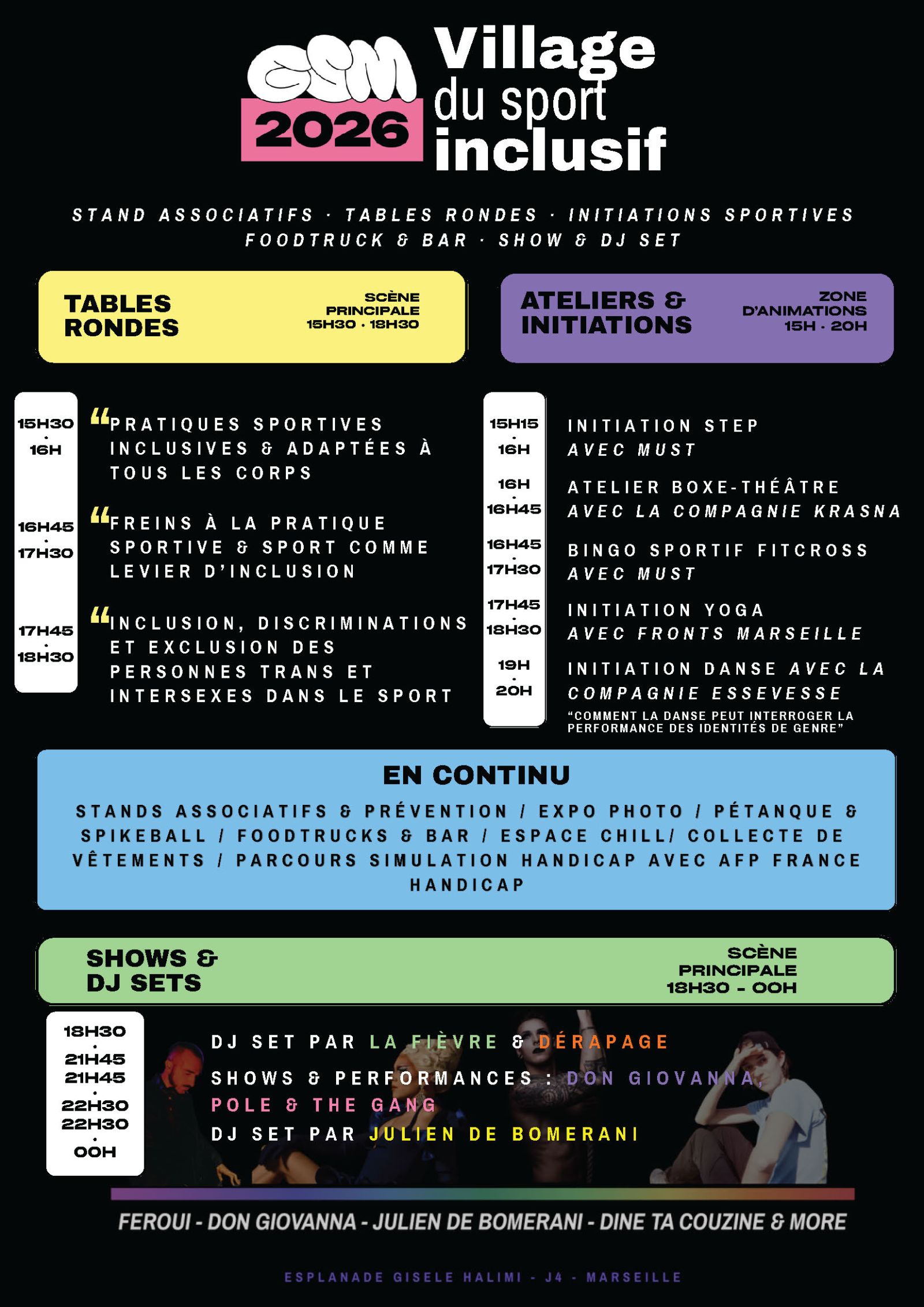 Samedi de 15h à minuit : découvrez le Village du Sport Inclusif : stands associatifs, tables rondes, initiations, shows et DJ Sets – Foodtrucks et bar.