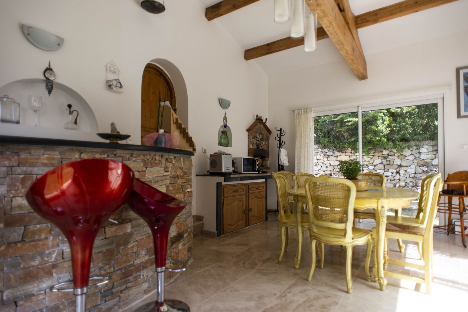 - Un salon avec deux canapés, fauteuil, table basse, TV, table avec 4 chaises, cheminée décorative, cuisine équipée d'un grand réfrigérateur (pas de congélateur), four, micro-onde, lave-vaisselle, machine à café Nespresso, bouilloire