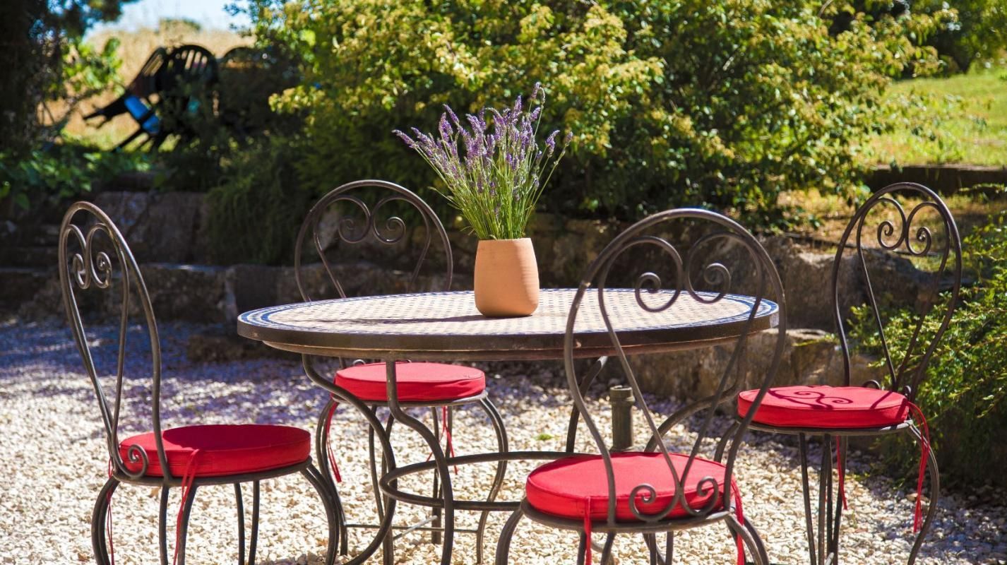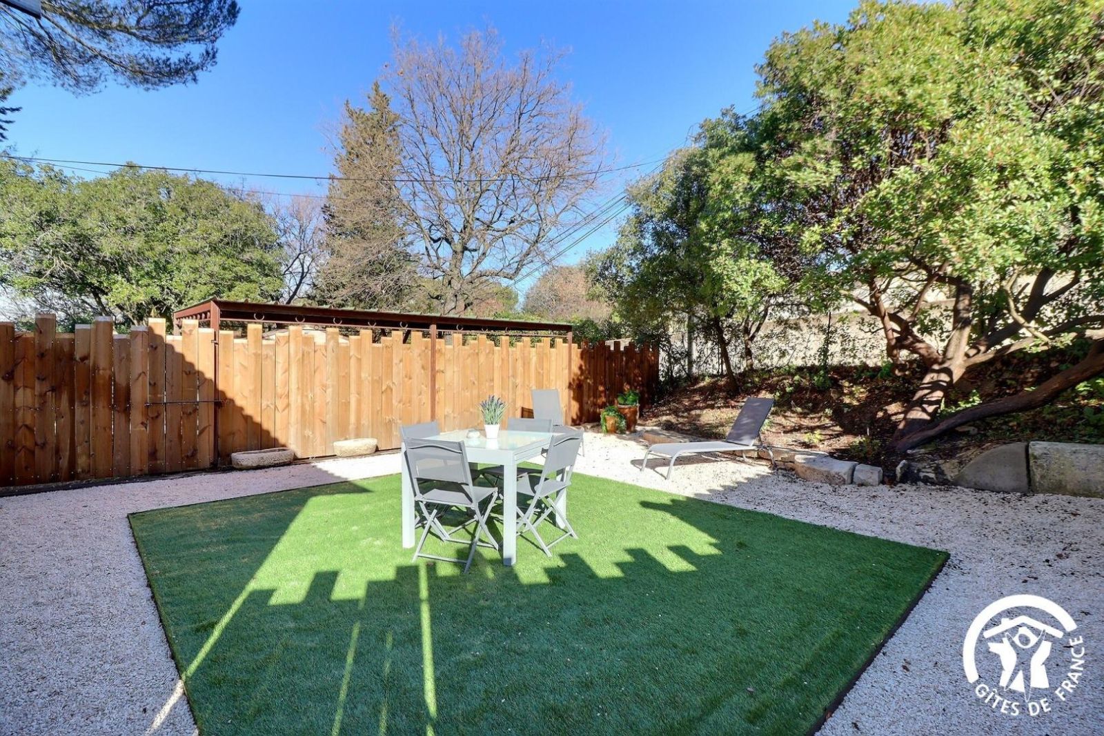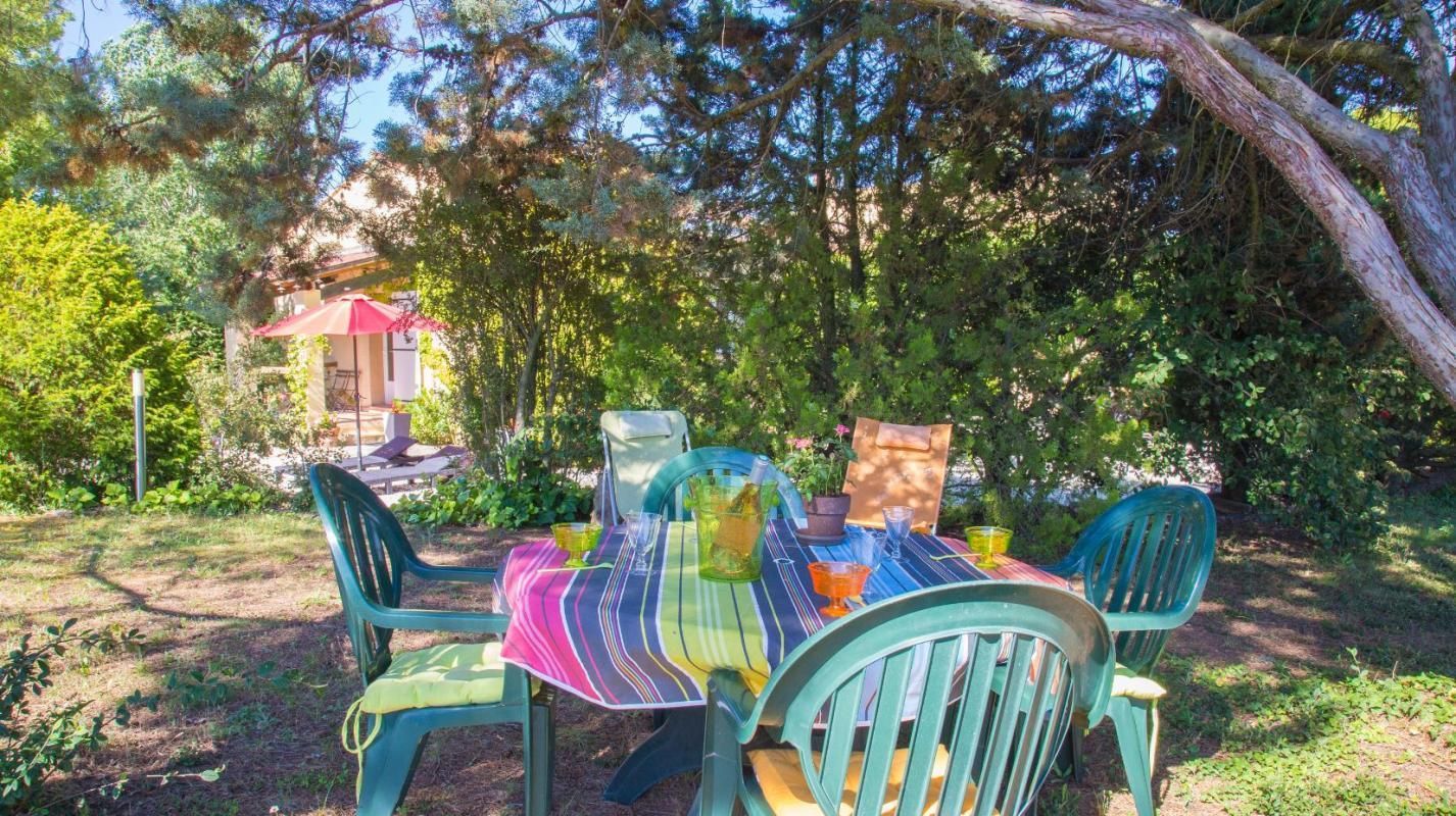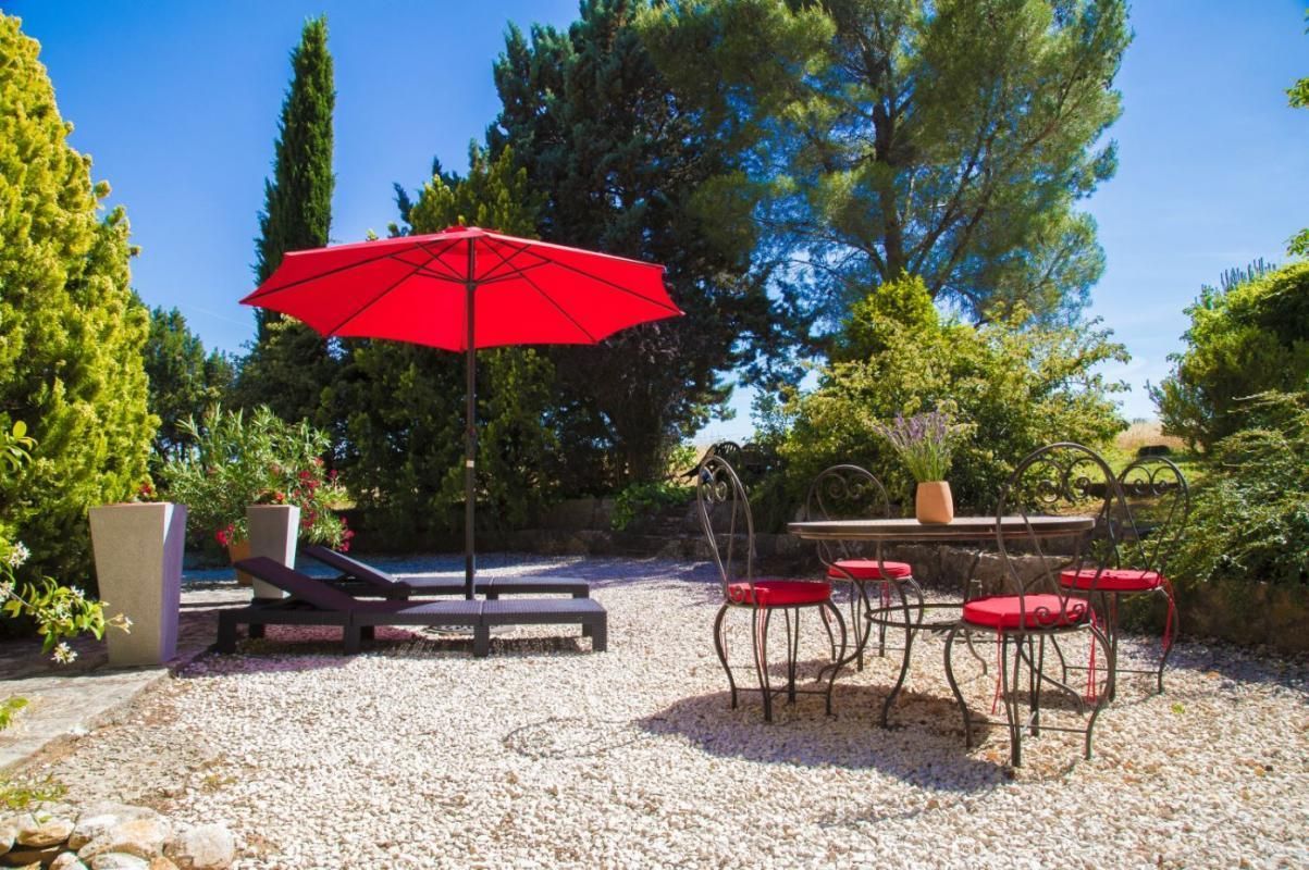 Petite terrasse couverte, grand espace gravillonné et jardin arboré privé de 1000 m² non clos, salon de jardin, barbecue, parking.