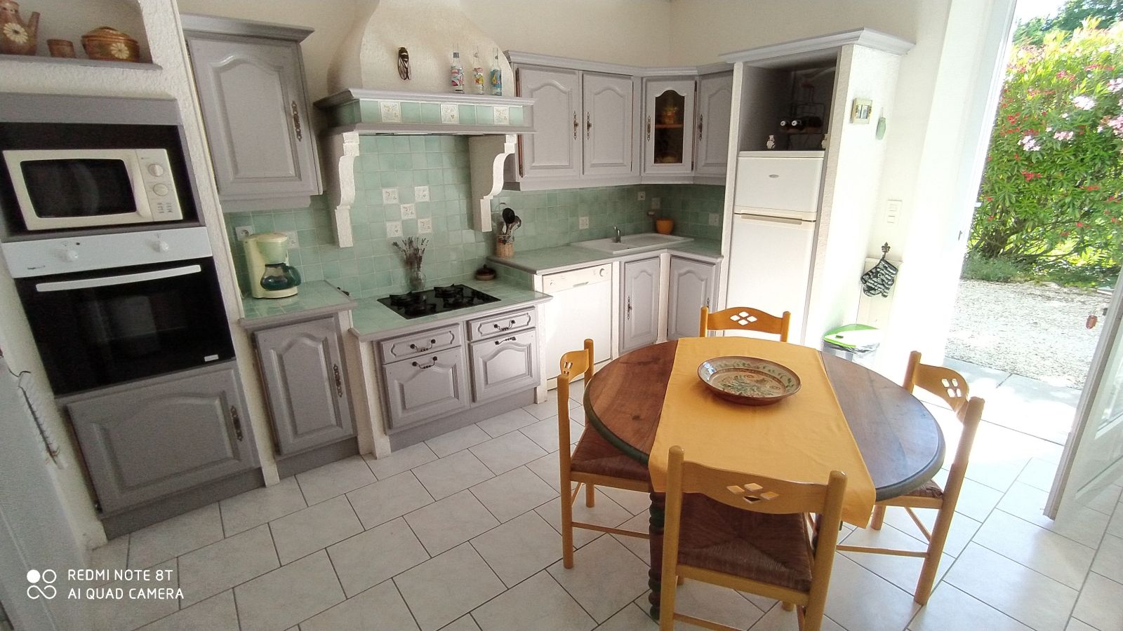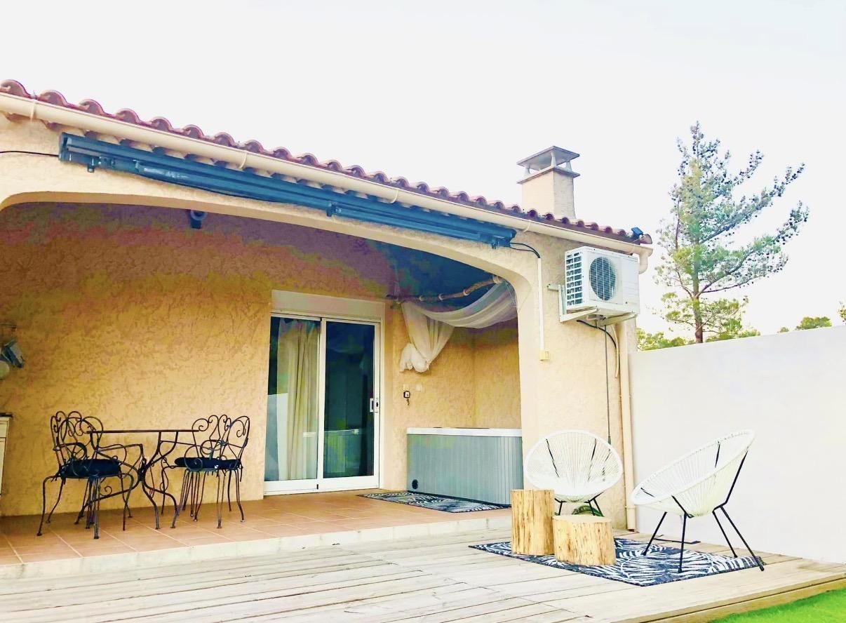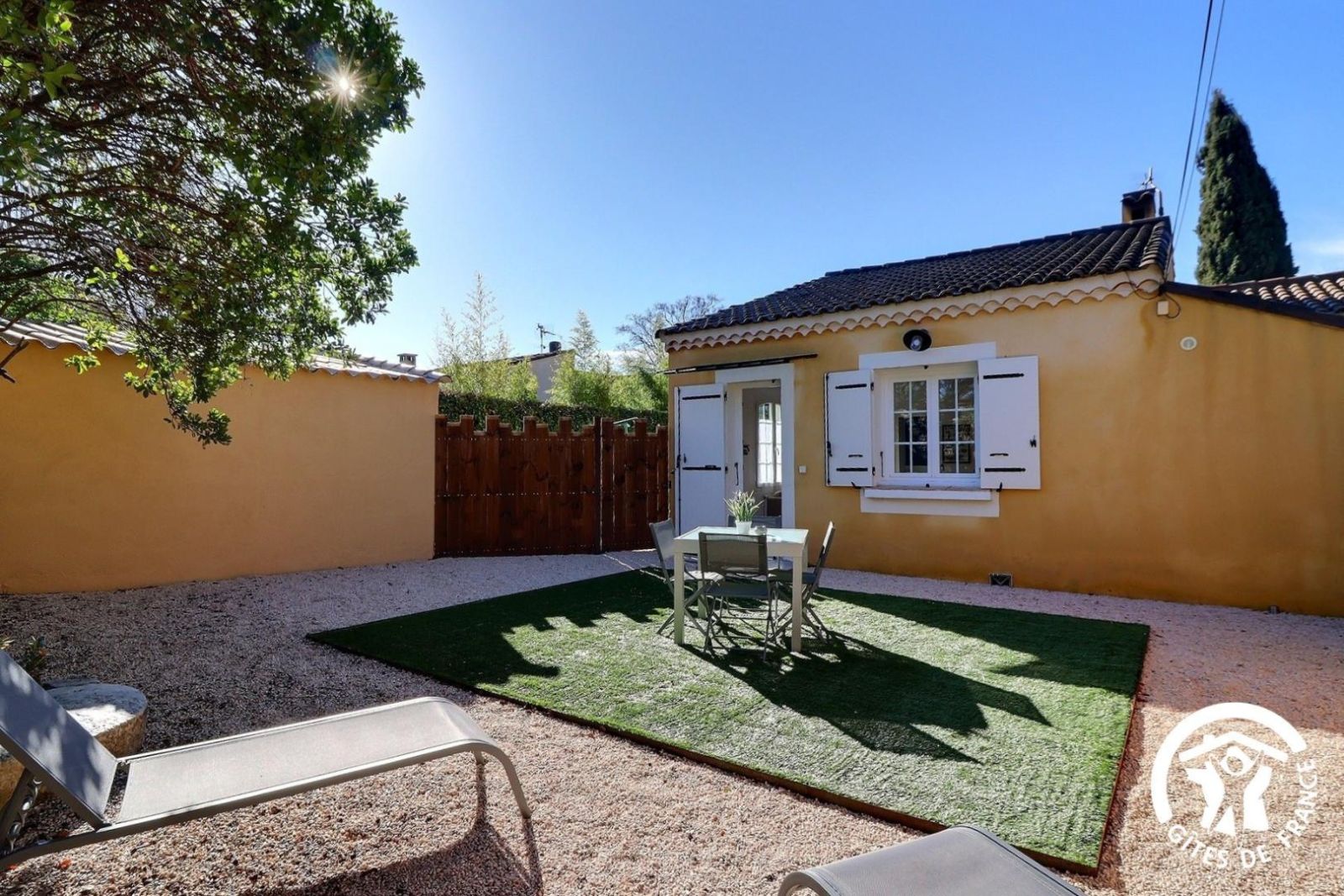 Petite terrasse couverte, grand espace gravillonné et jardin arboré privé de 1000 m² non clos, salon de jardin, barbecue, parking.