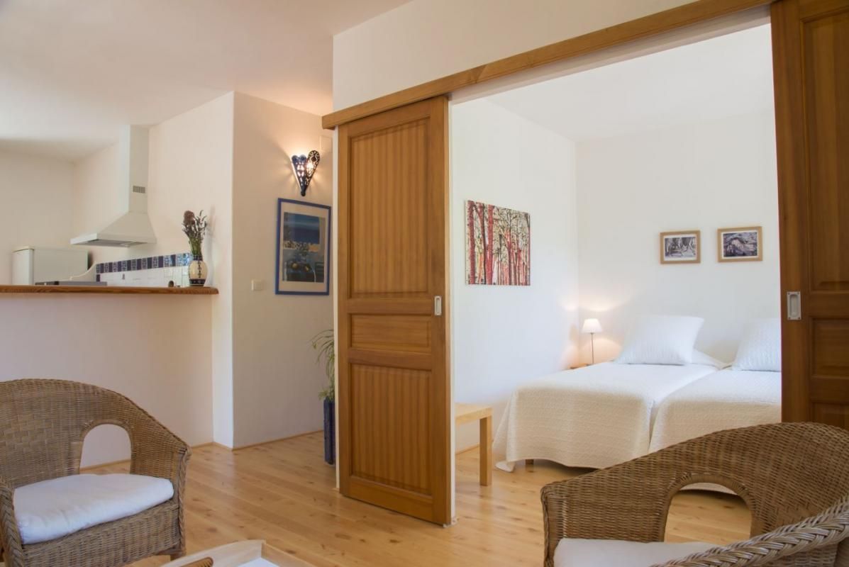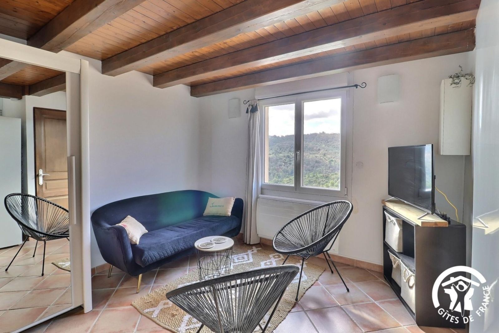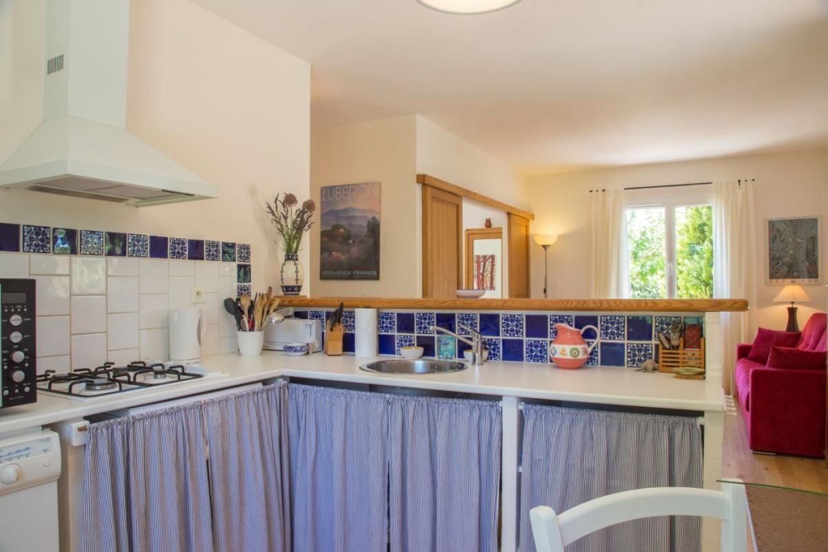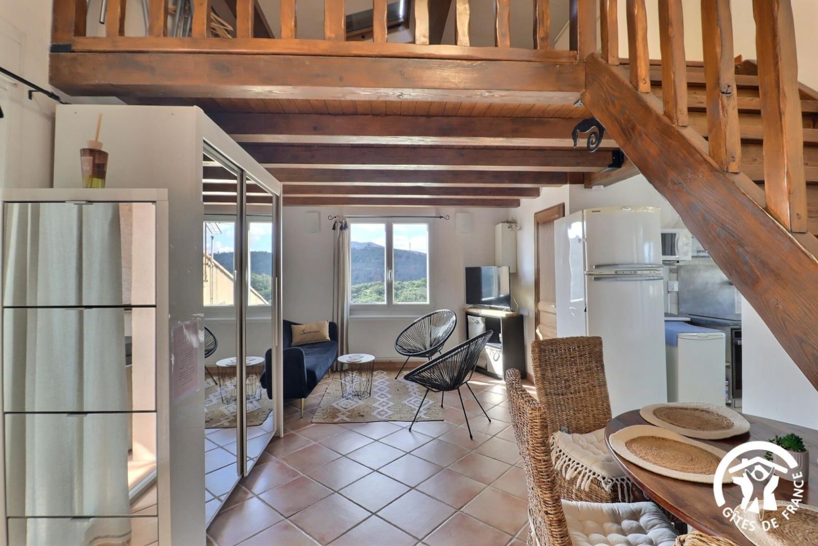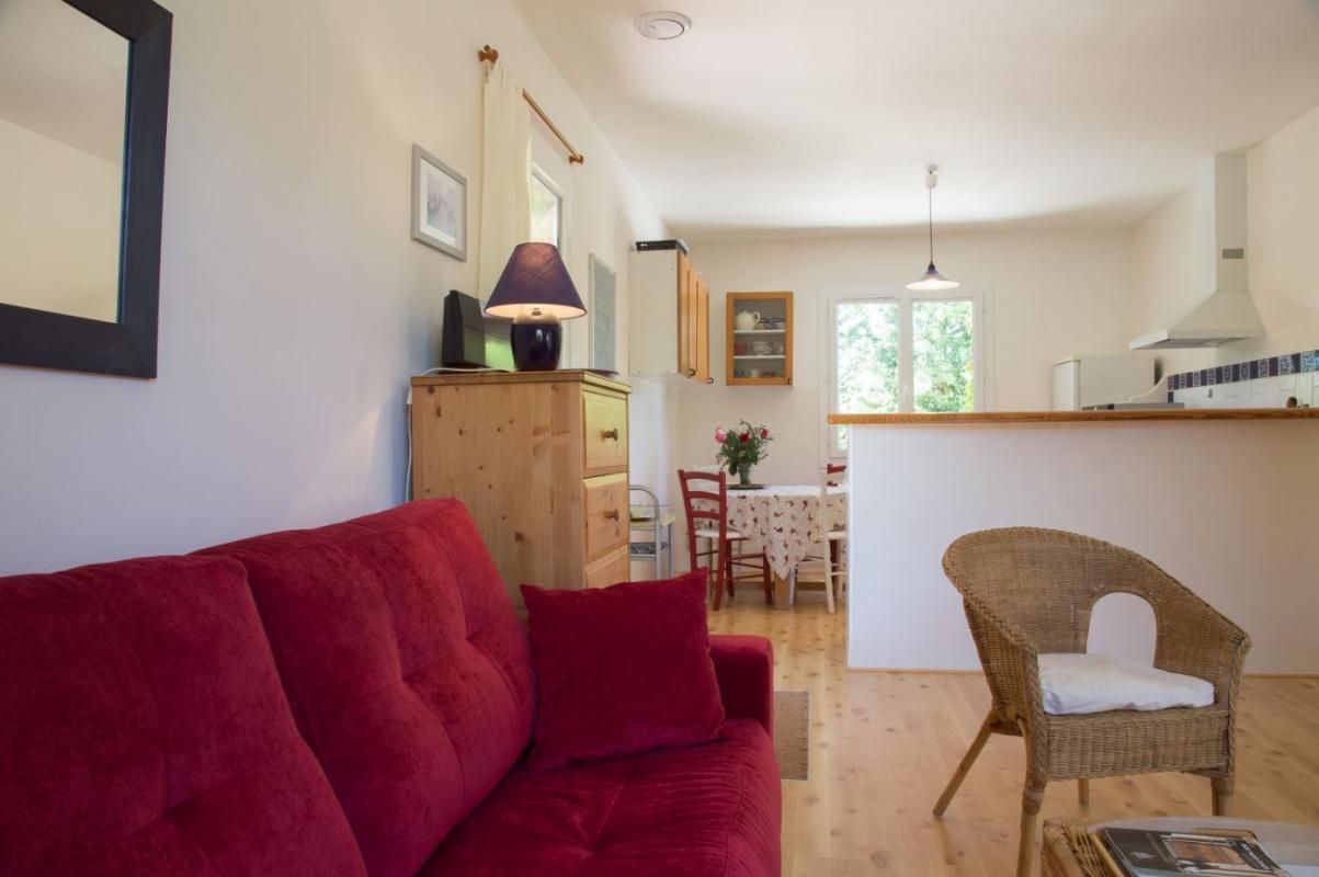 Cuisine américaine spacieuse et fonctionnelle, séjour confortable et chaleureux (convertible 2 personnes, TV, hi-fi) attenant à la chambre, lumineuse (2 lits 90 x 200 cm). Grande salle de bain aux tons de bois et d'ardoise. Chauffage électrique. Draps et torchons fournis.
