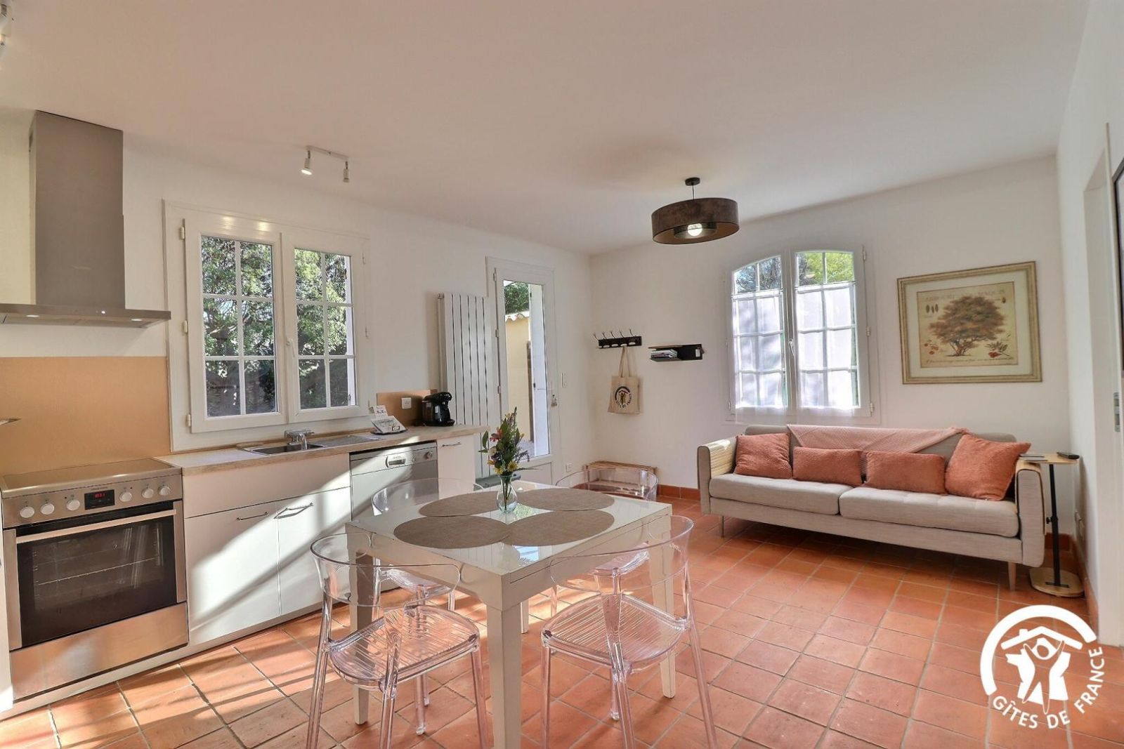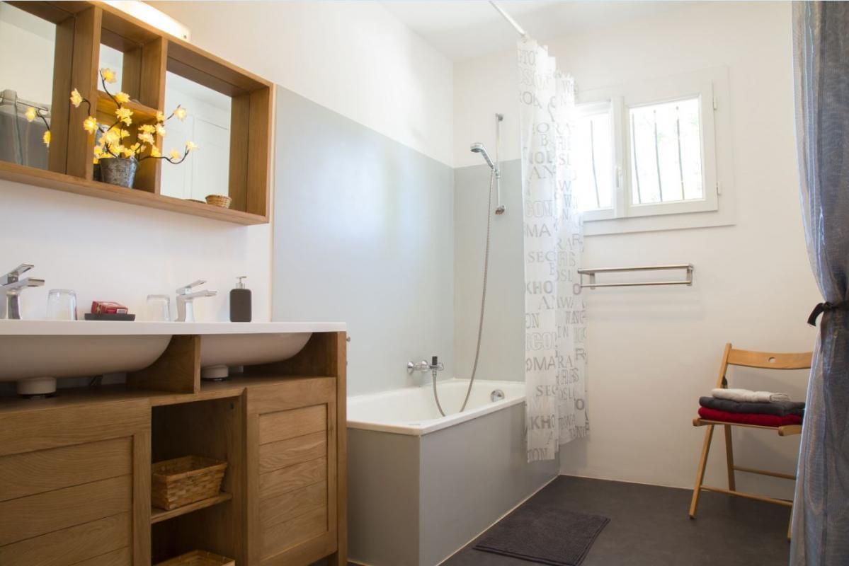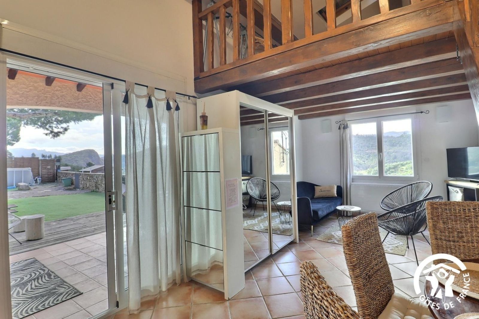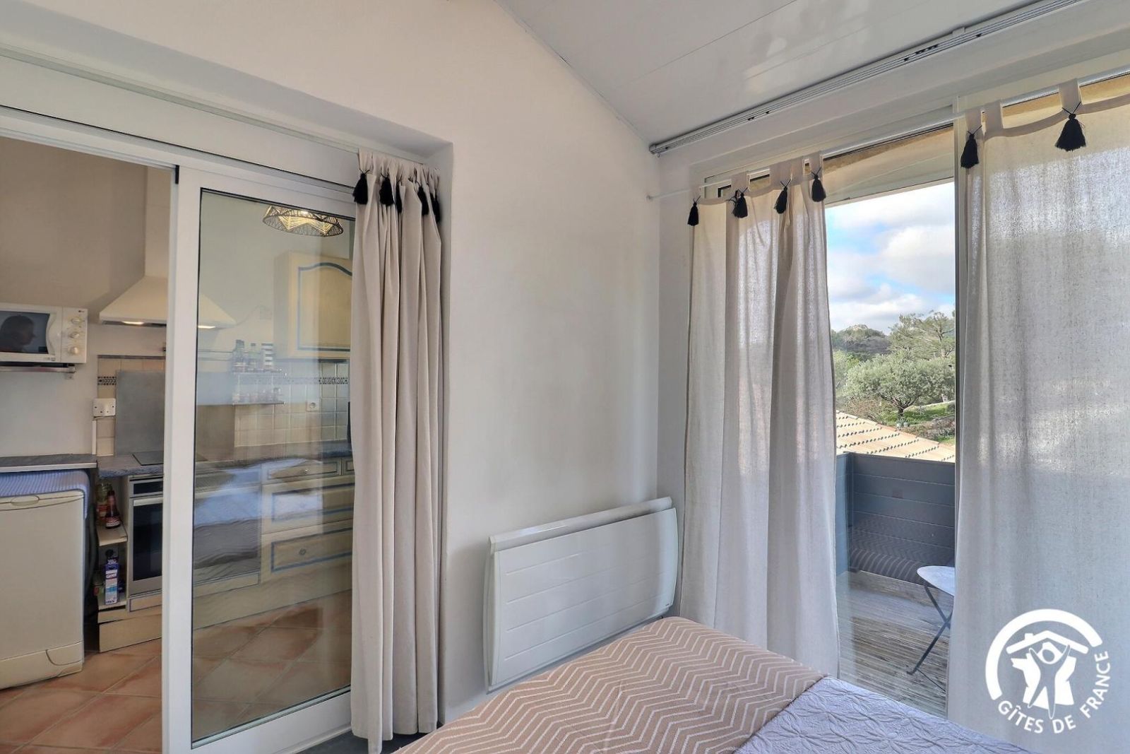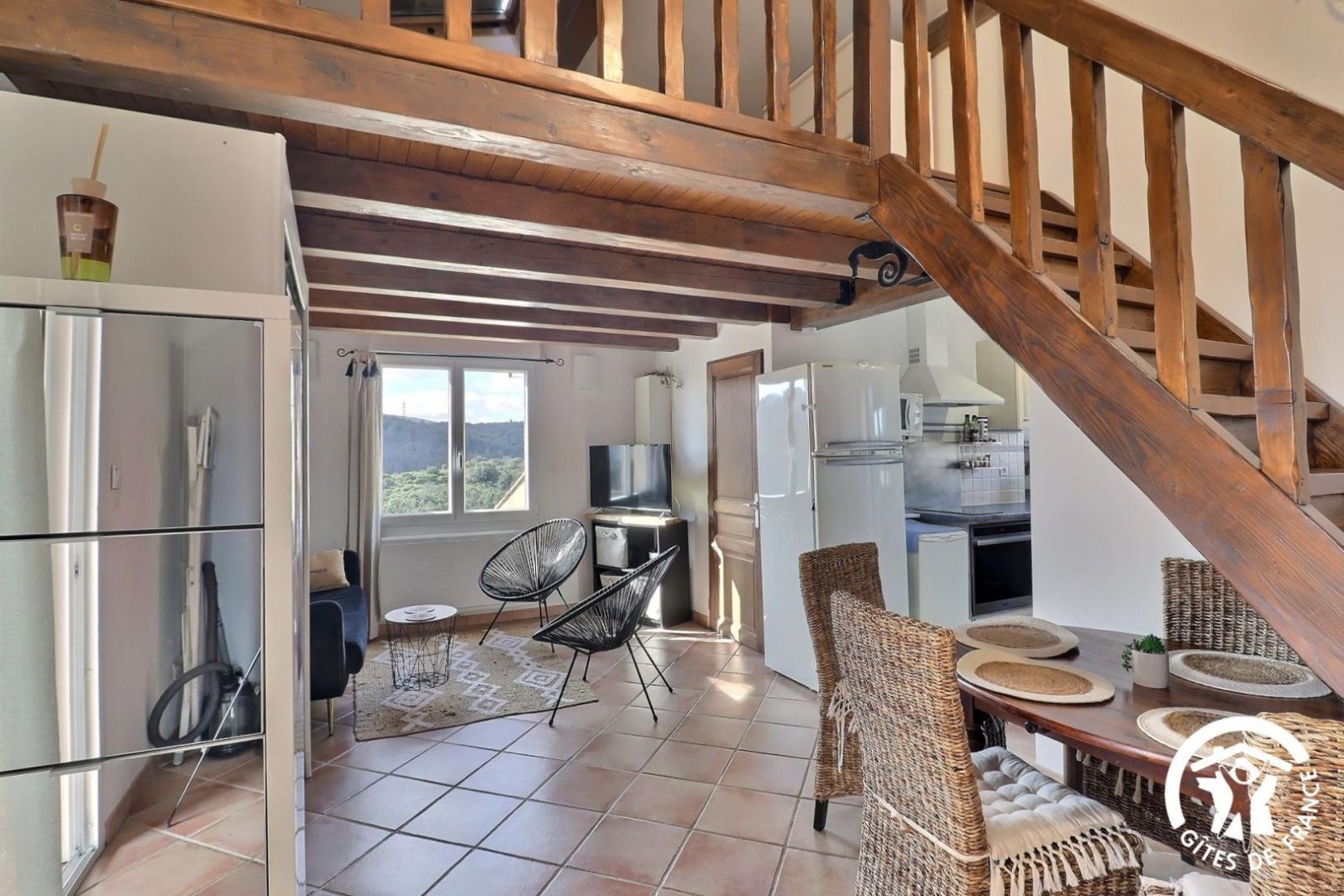 Cuisine américaine spacieuse et fonctionnelle, séjour confortable et chaleureux (convertible 2 personnes, TV, hi-fi) attenant à la chambre, lumineuse (2 lits 90 x 200 cm). Grande salle de bain aux tons de bois et d'ardoise. Chauffage électrique. Draps et torchons fournis.