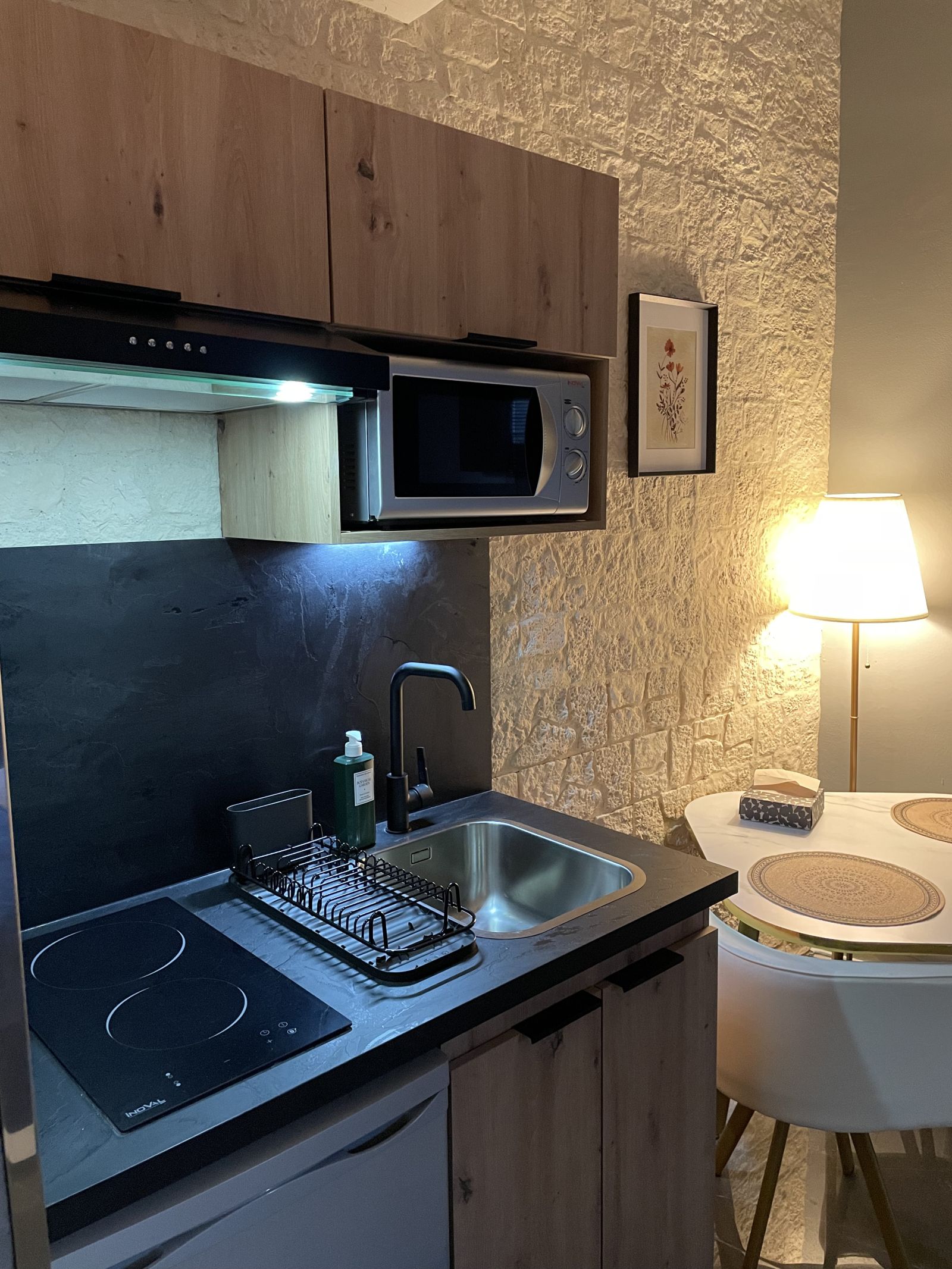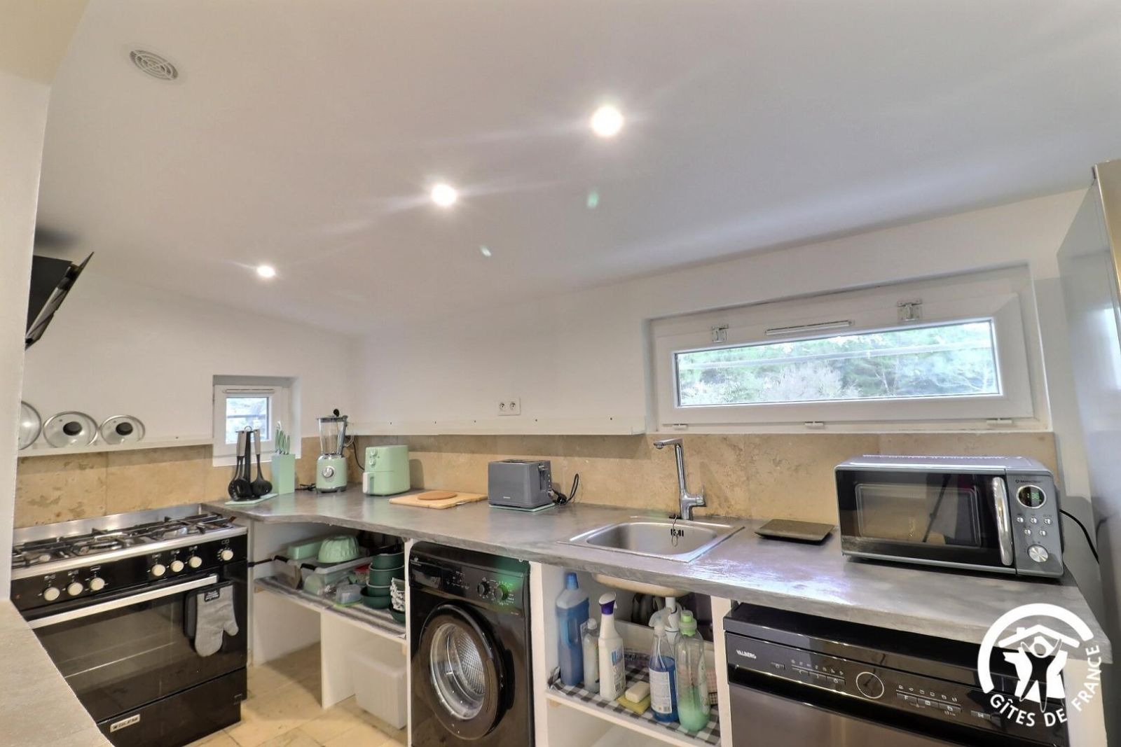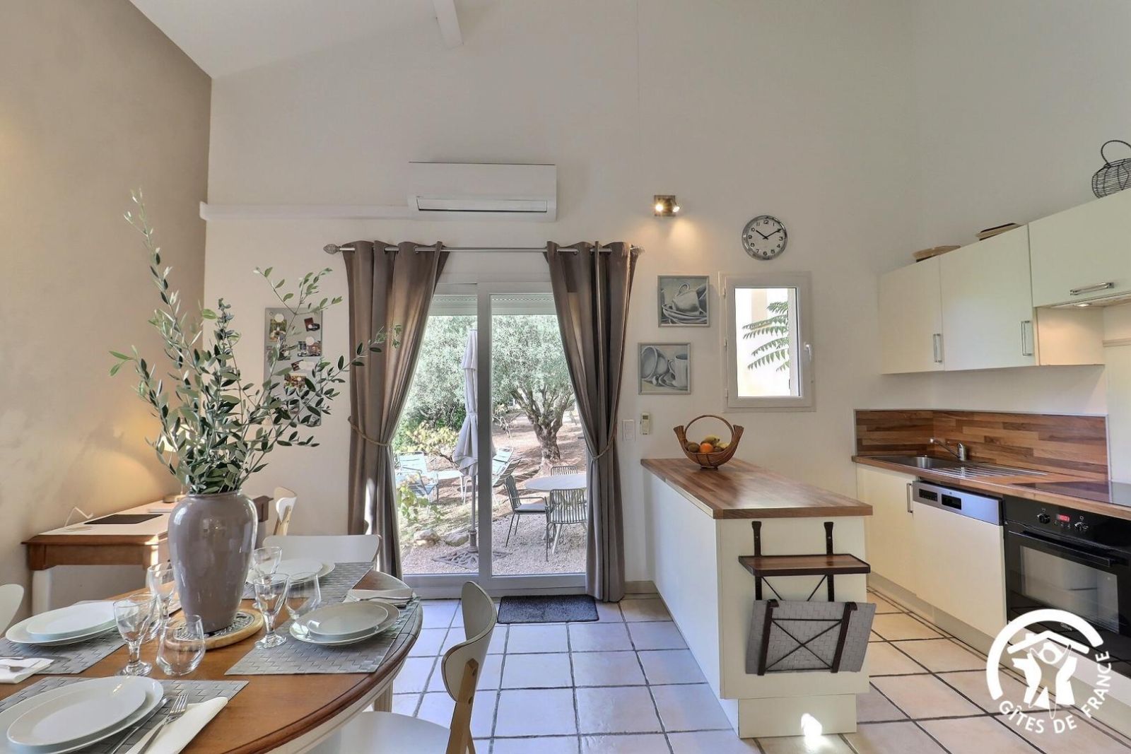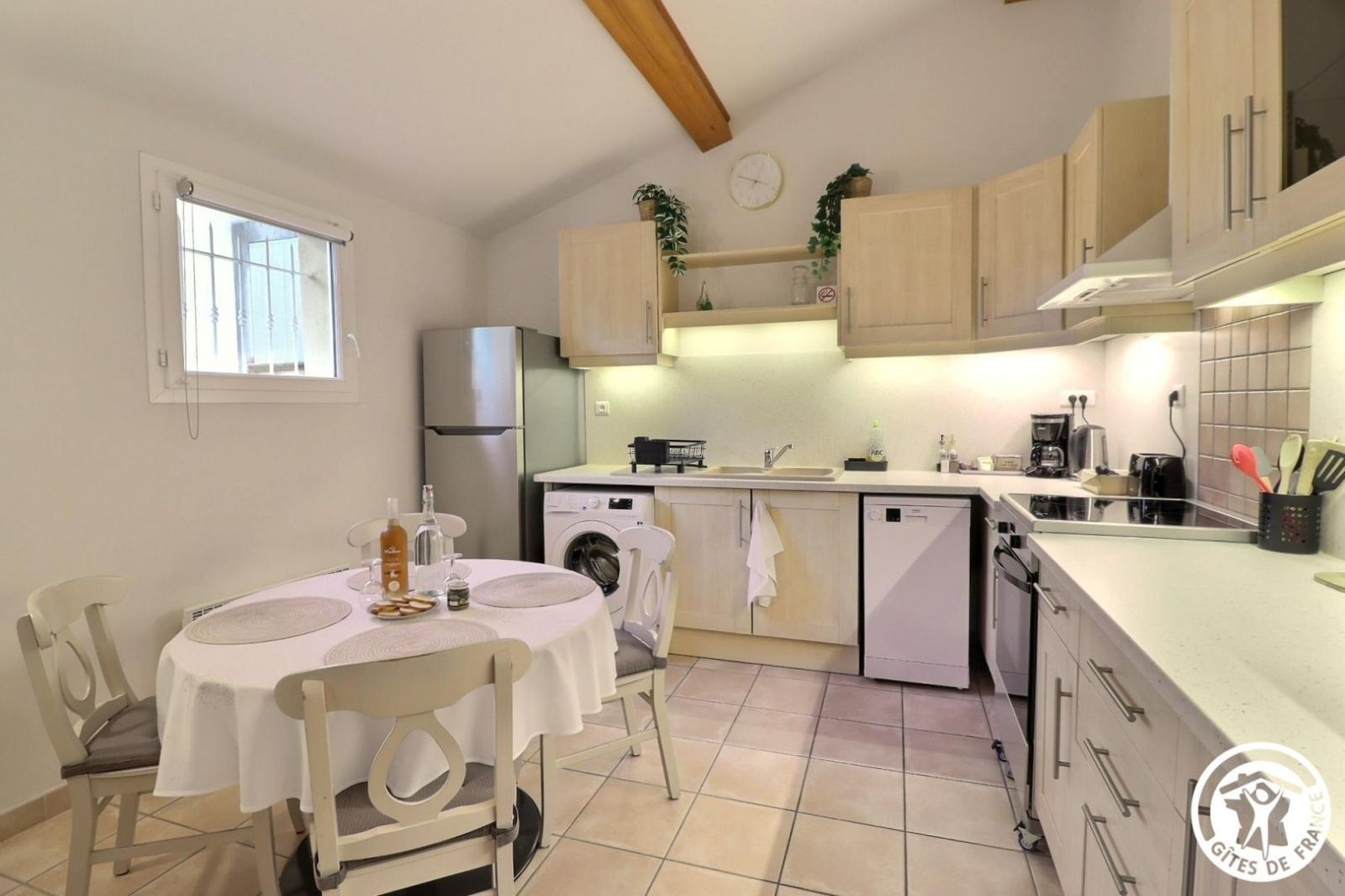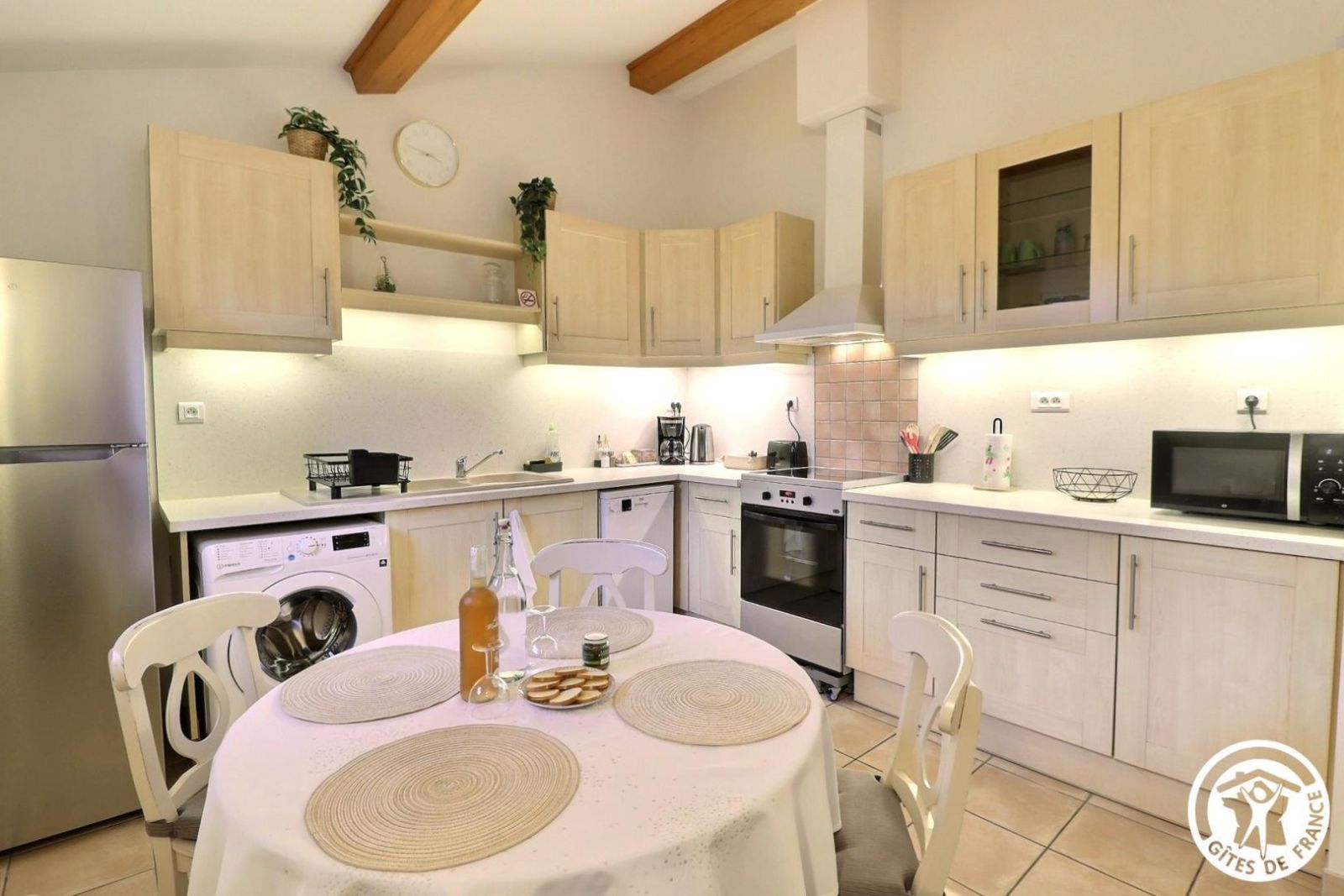 - Une cuisine équipée avec four, plaque de cuisson 3 feux, grille-pain, bouilloire, lave-vaisselle, réfrigérateur congélateur, table et chaises