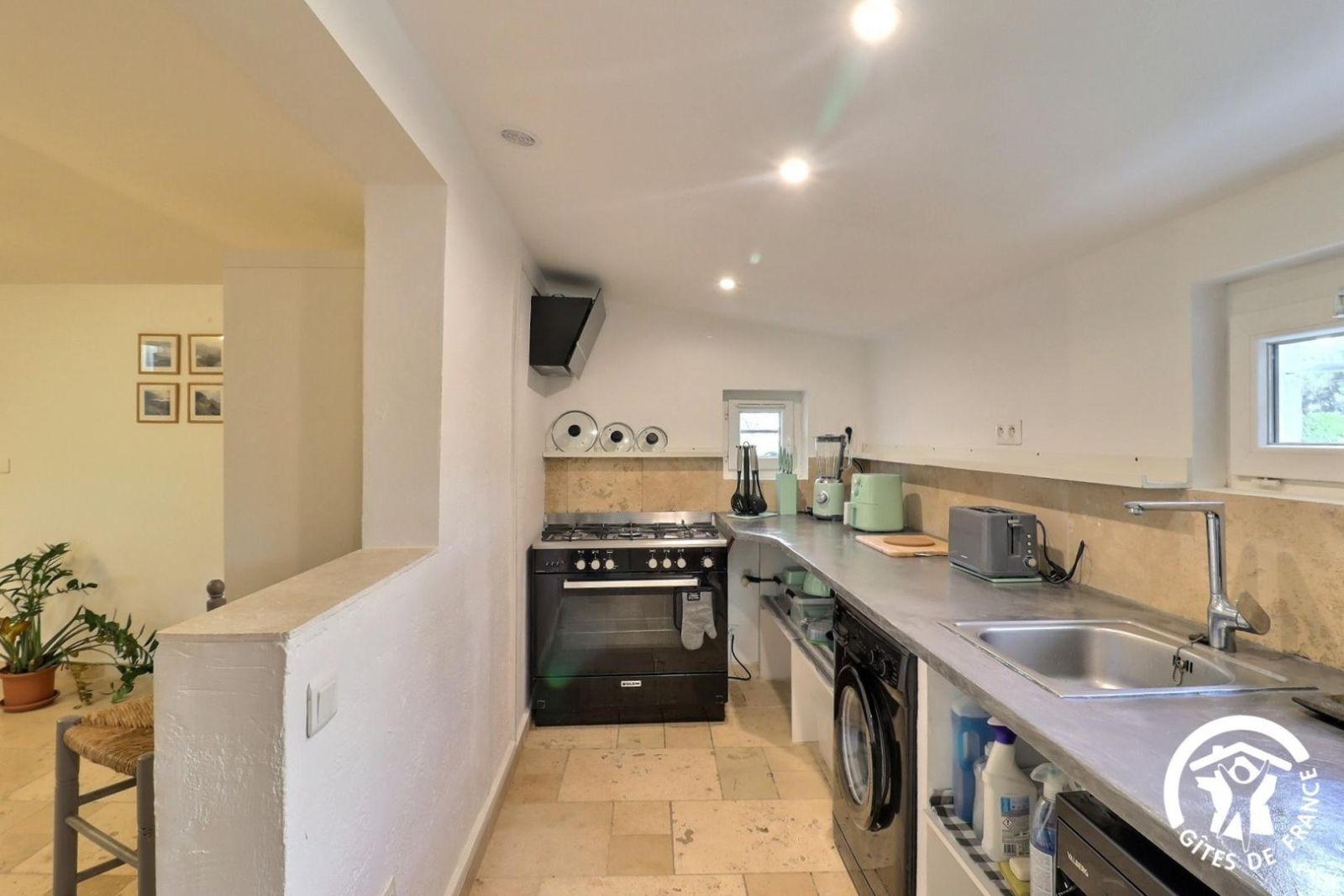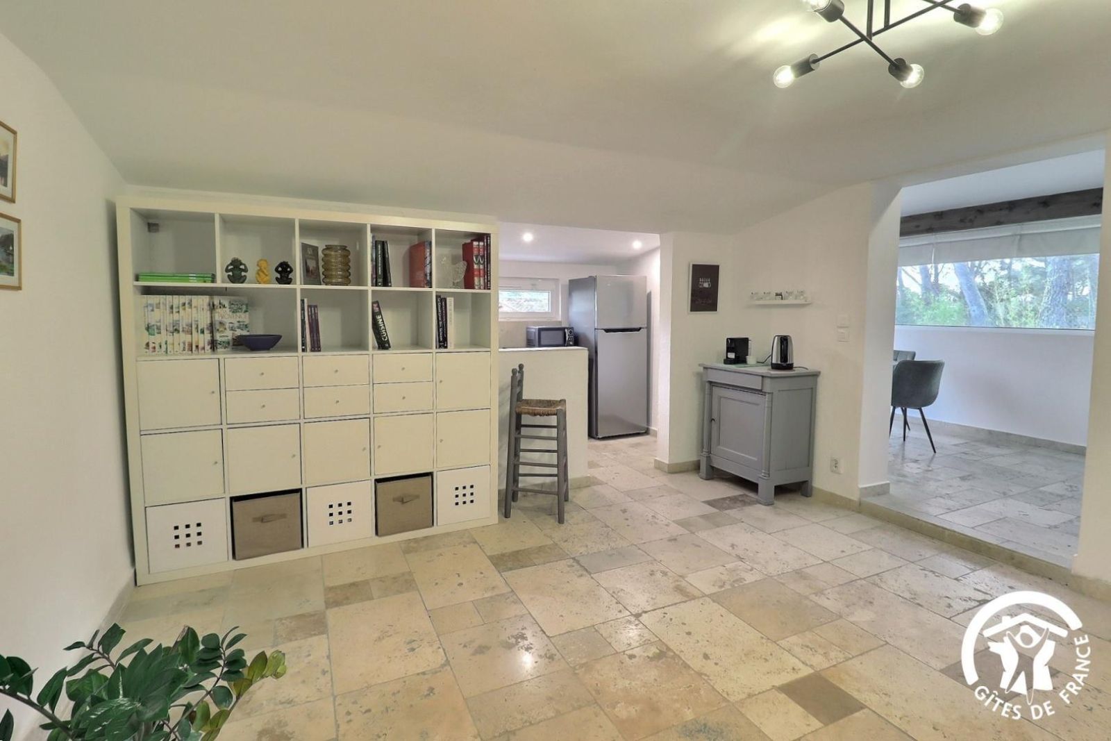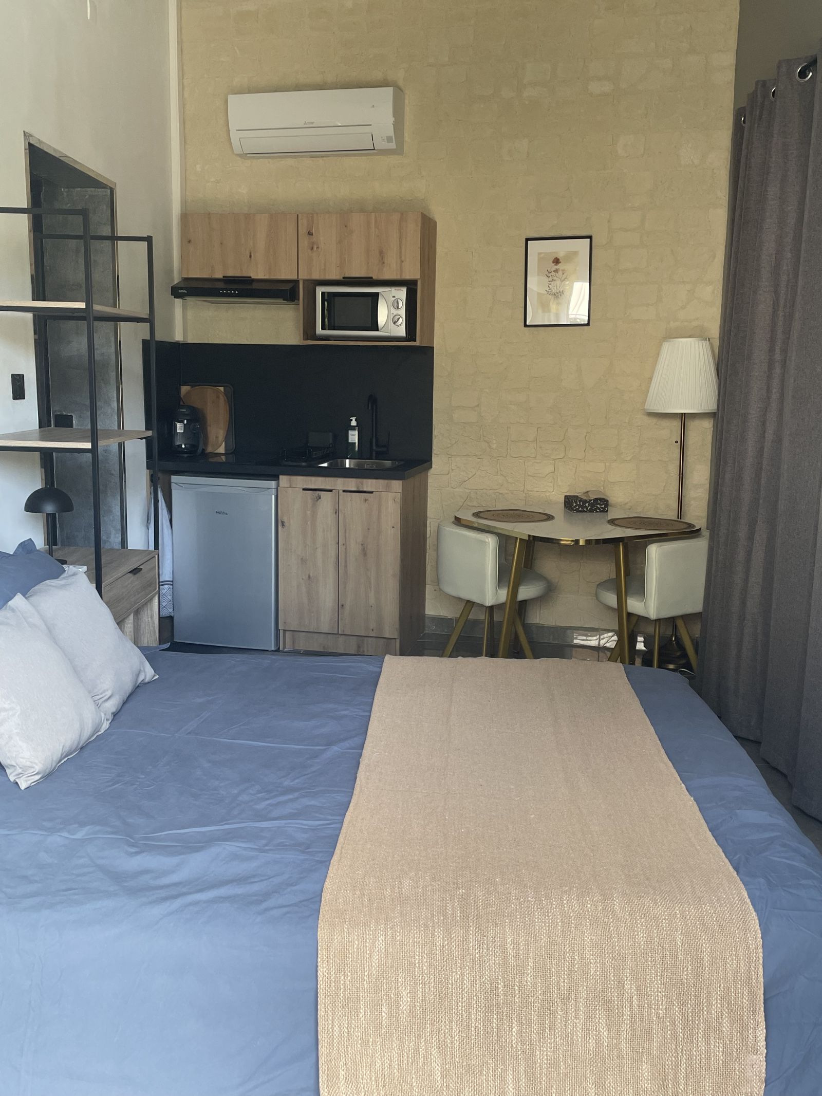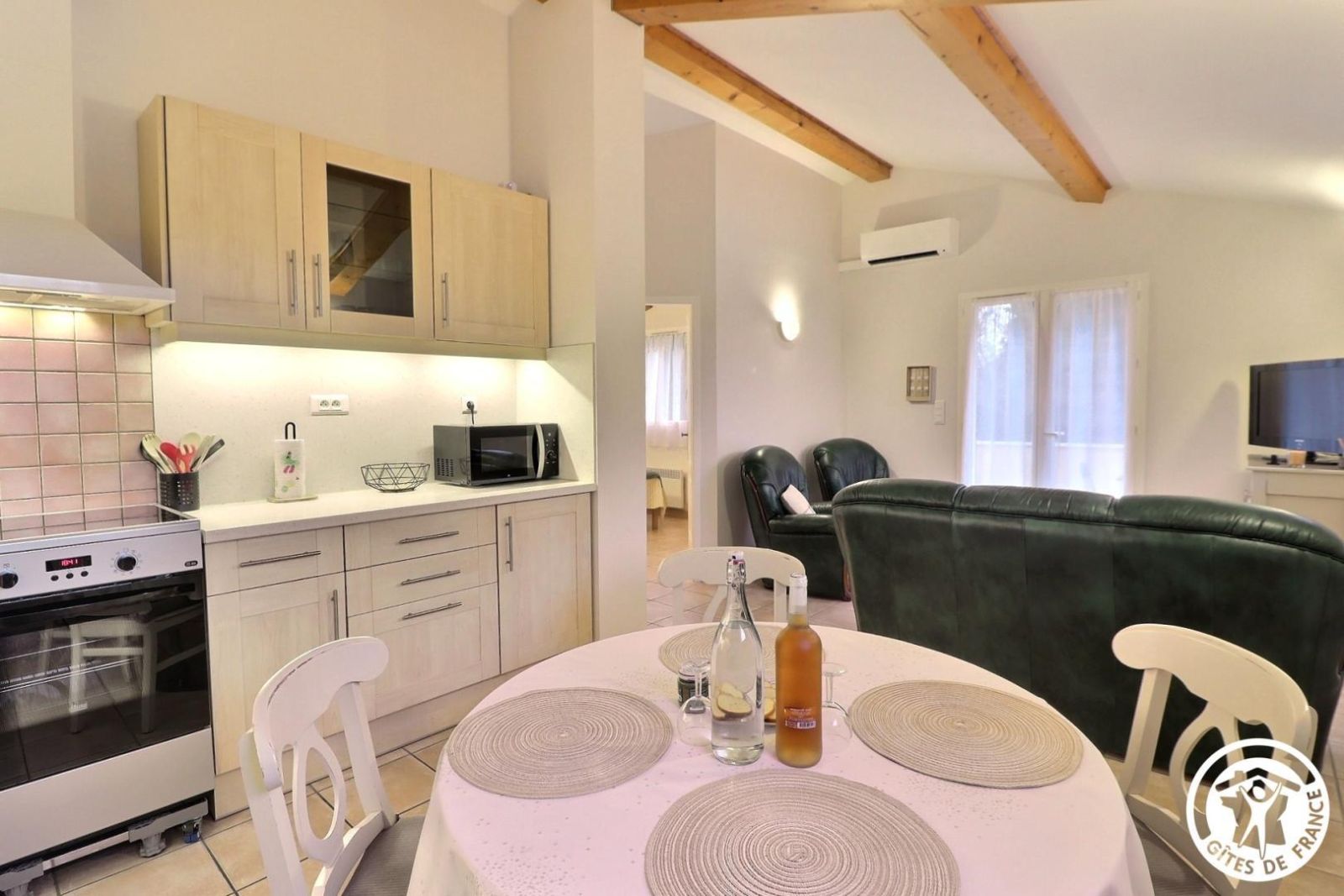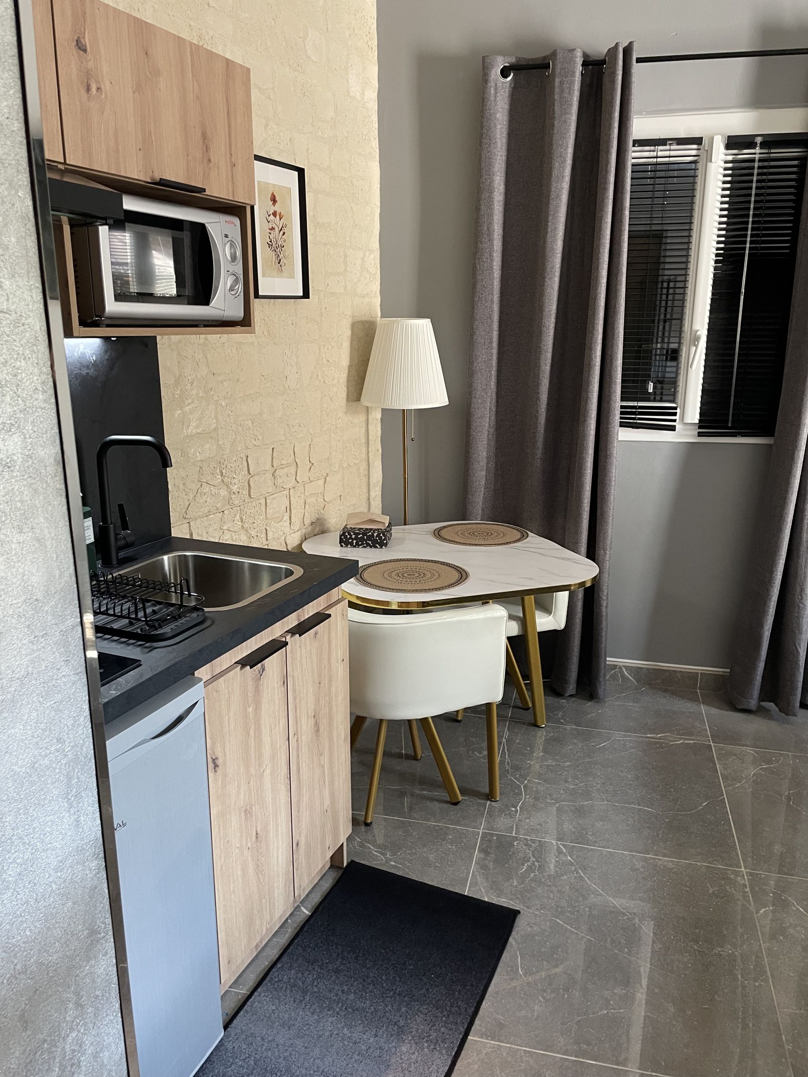 - Une cuisine équipée avec four, plaque de cuisson 3 feux, grille-pain, bouilloire, lave-vaisselle, réfrigérateur congélateur, table et chaises