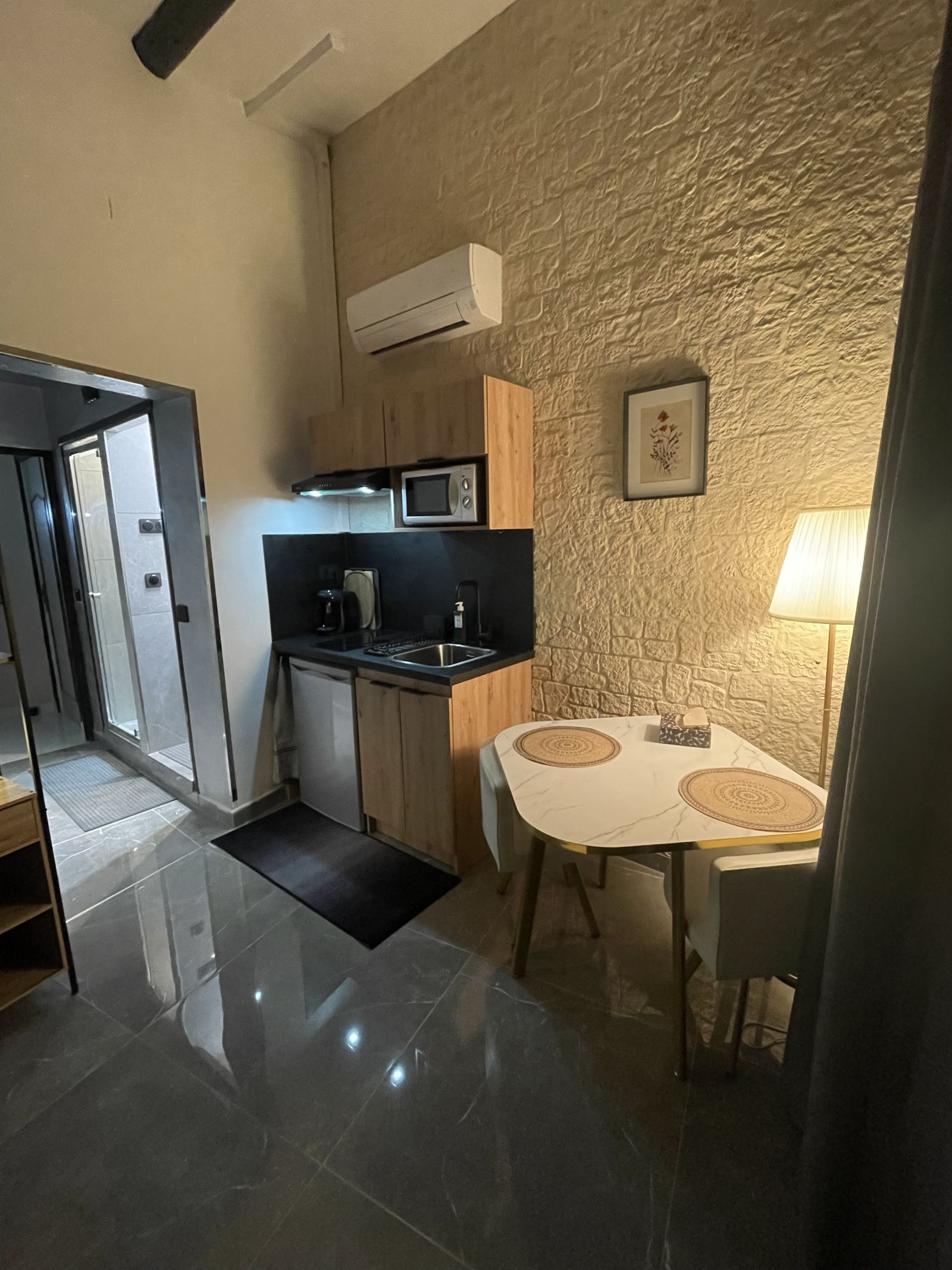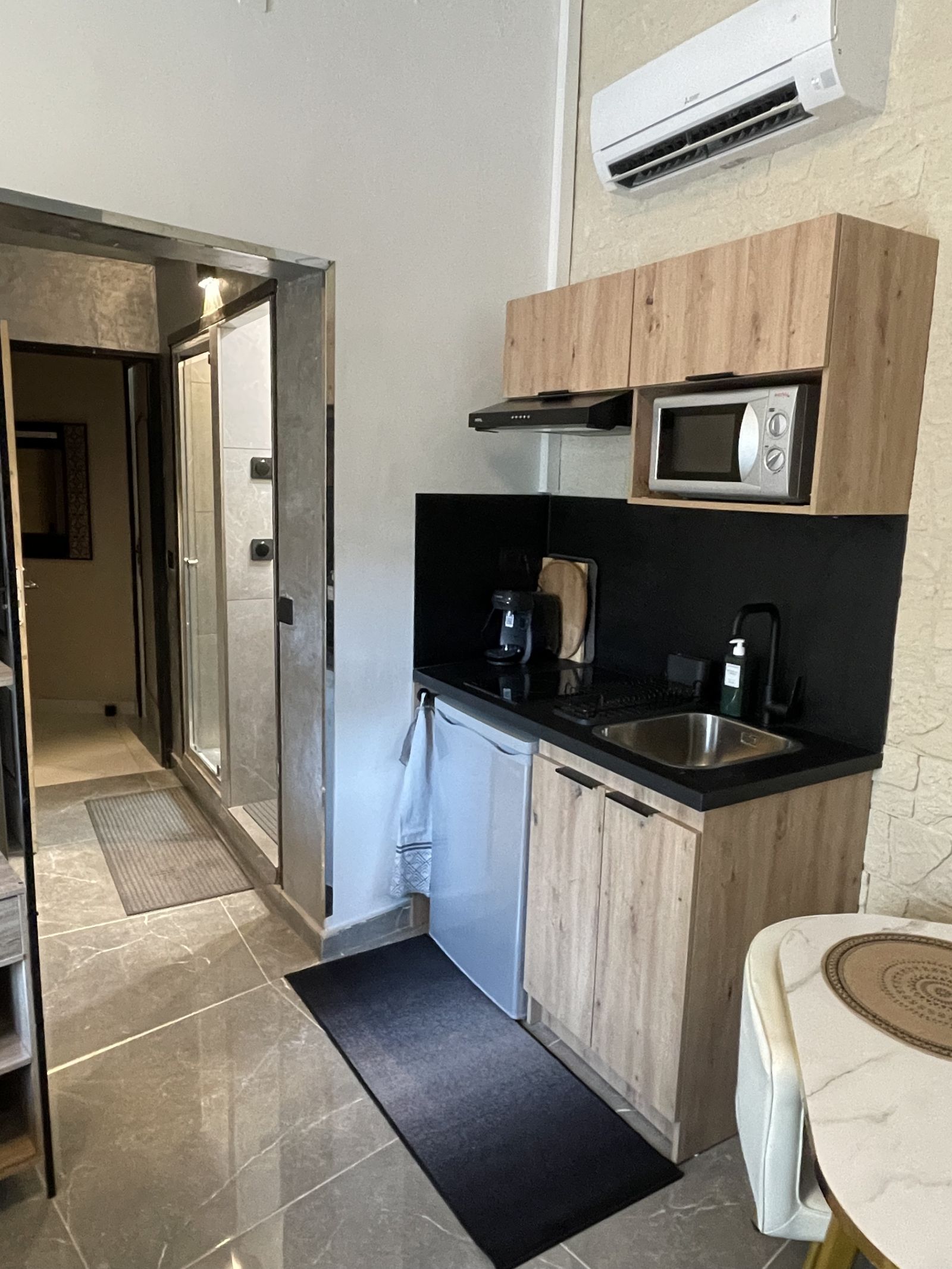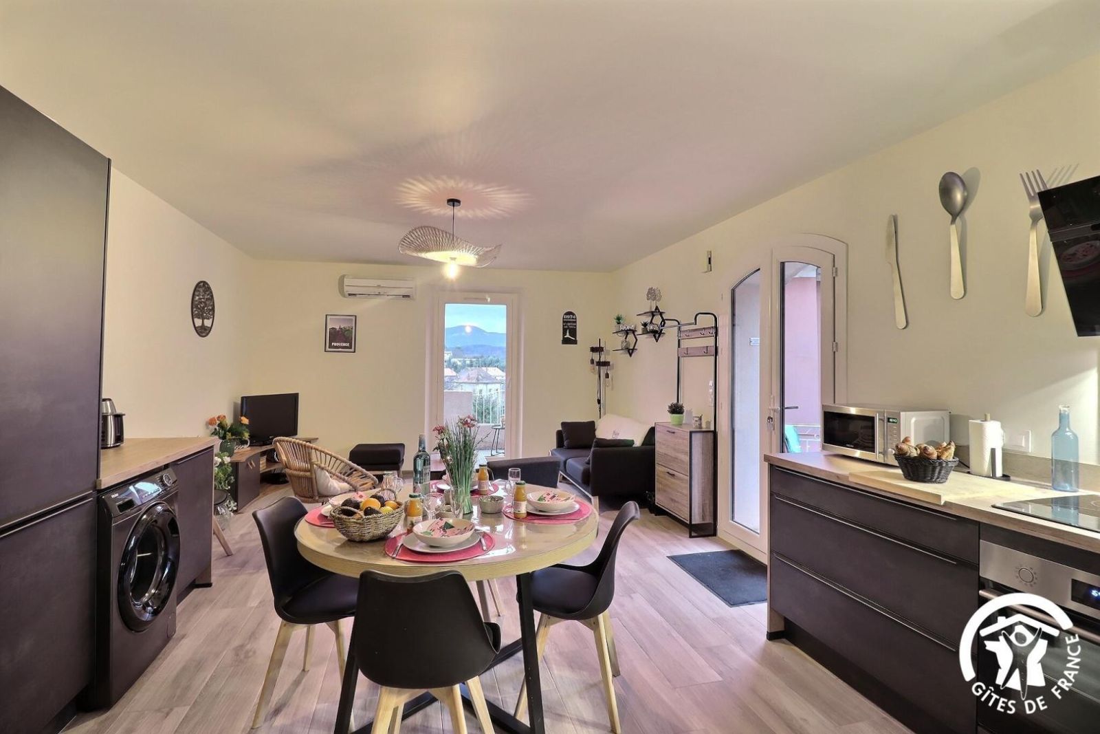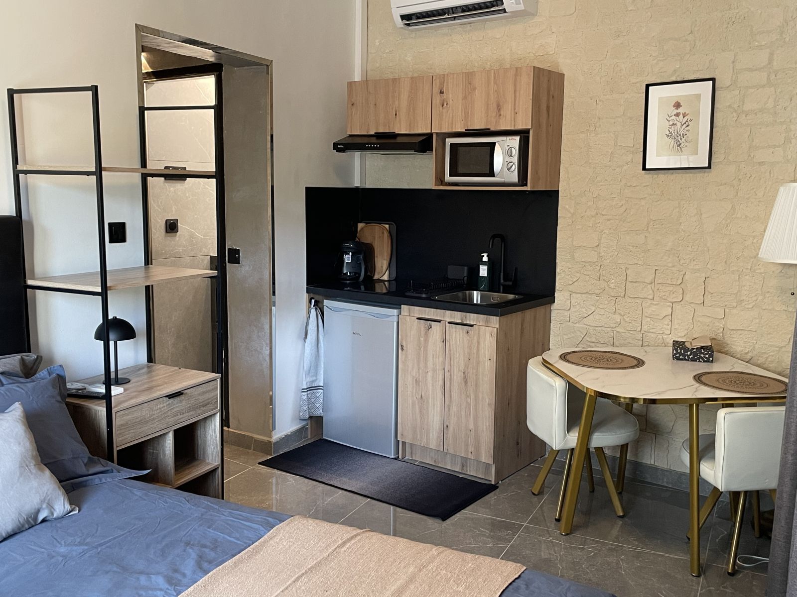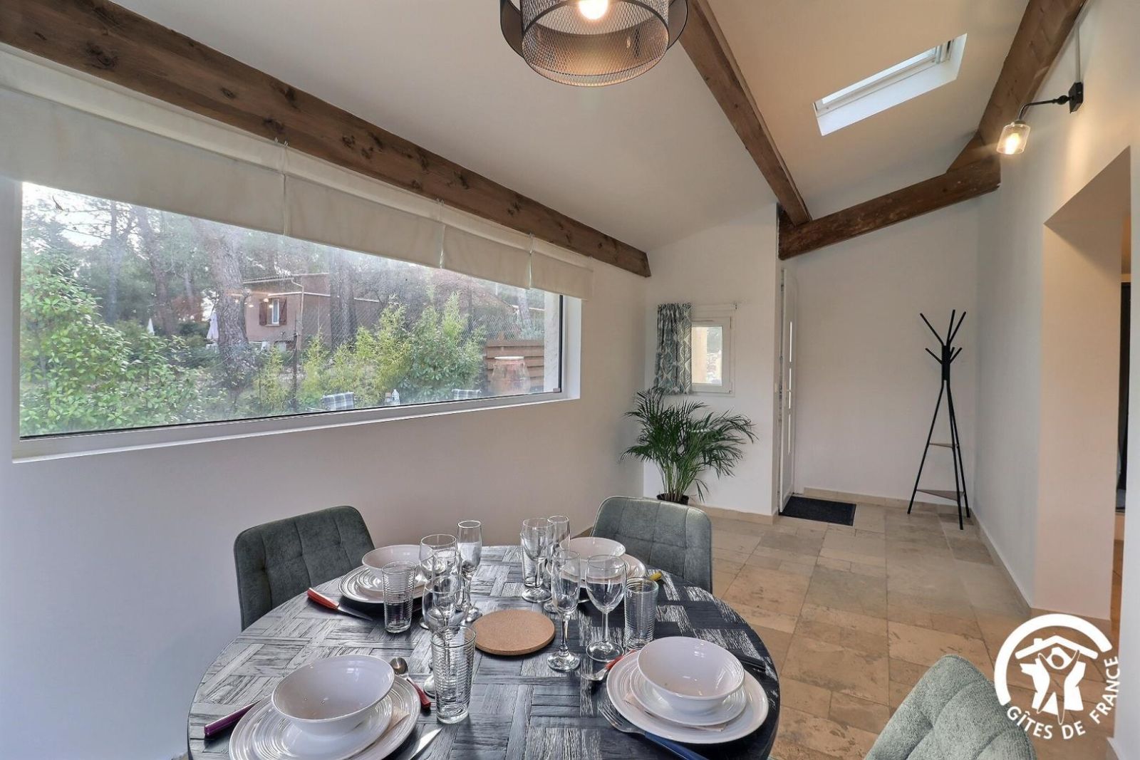 - Une cuisine équipée avec four, plaque de cuisson 3 feux, grille-pain, bouilloire, lave-vaisselle, réfrigérateur congélateur, table et chaises