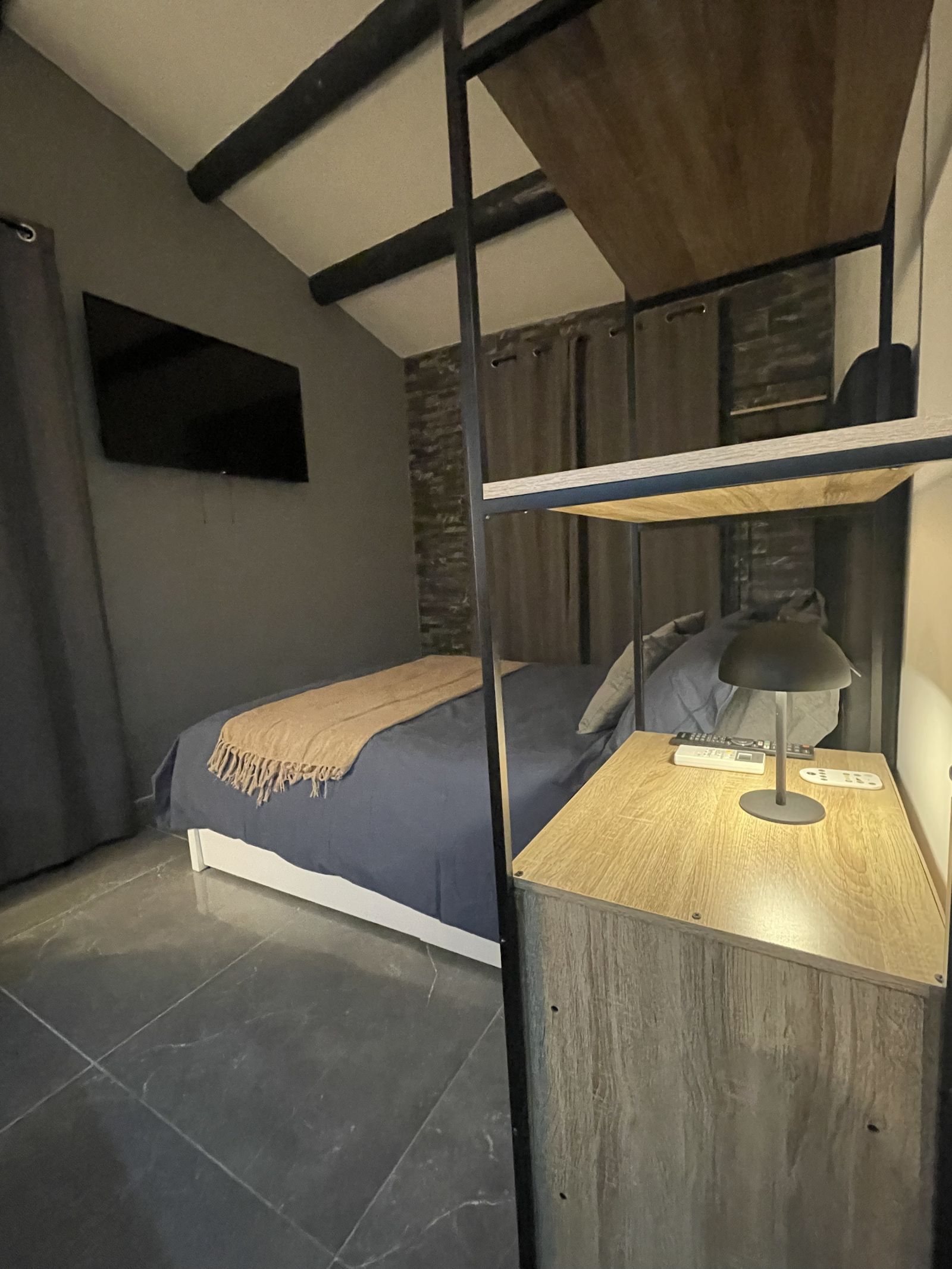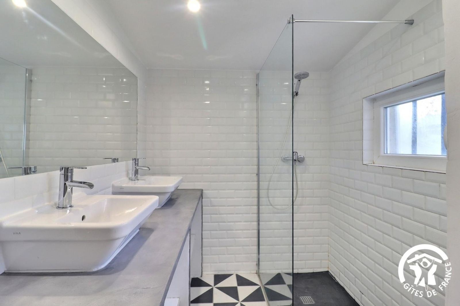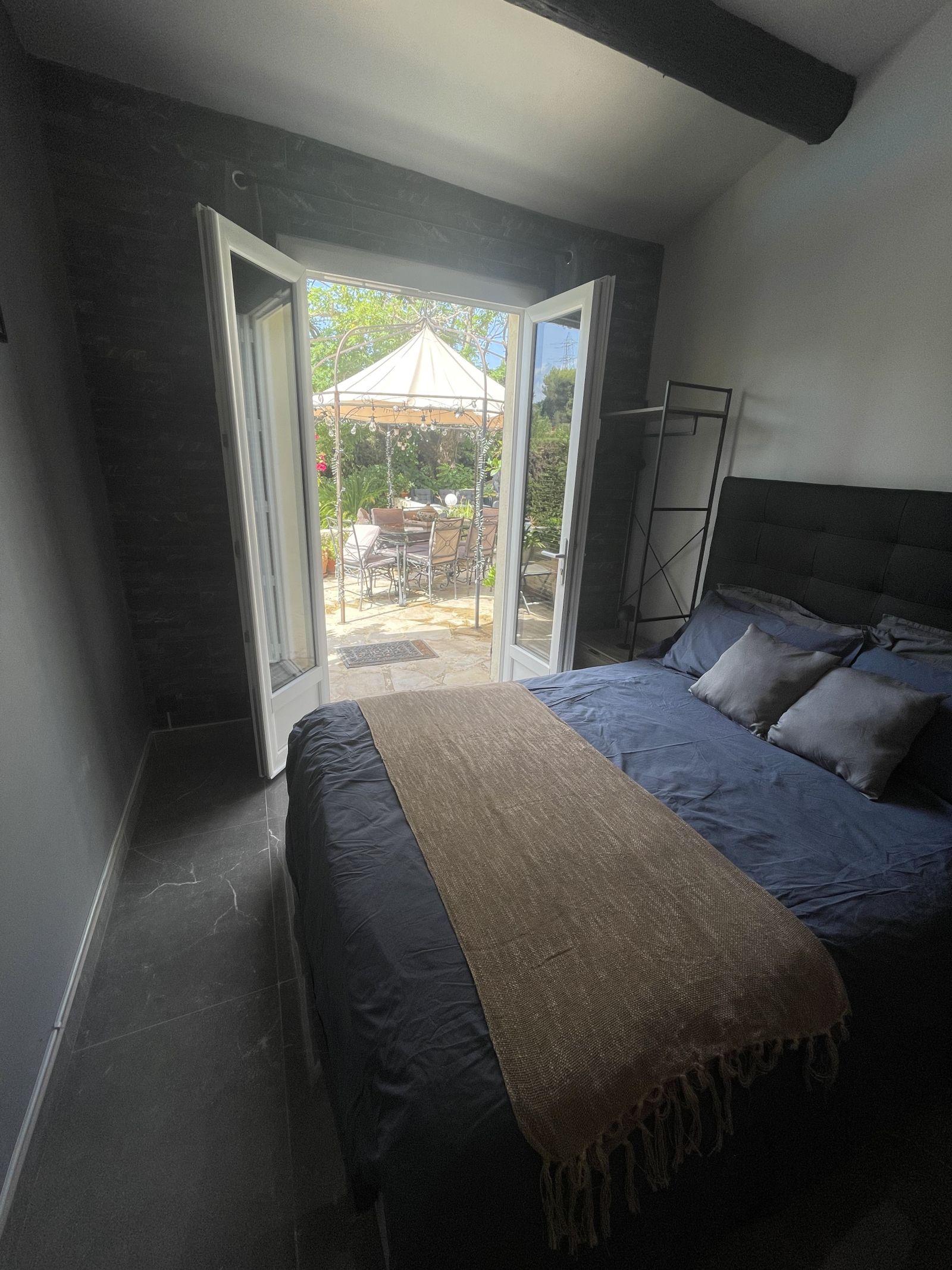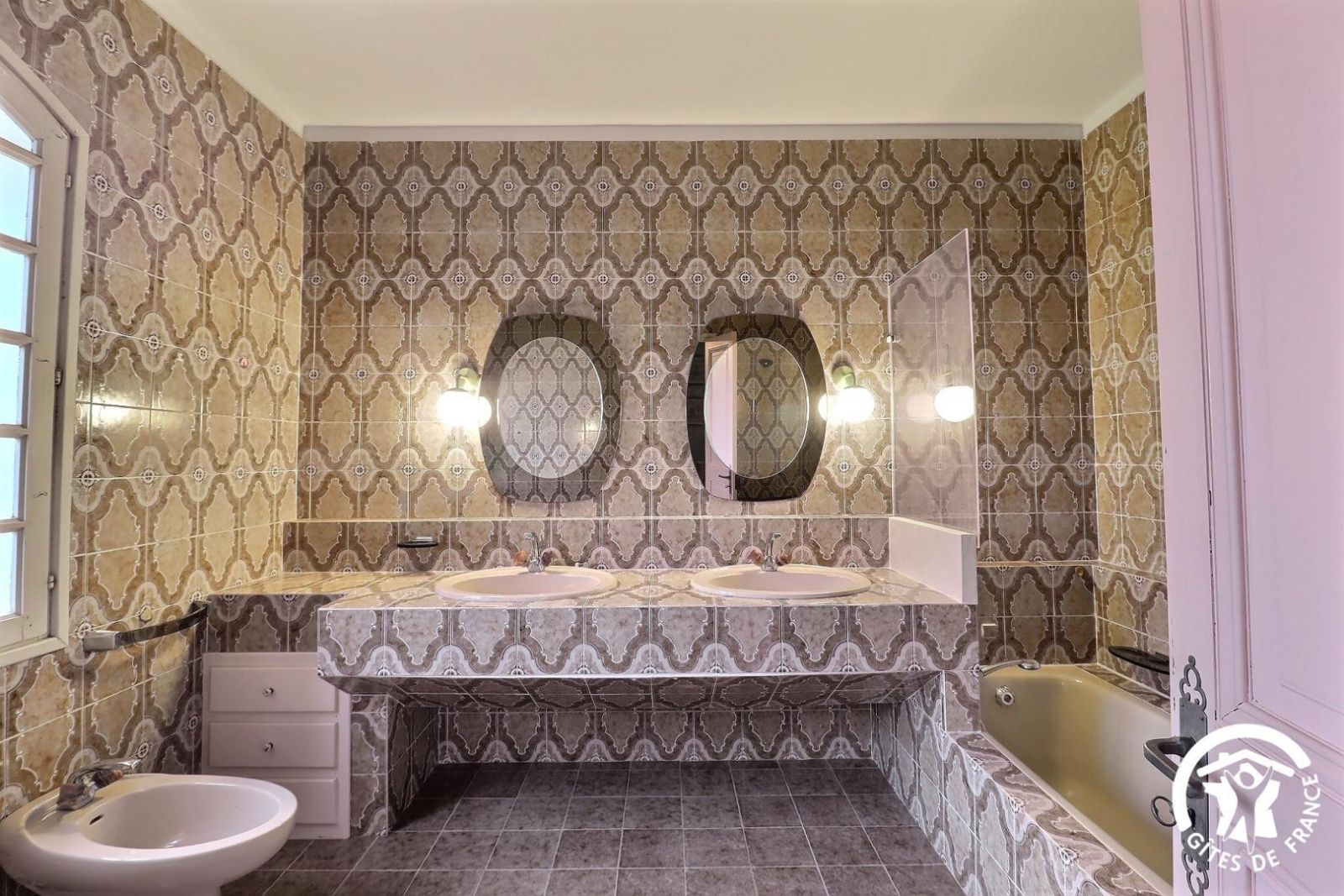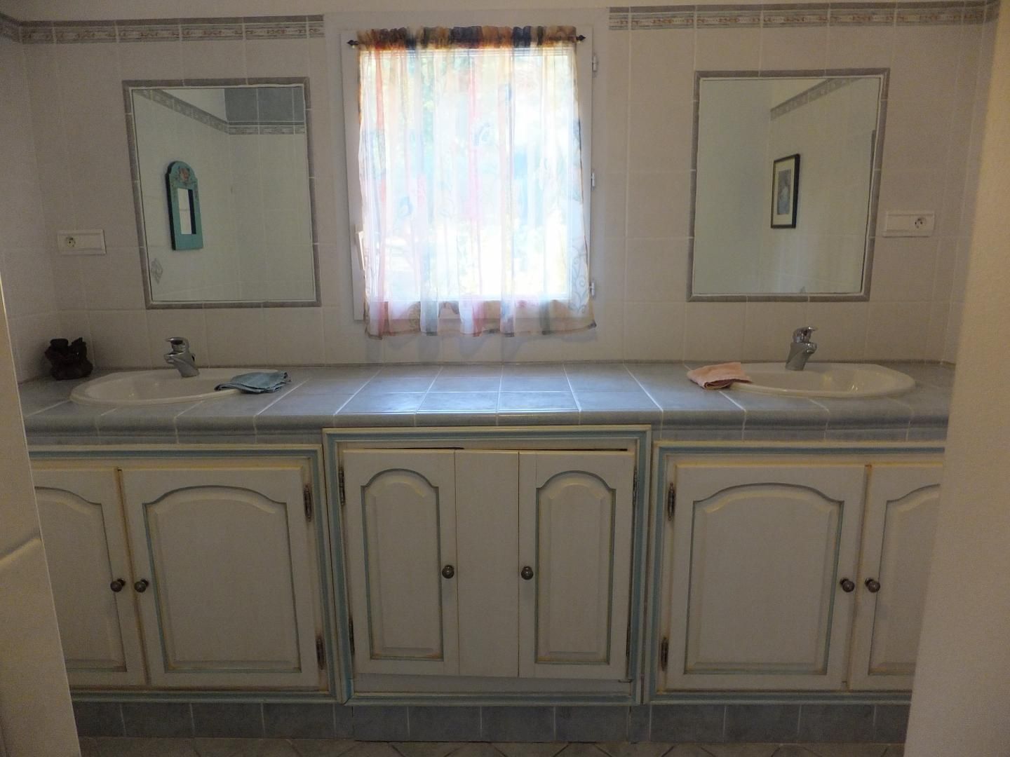 - Une grande chambre avec un lit 140x190, placard, lit bébé et salle d'eau attenante avec baignoire, meuble double vasque.