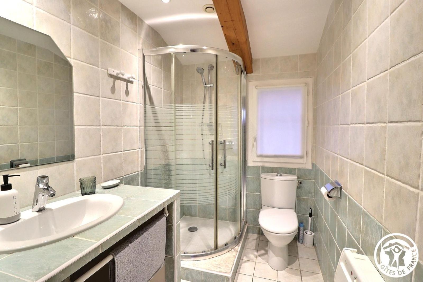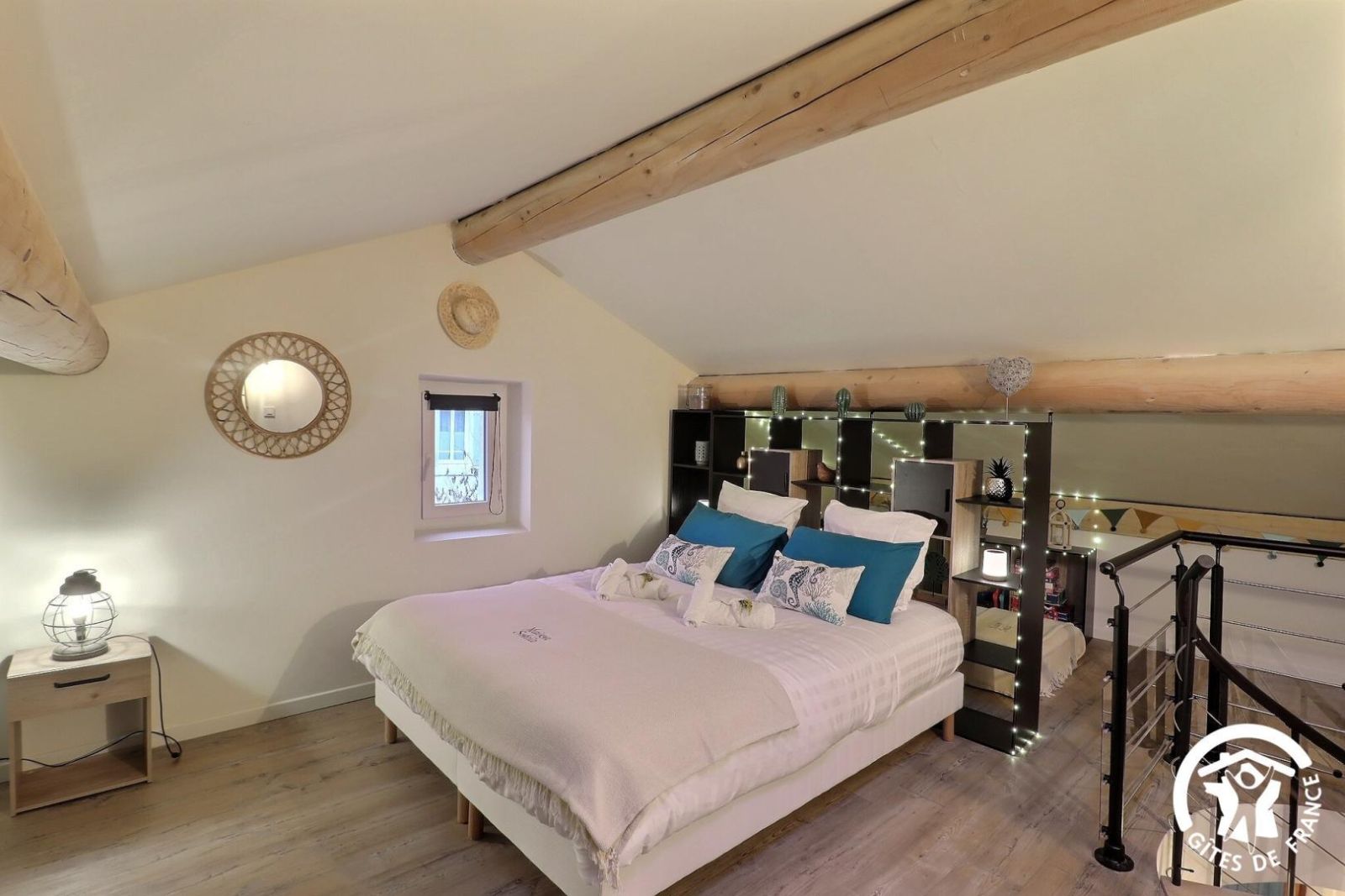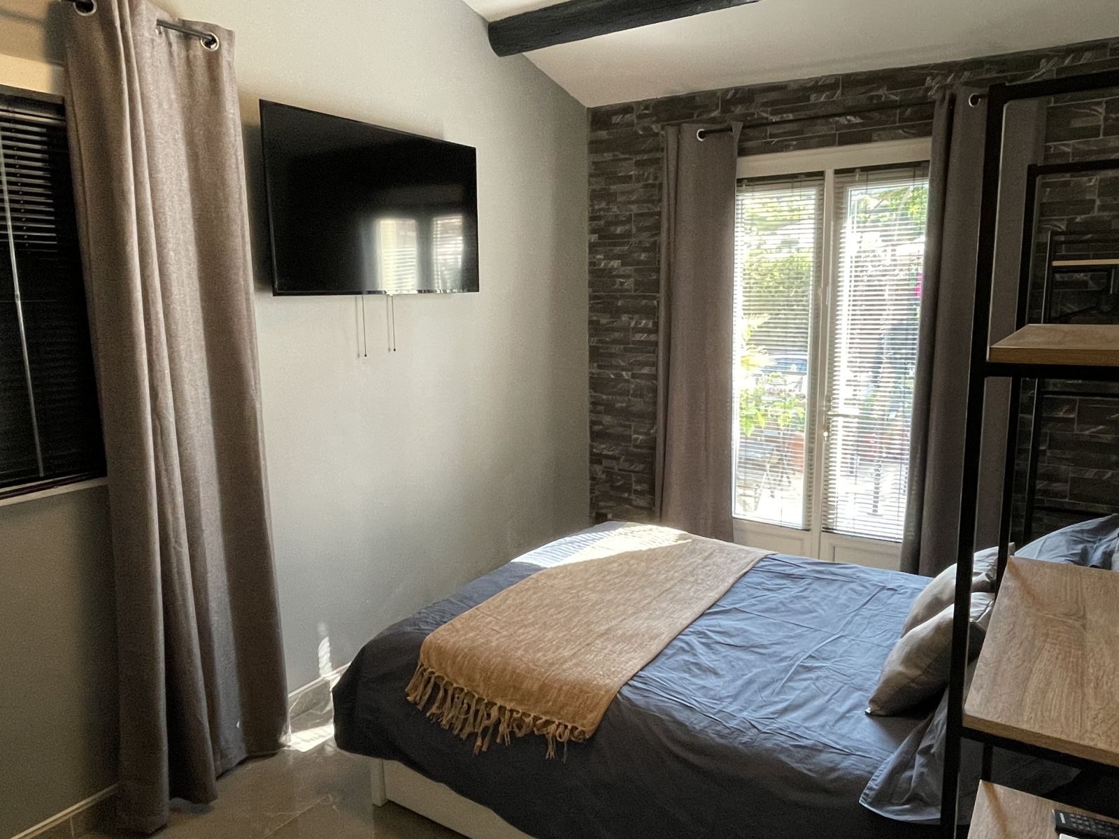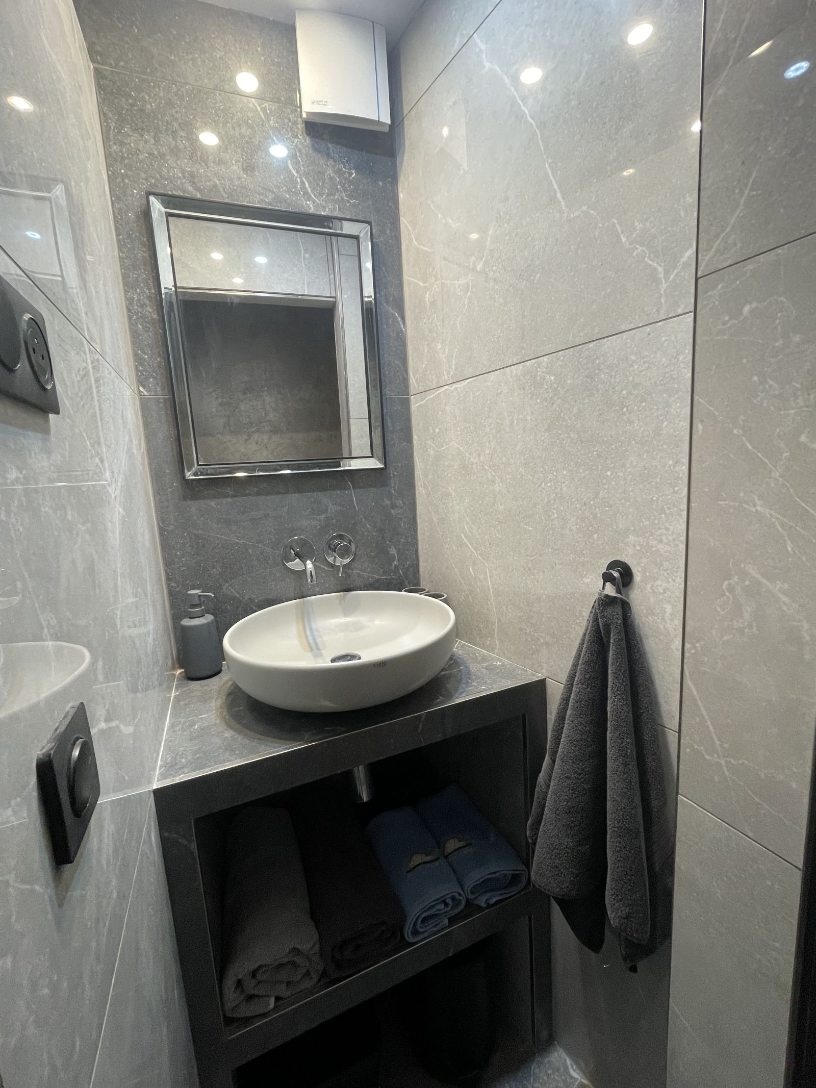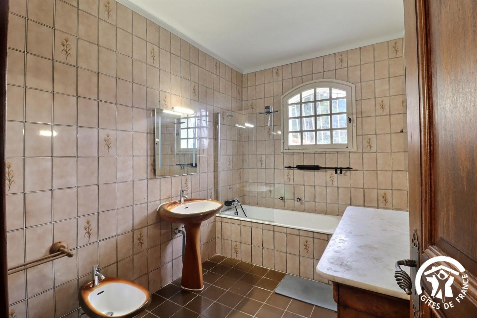 - Une grande chambre avec un lit 140x190, placard, lit bébé et salle d'eau attenante avec baignoire, meuble double vasque.