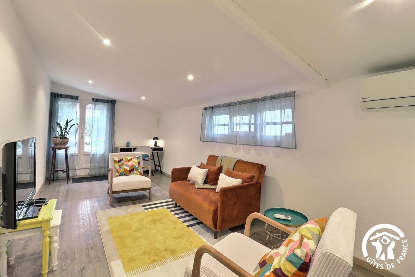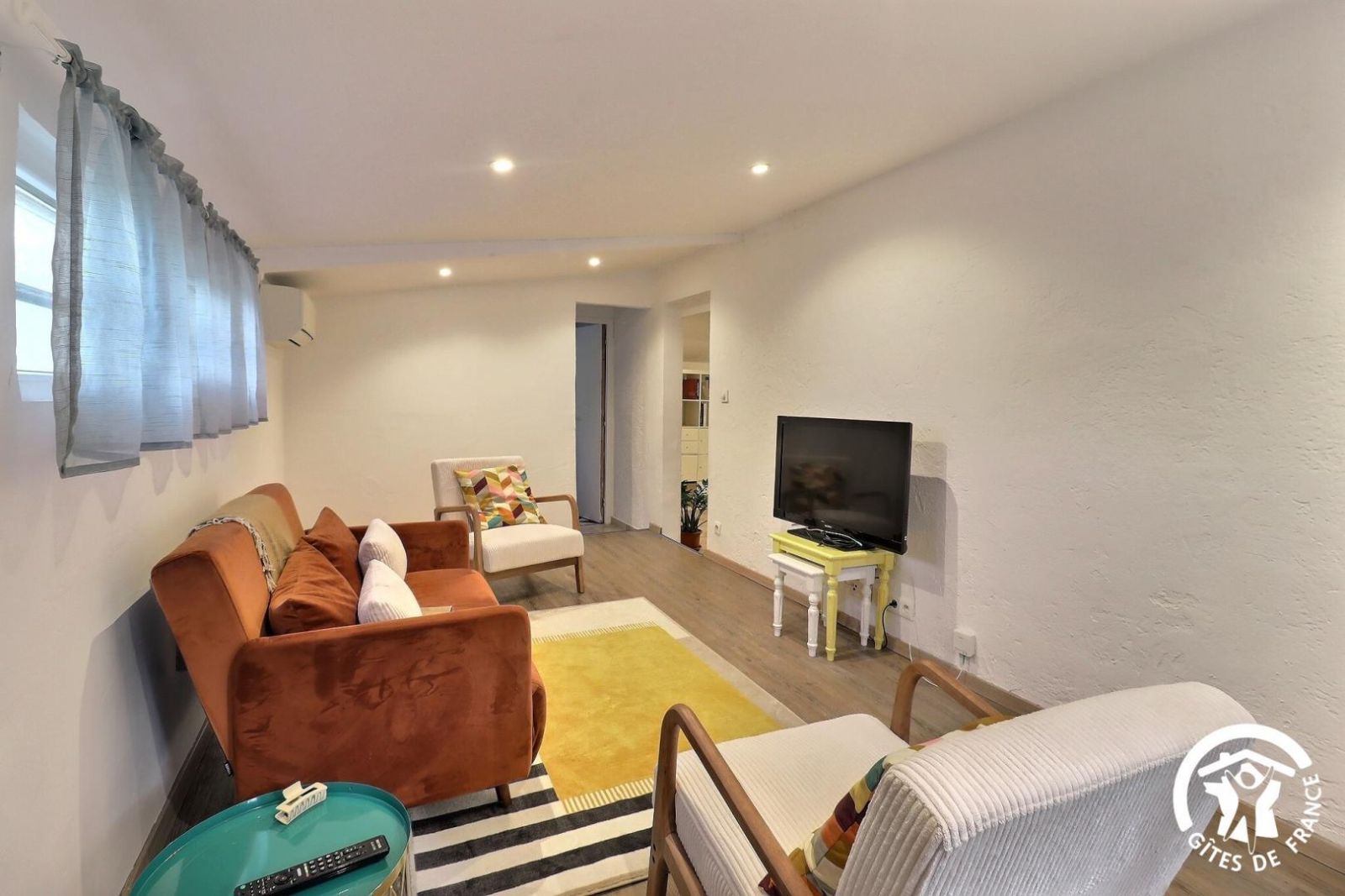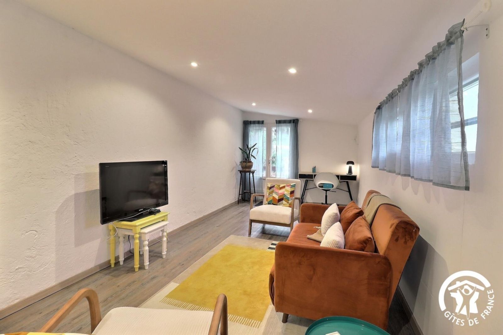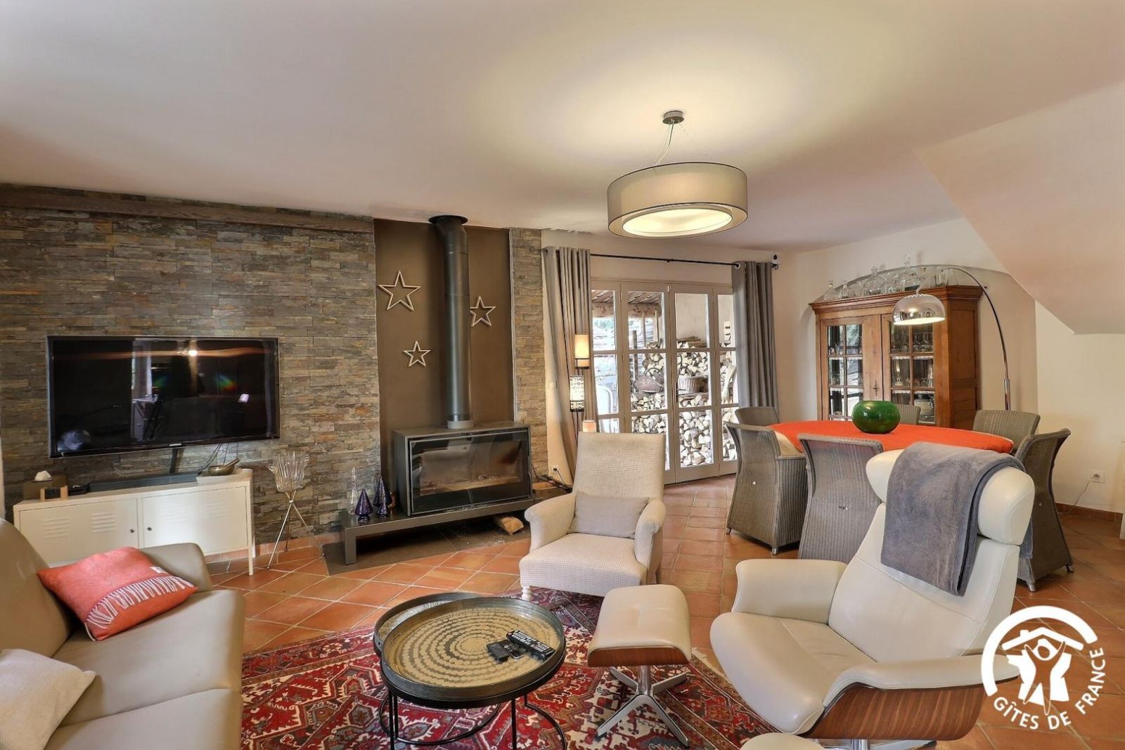 - Un salon avec deux canapés, fauteuils, TV et coin salle à manger