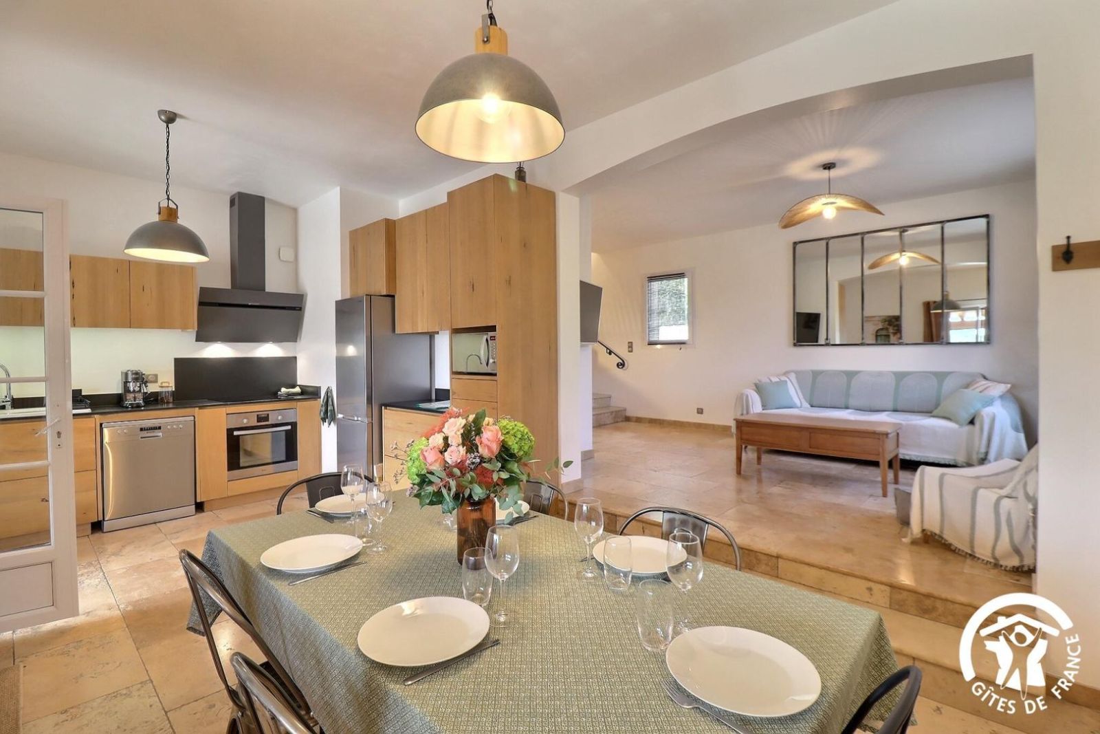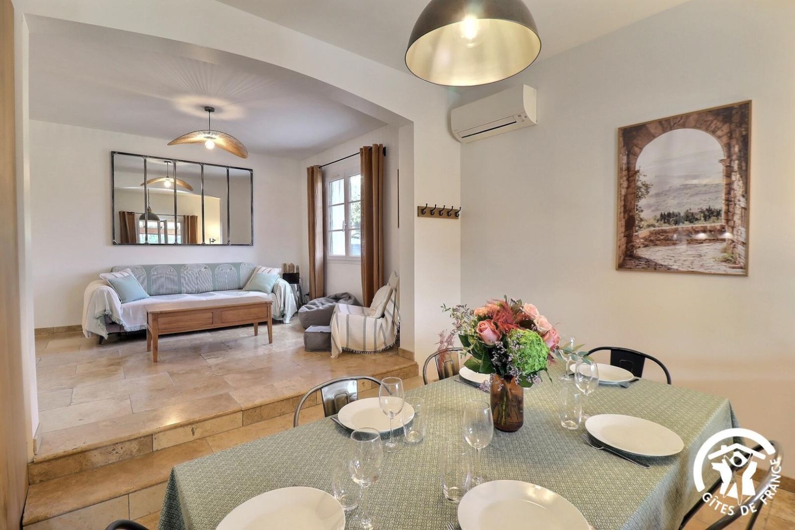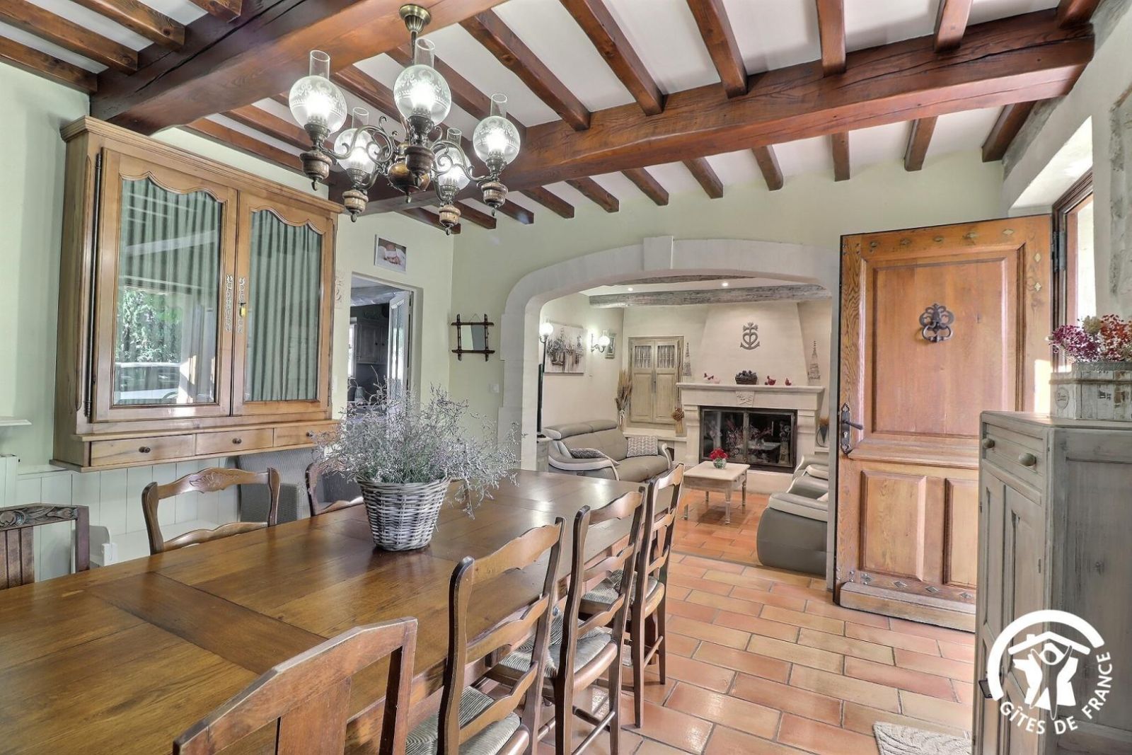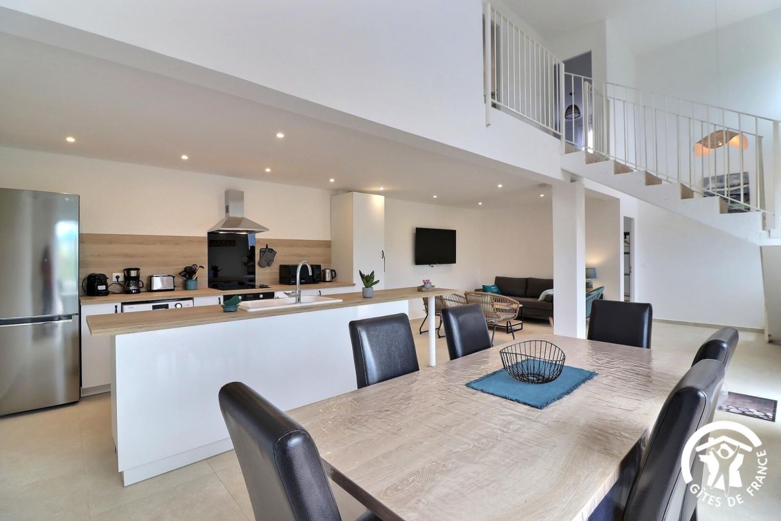 - Un séjour avec un espace salon accessible avec 1 marche à descendre, canapé, deux fauteuils, table basse, cheminée décorative, TV et un espace salle à manger avec une table et 8 chaises