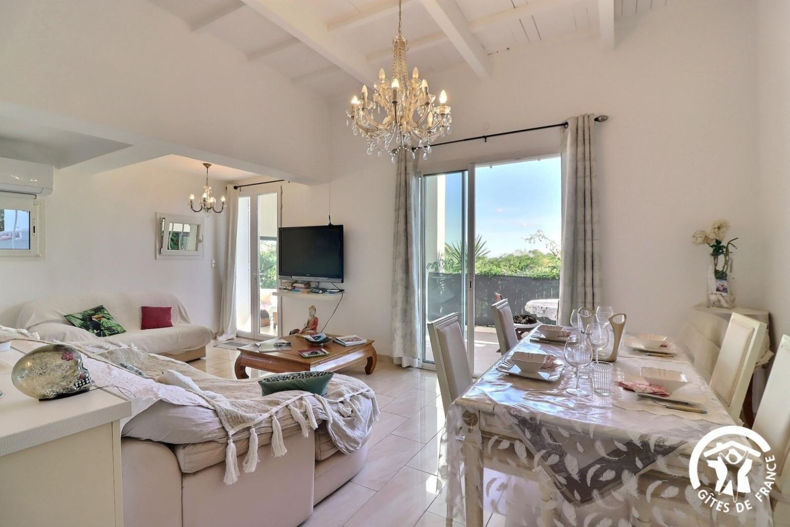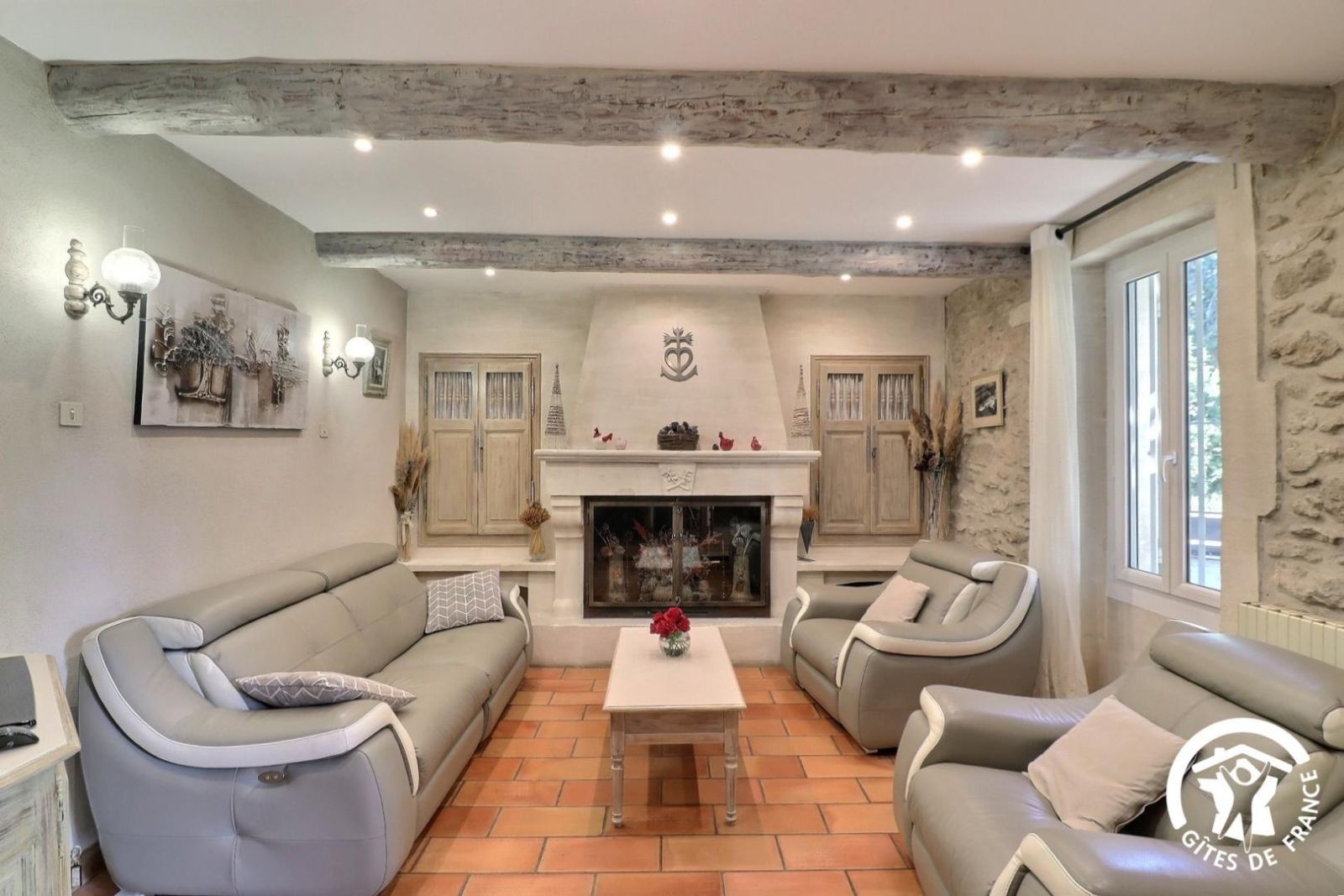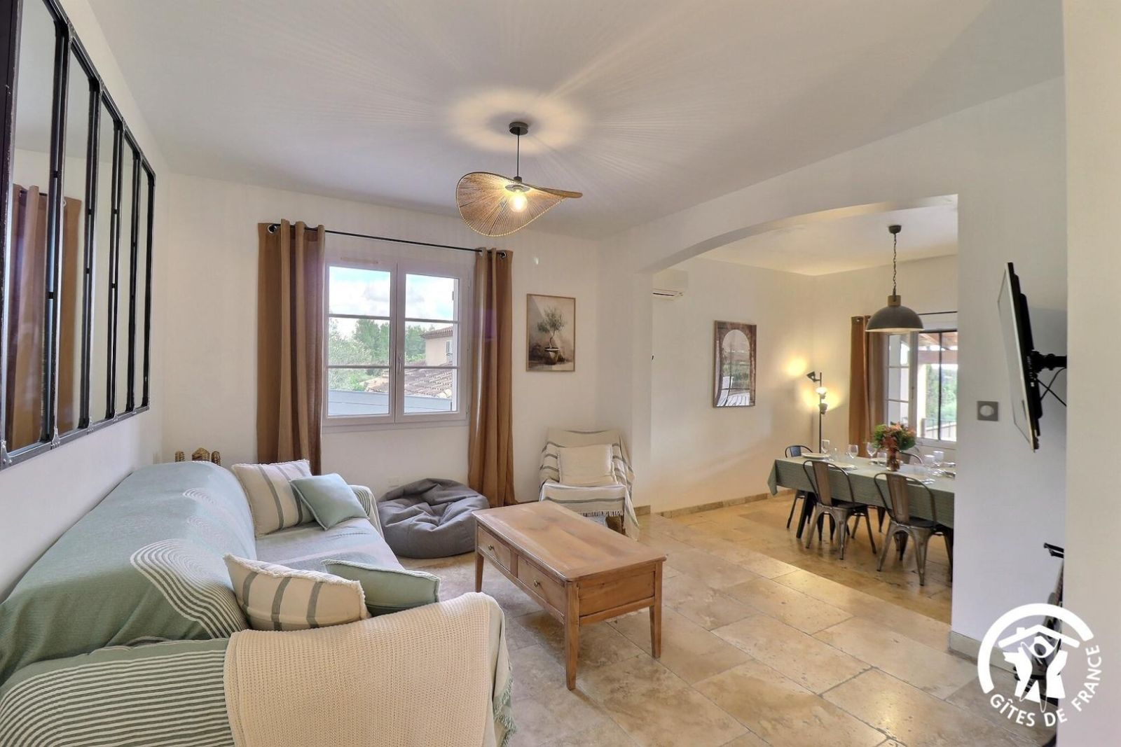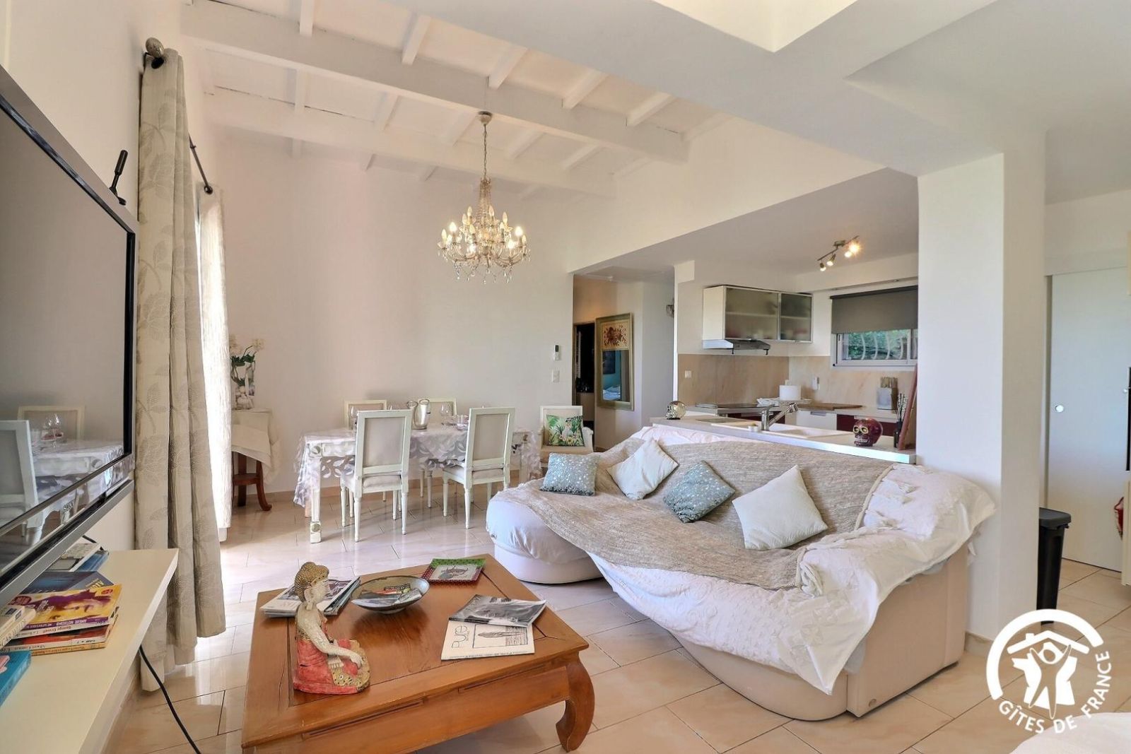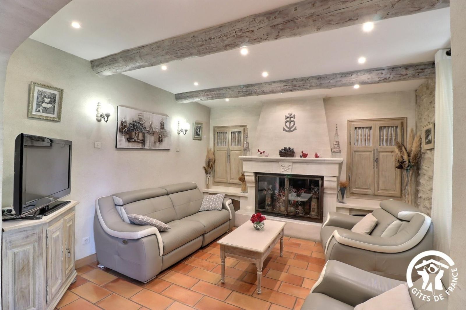 - Un séjour avec un espace salon accessible avec 1 marche à descendre, canapé, deux fauteuils, table basse, cheminée décorative, TV et un espace salle à manger avec une table et 8 chaises
