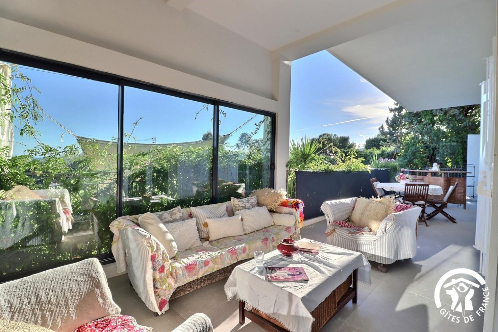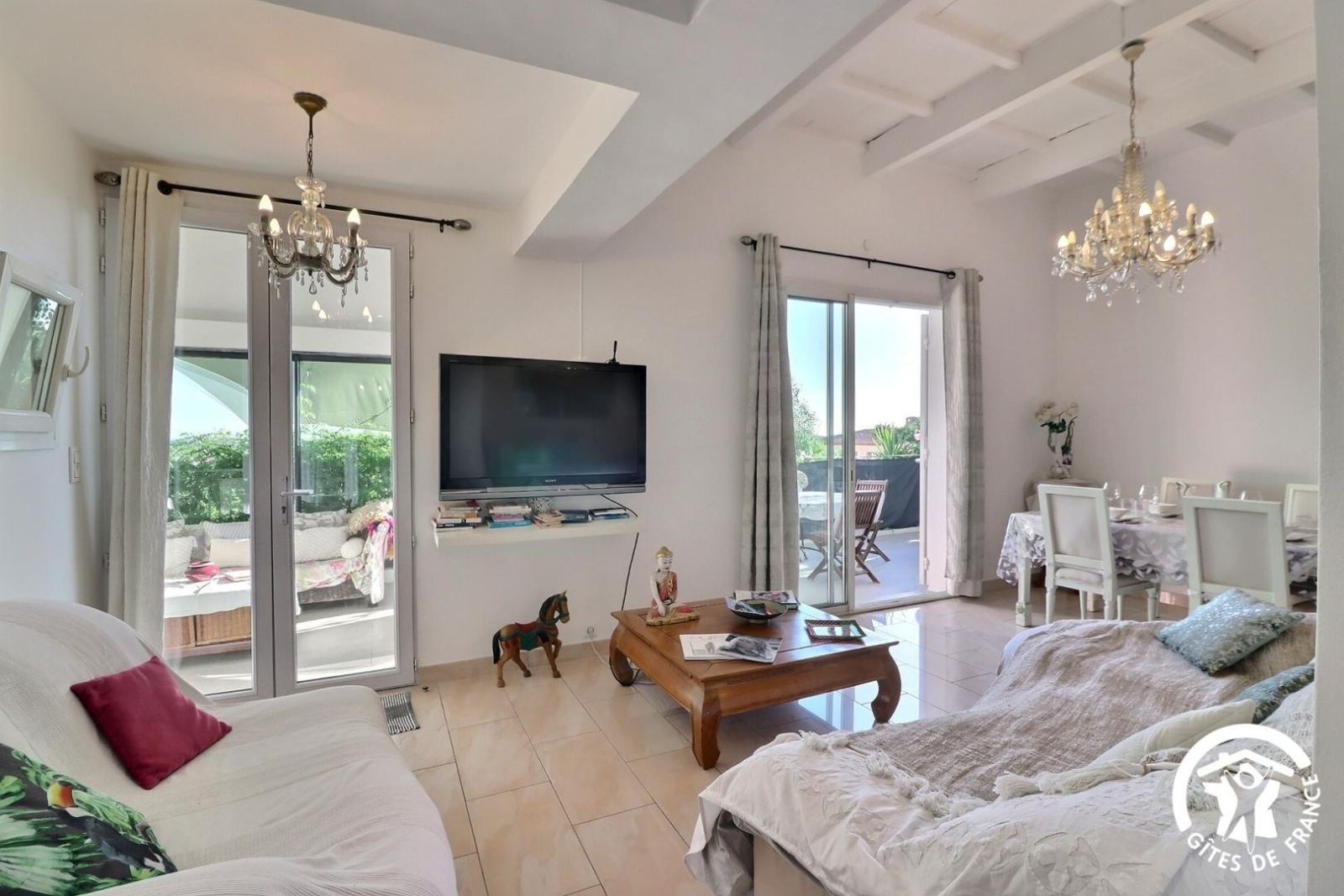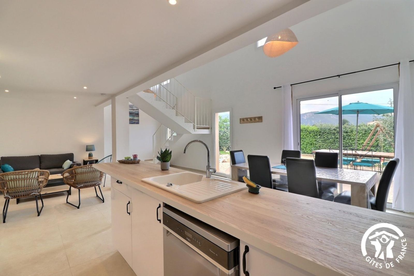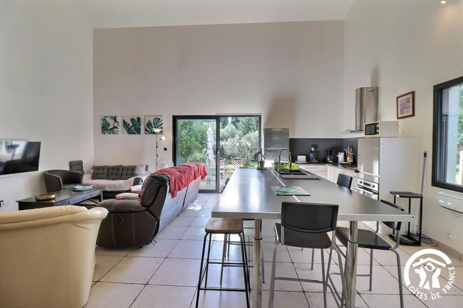 - Un séjour avec un espace salon accessible avec 1 marche à descendre, canapé, deux fauteuils, table basse, cheminée décorative, TV et un espace salle à manger avec une table et 8 chaises