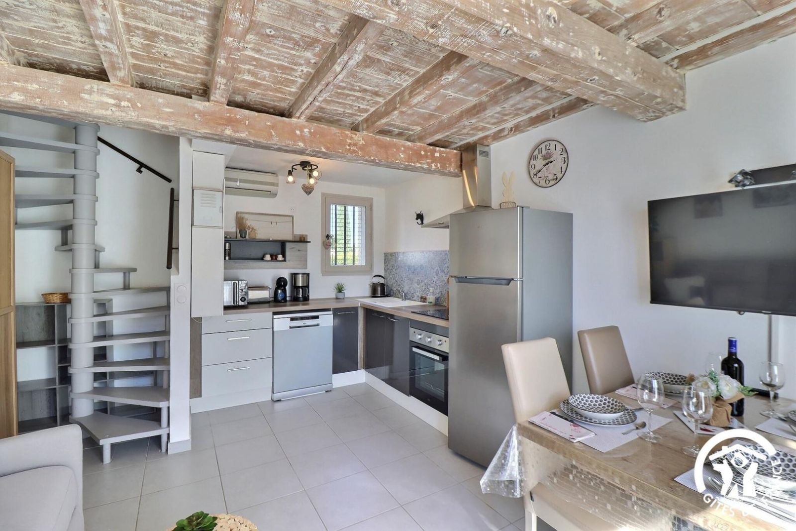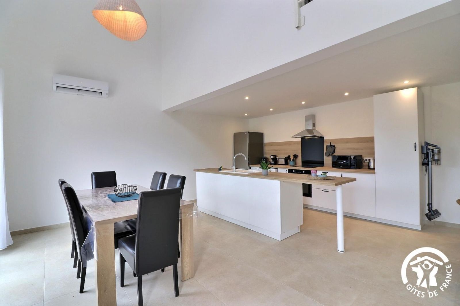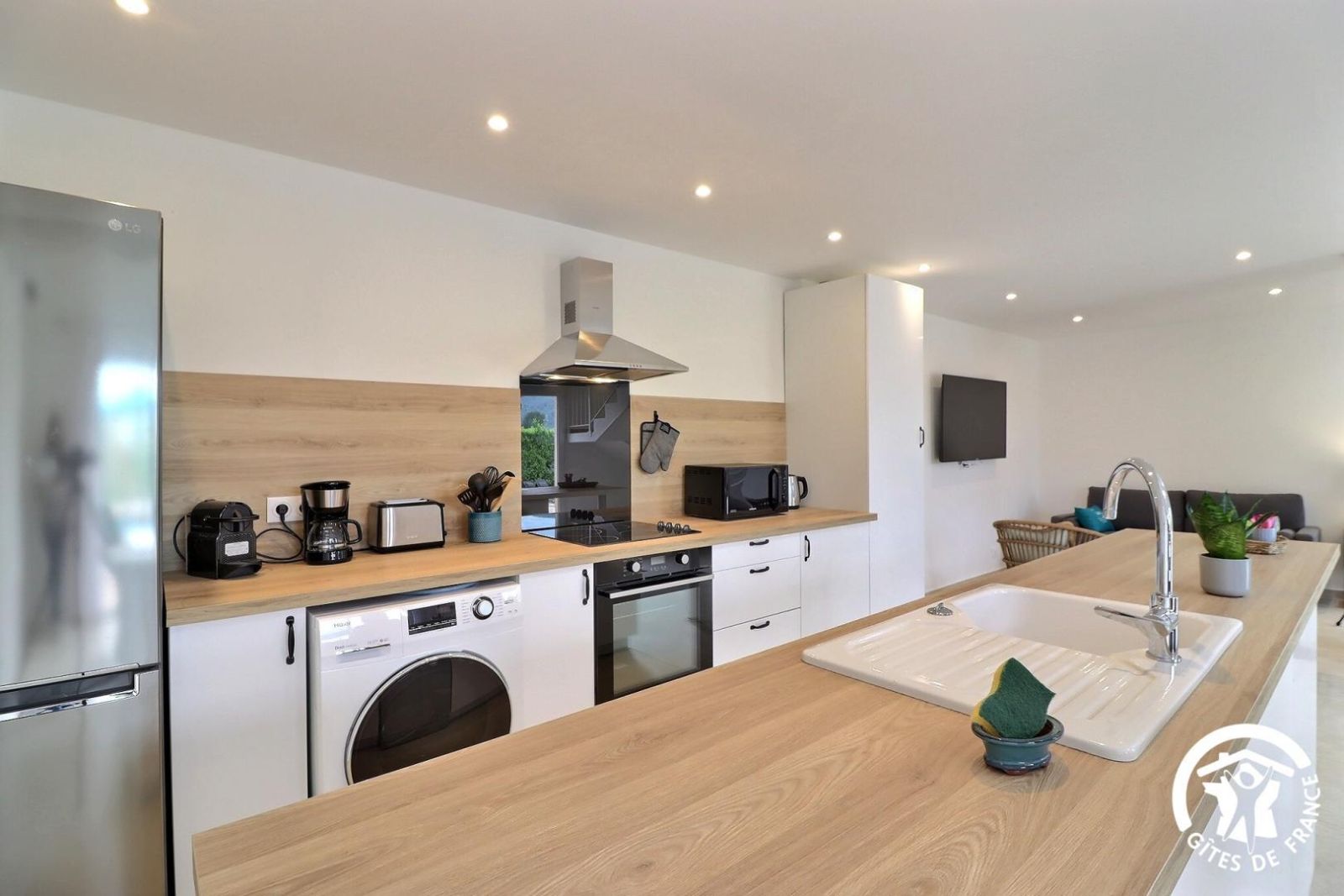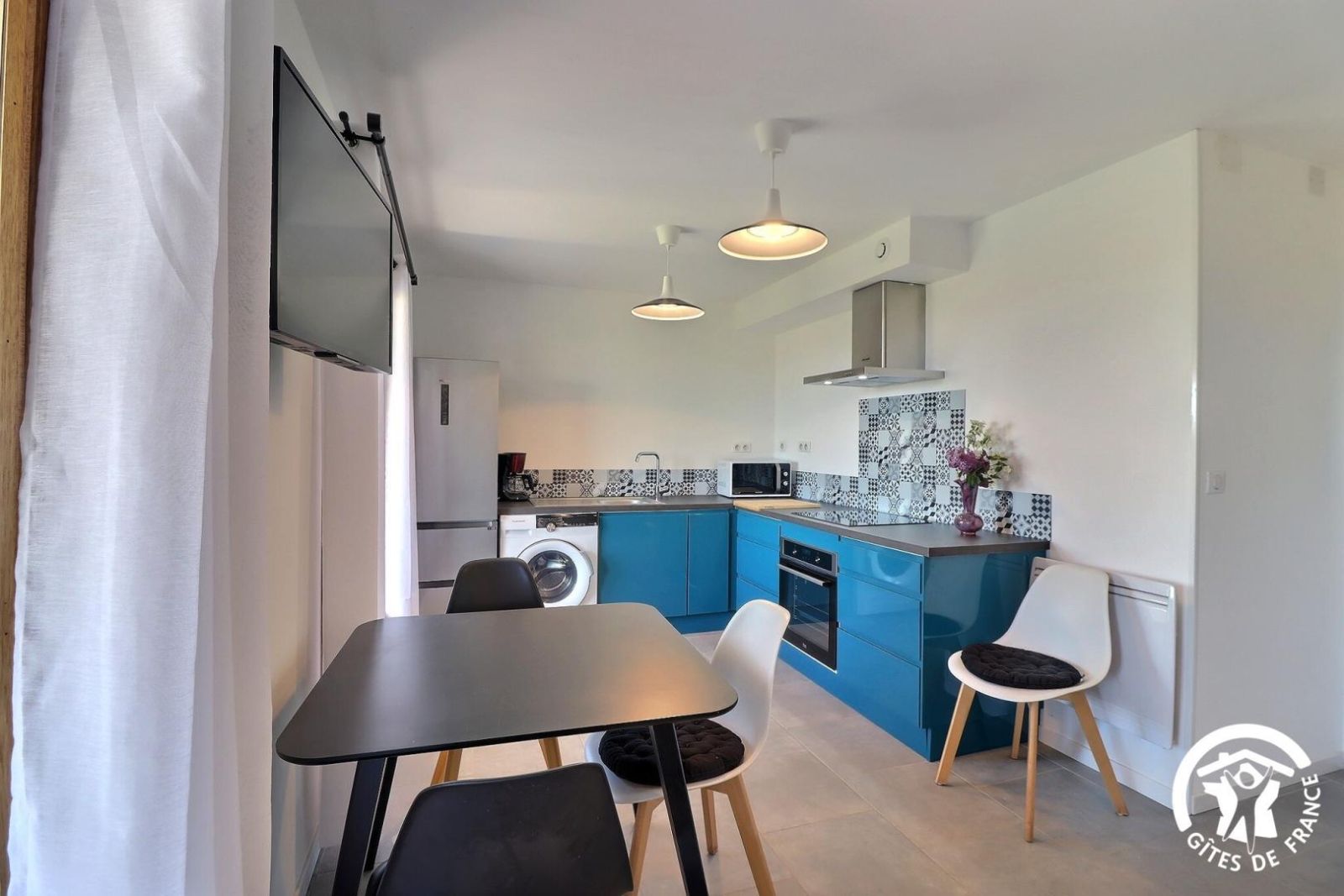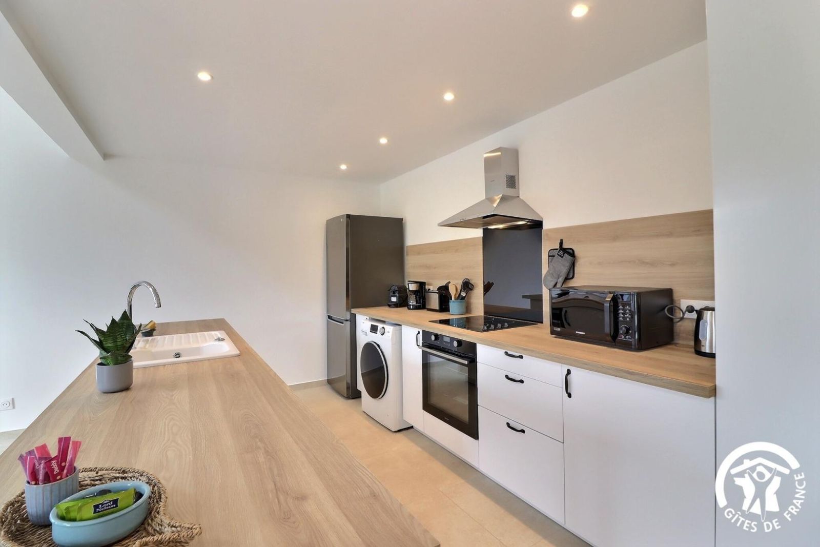 - Une cuisine séparée avec table et chaises, réfrigérateur-congélateur, plaques 3 feux gaz et un feu électrique, four, micro-onde, machine à café filtre et à dosettes Senseo, lave-vaisselle