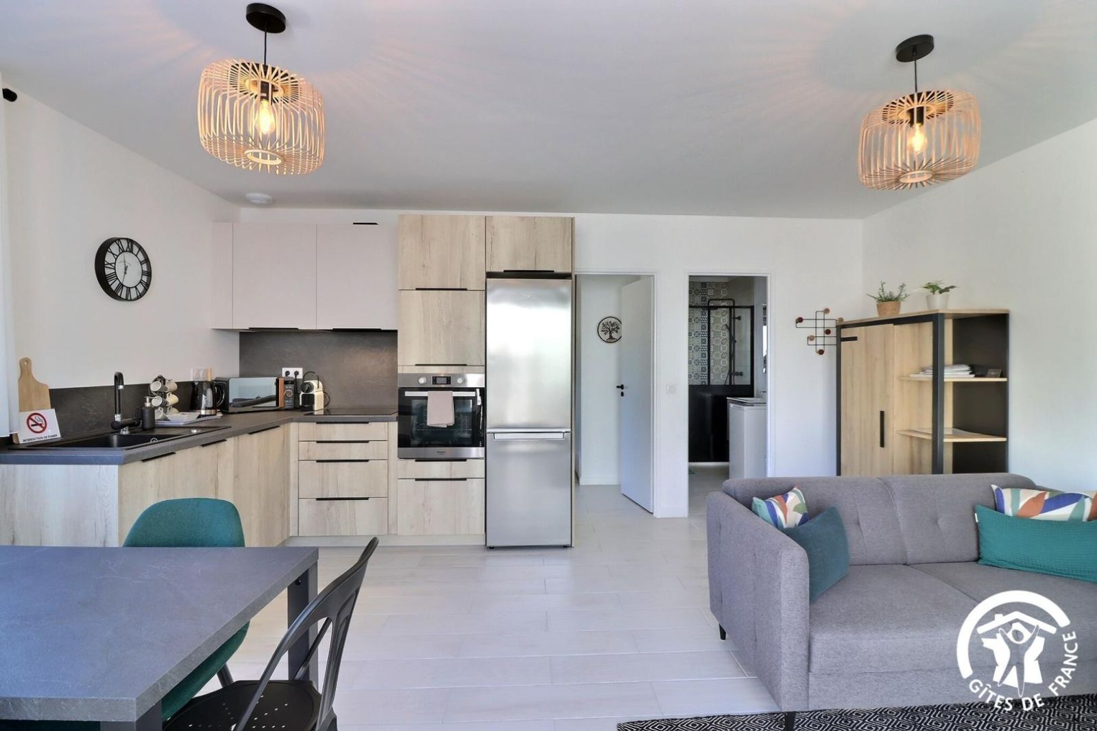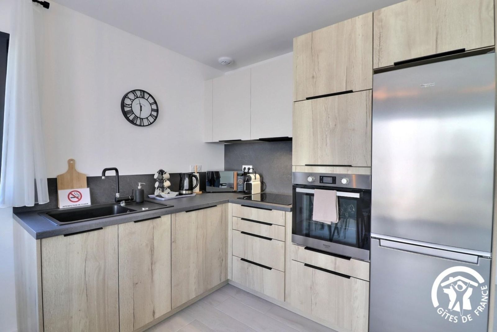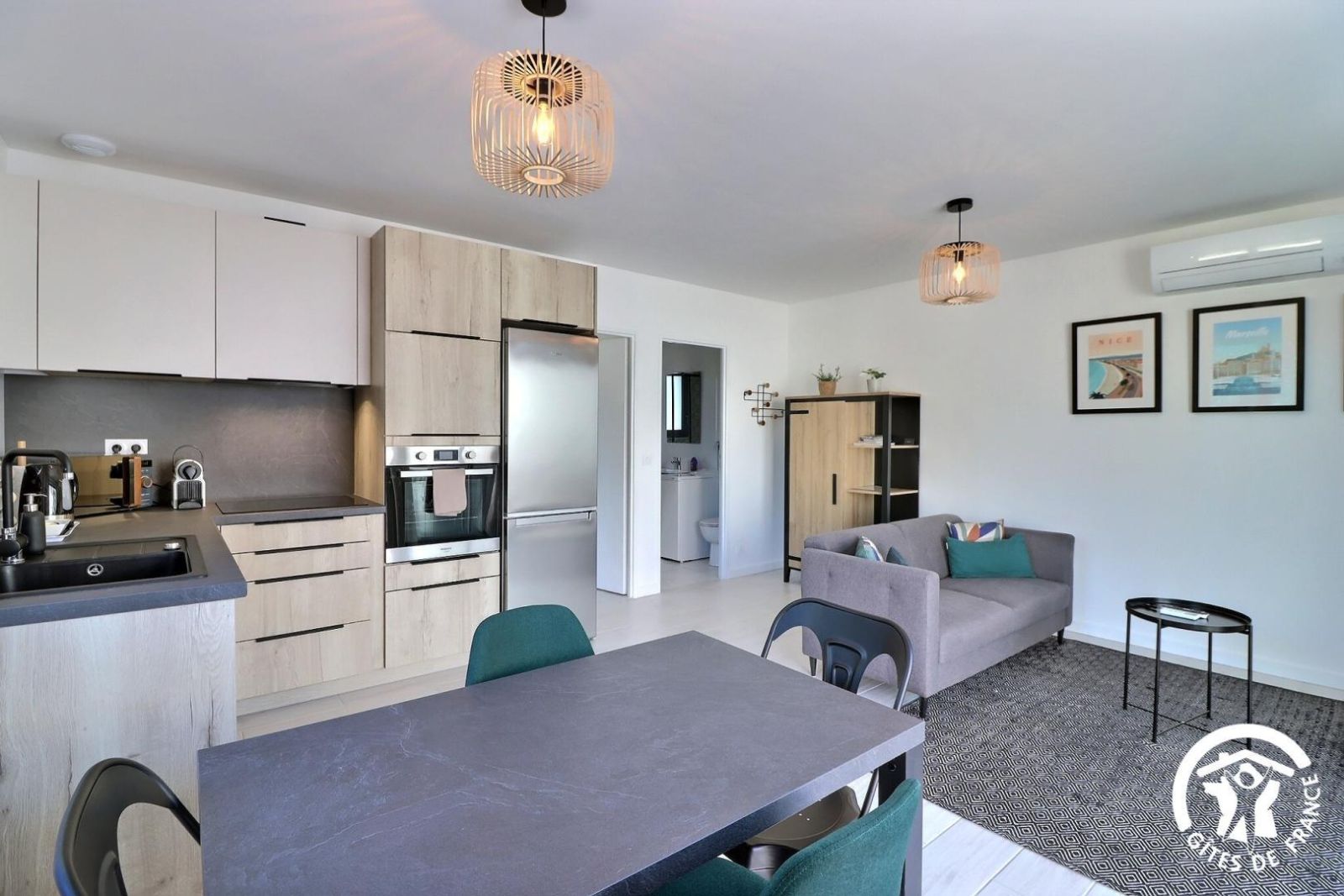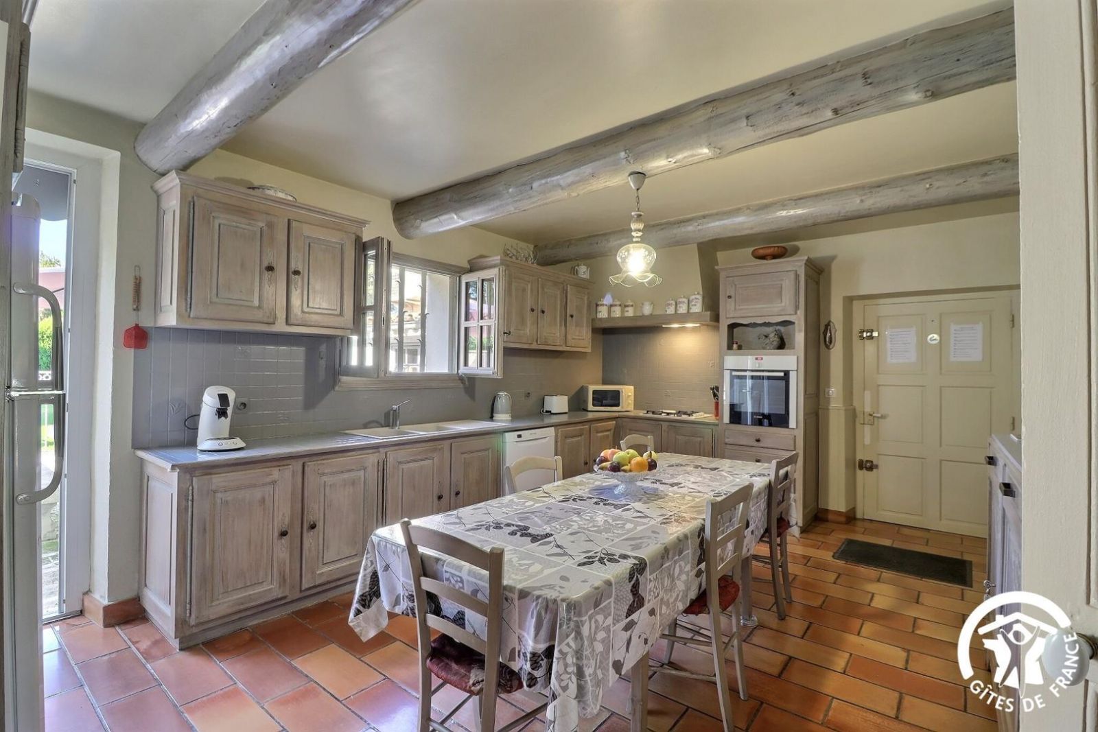 - Une cuisine séparée avec table et chaises, réfrigérateur-congélateur, plaques 3 feux gaz et un feu électrique, four, micro-onde, machine à café filtre et à dosettes Senseo, lave-vaisselle