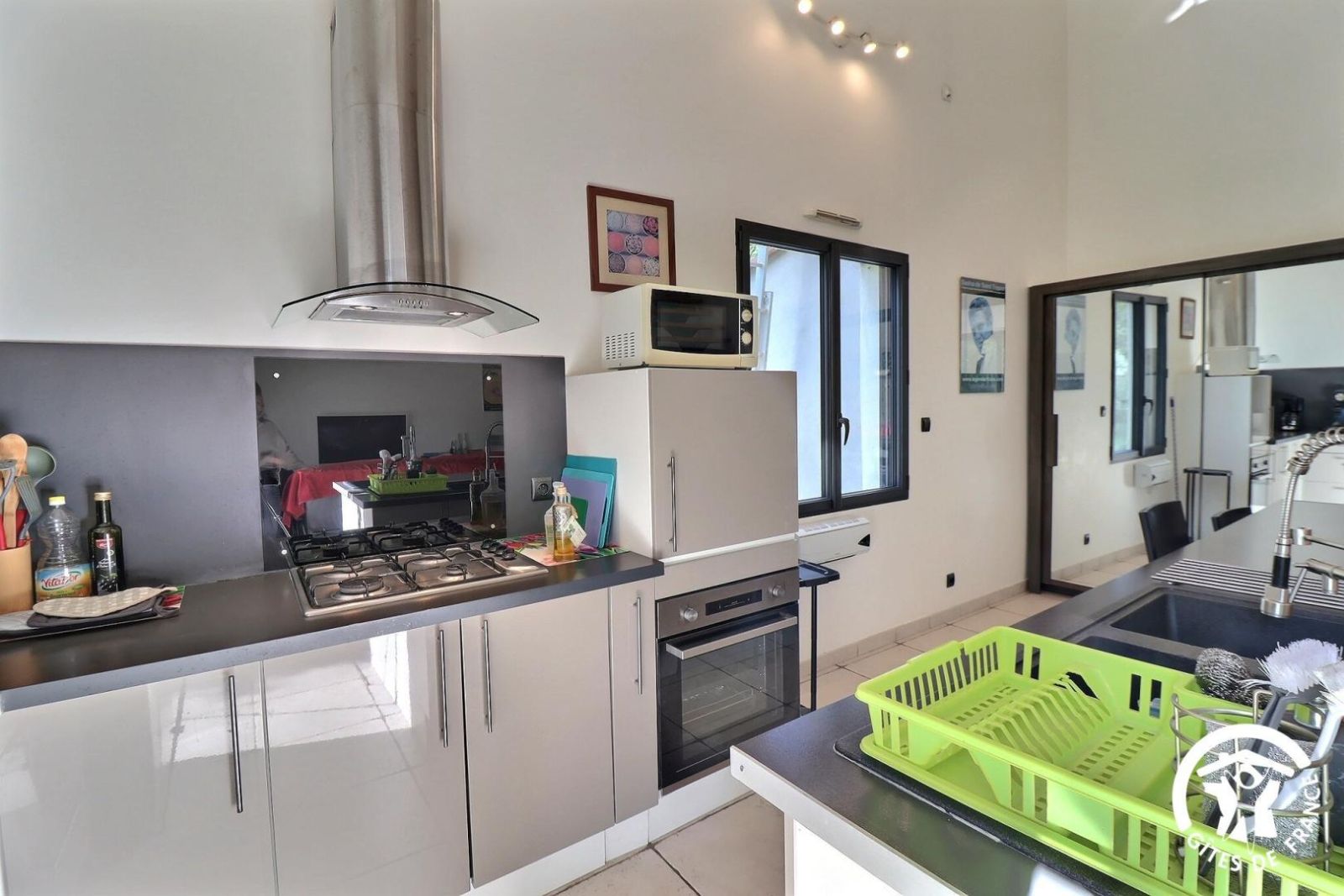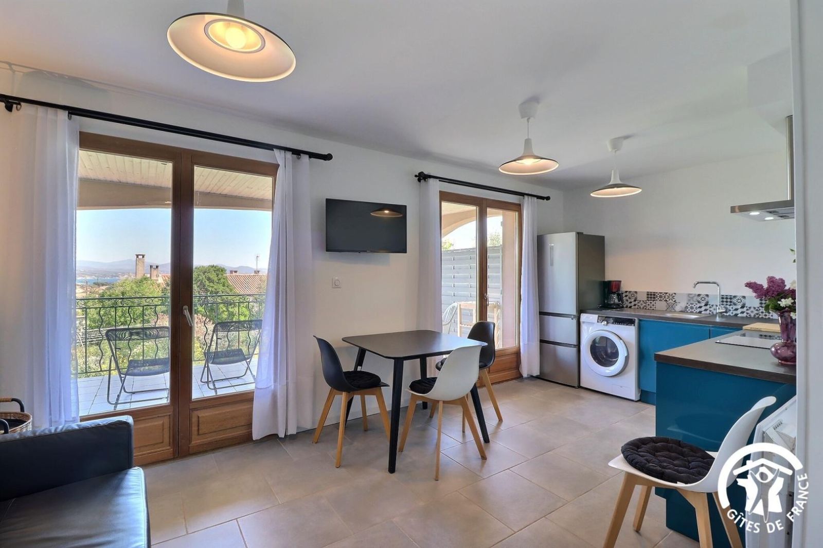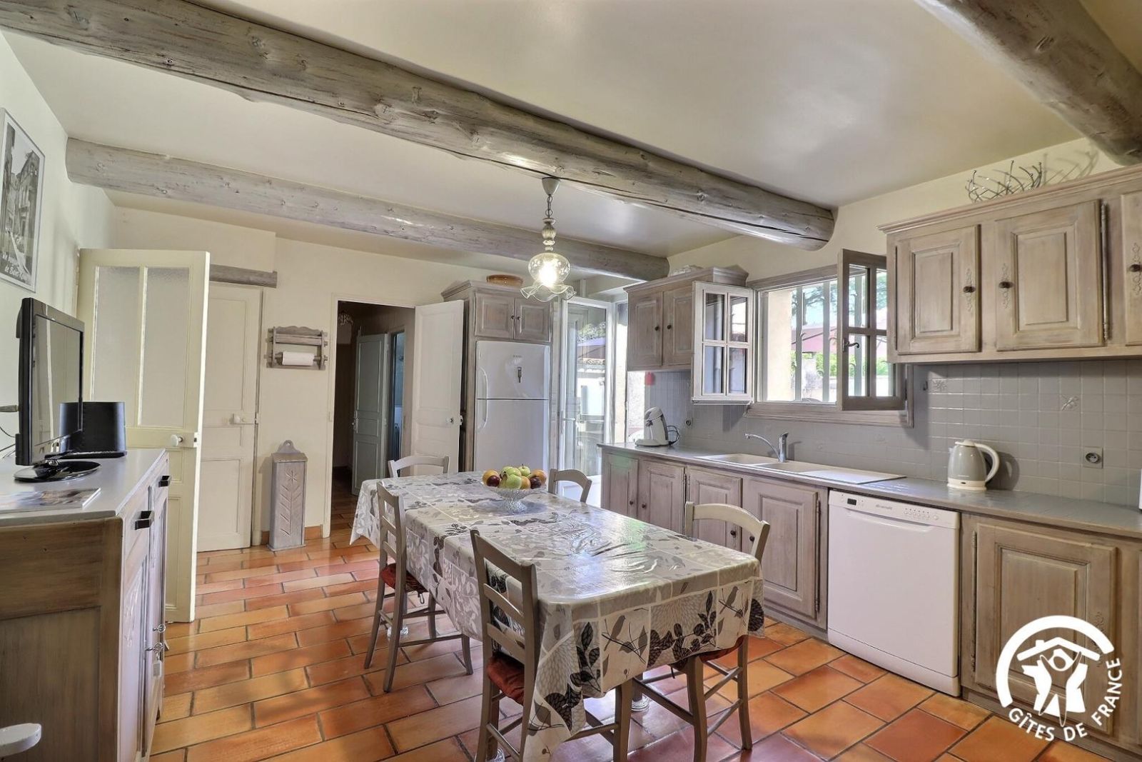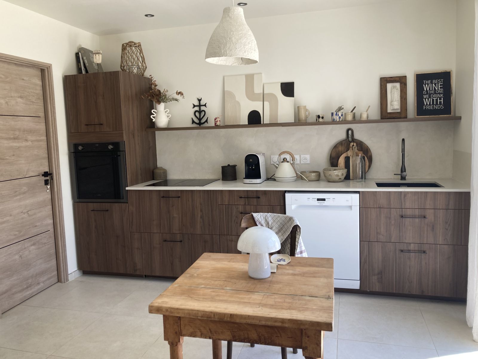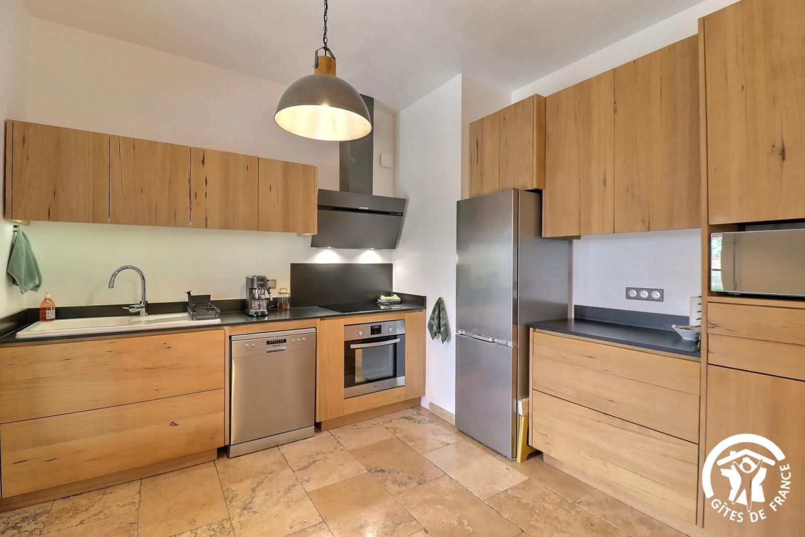 - Une cuisine séparée avec table et chaises, réfrigérateur-congélateur, plaques 3 feux gaz et un feu électrique, four, micro-onde, machine à café filtre et à dosettes Senseo, lave-vaisselle