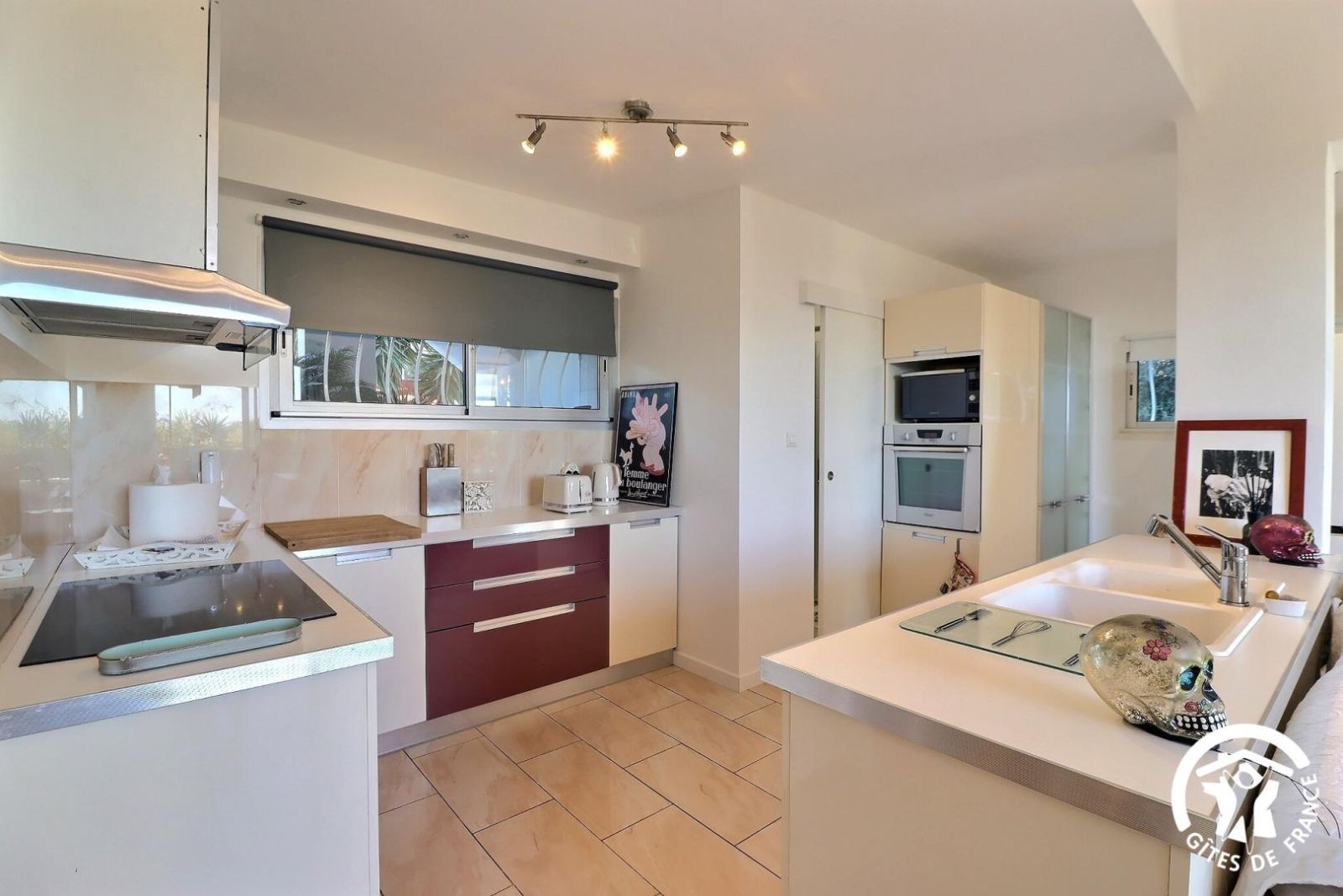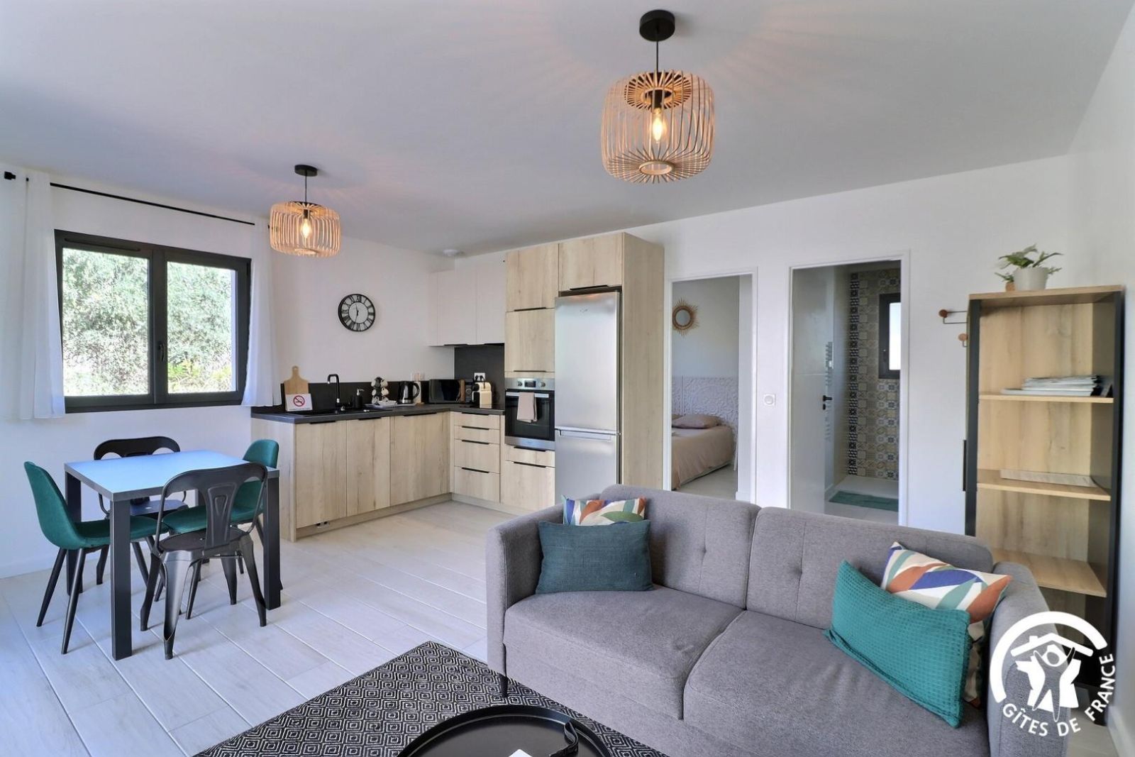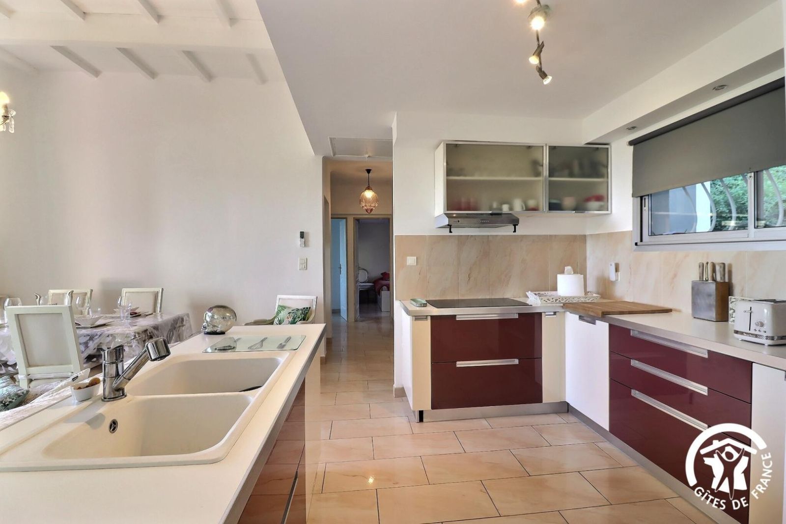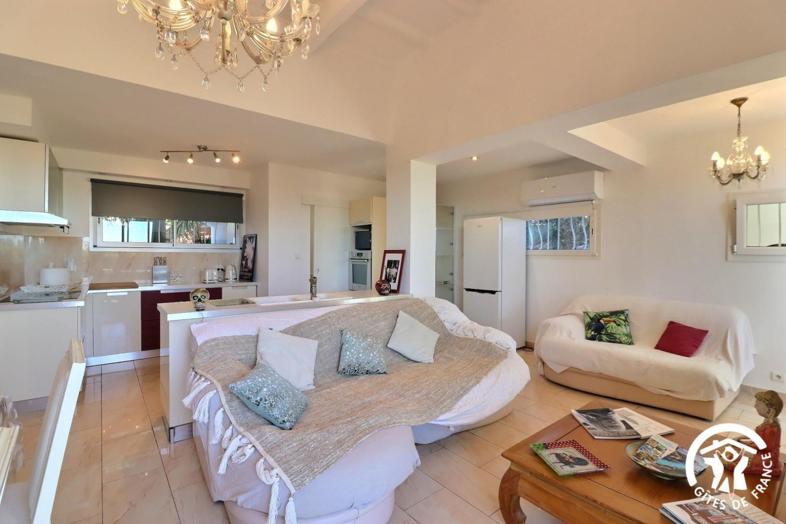 - Une cuisine séparée avec table et chaises, réfrigérateur-congélateur, plaques 3 feux gaz et un feu électrique, four, micro-onde, machine à café filtre et à dosettes Senseo, lave-vaisselle