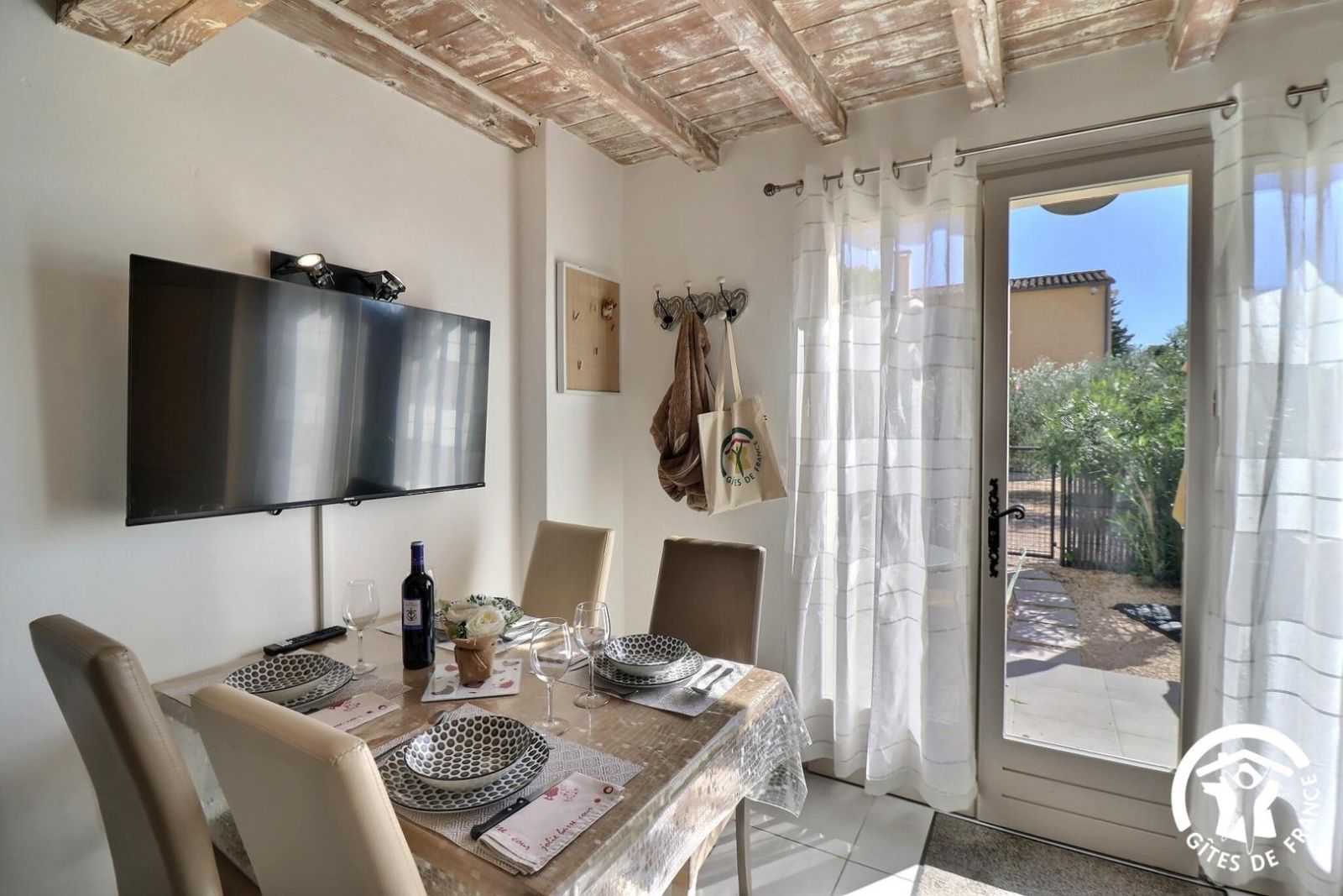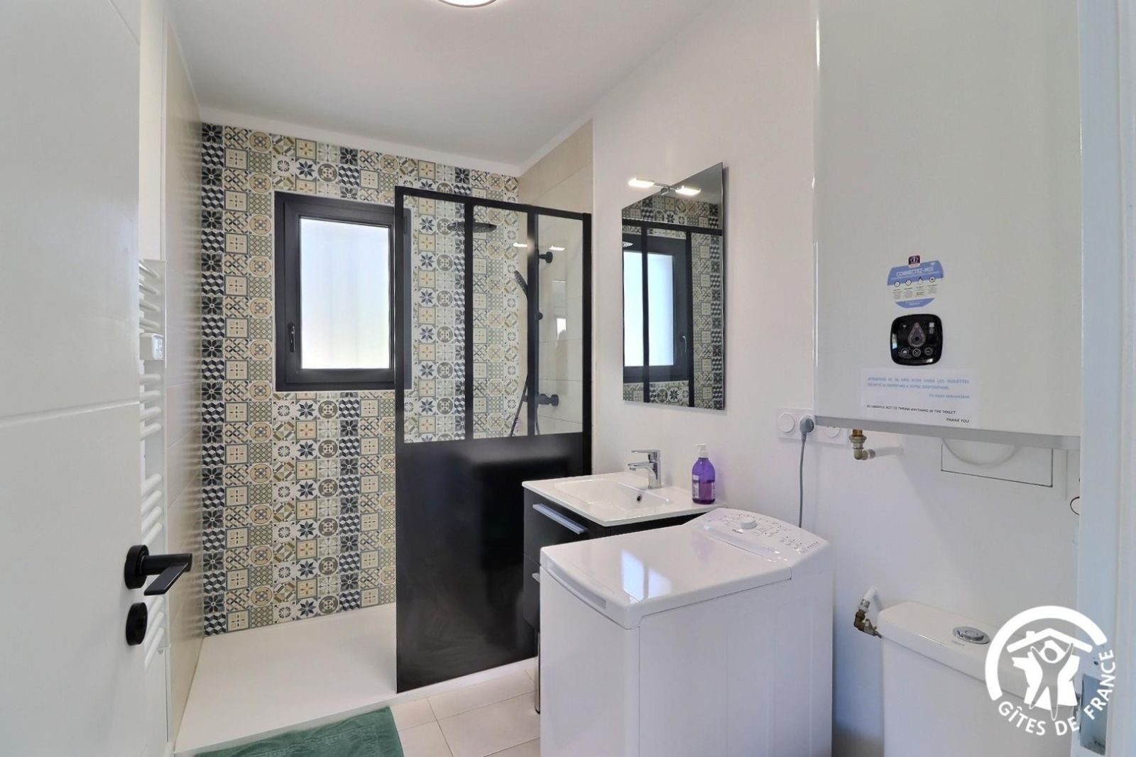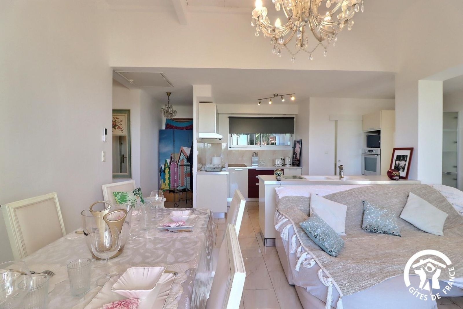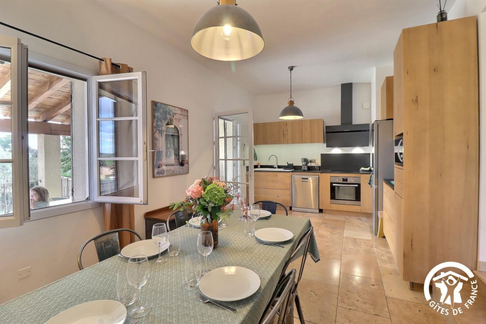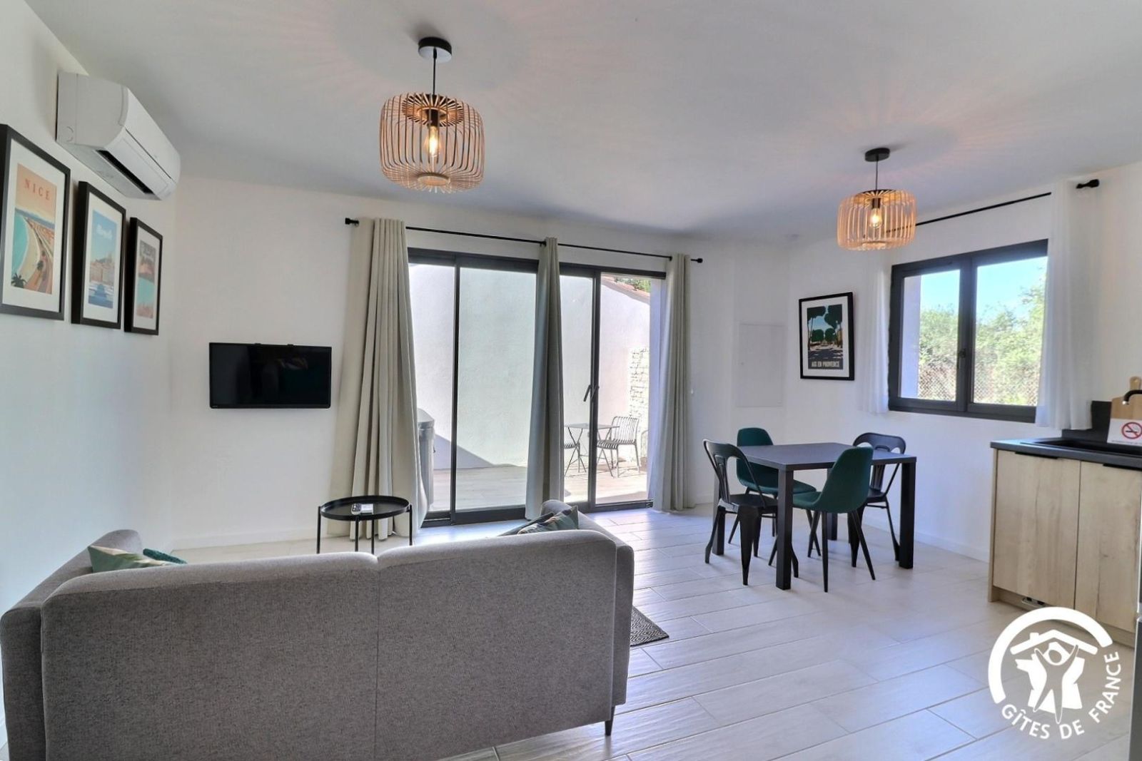 - Une cuisine séparée avec table et chaises, réfrigérateur-congélateur, plaques 3 feux gaz et un feu électrique, four, micro-onde, machine à café filtre et à dosettes Senseo, lave-vaisselle