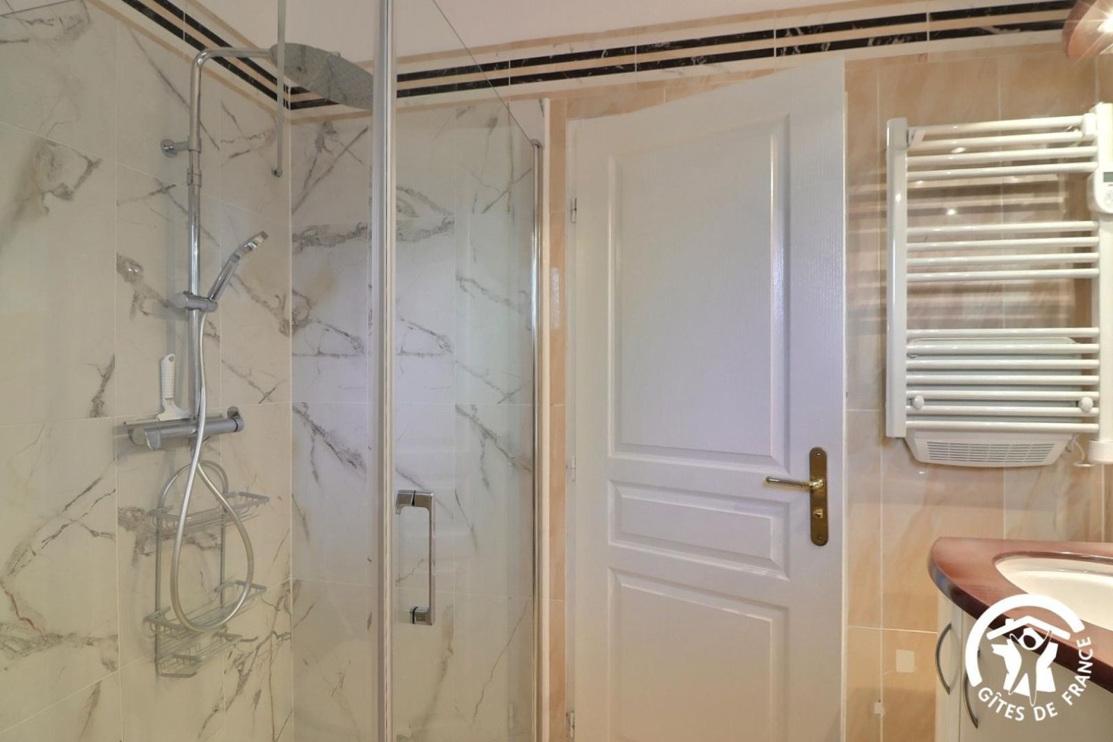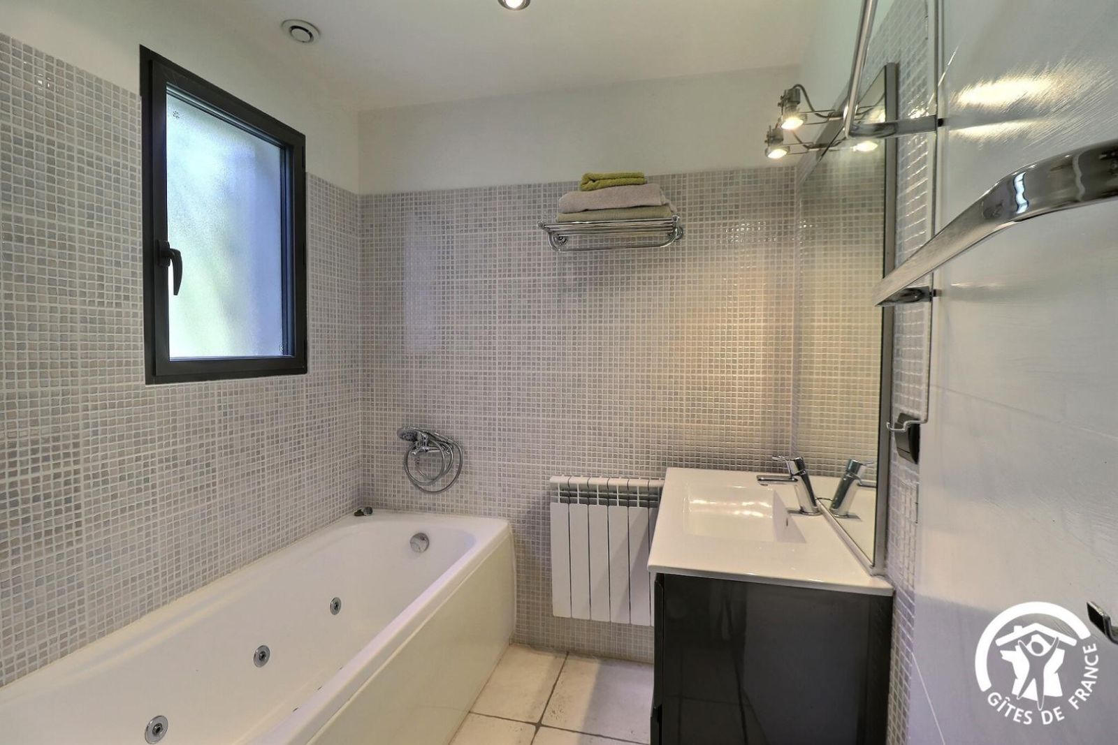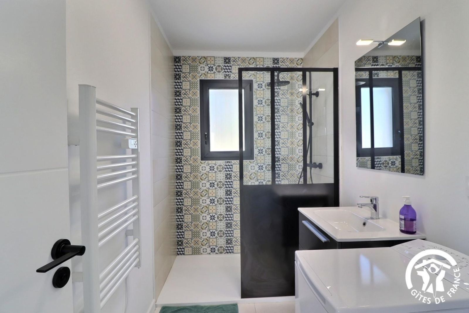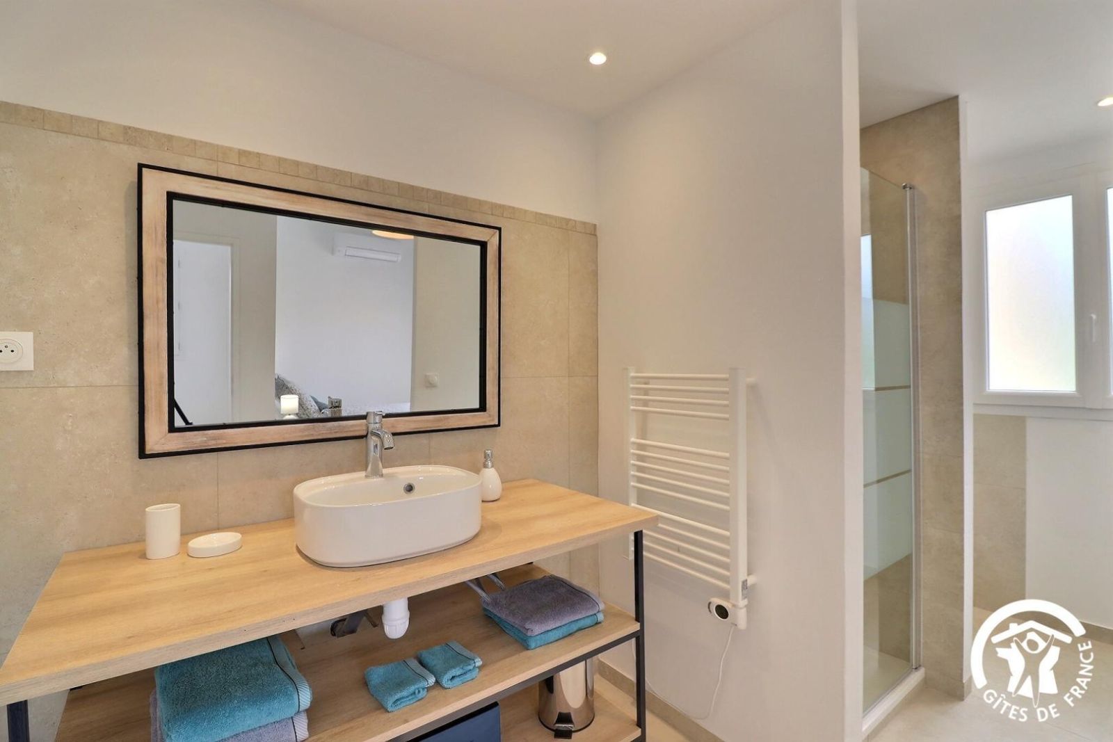 - Une salle de bain avec baignoire, une douche, meuble vasque et un sèche-serviette chauffant