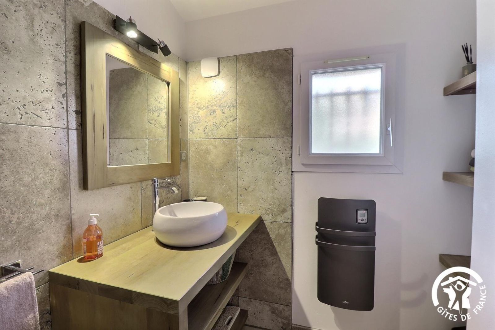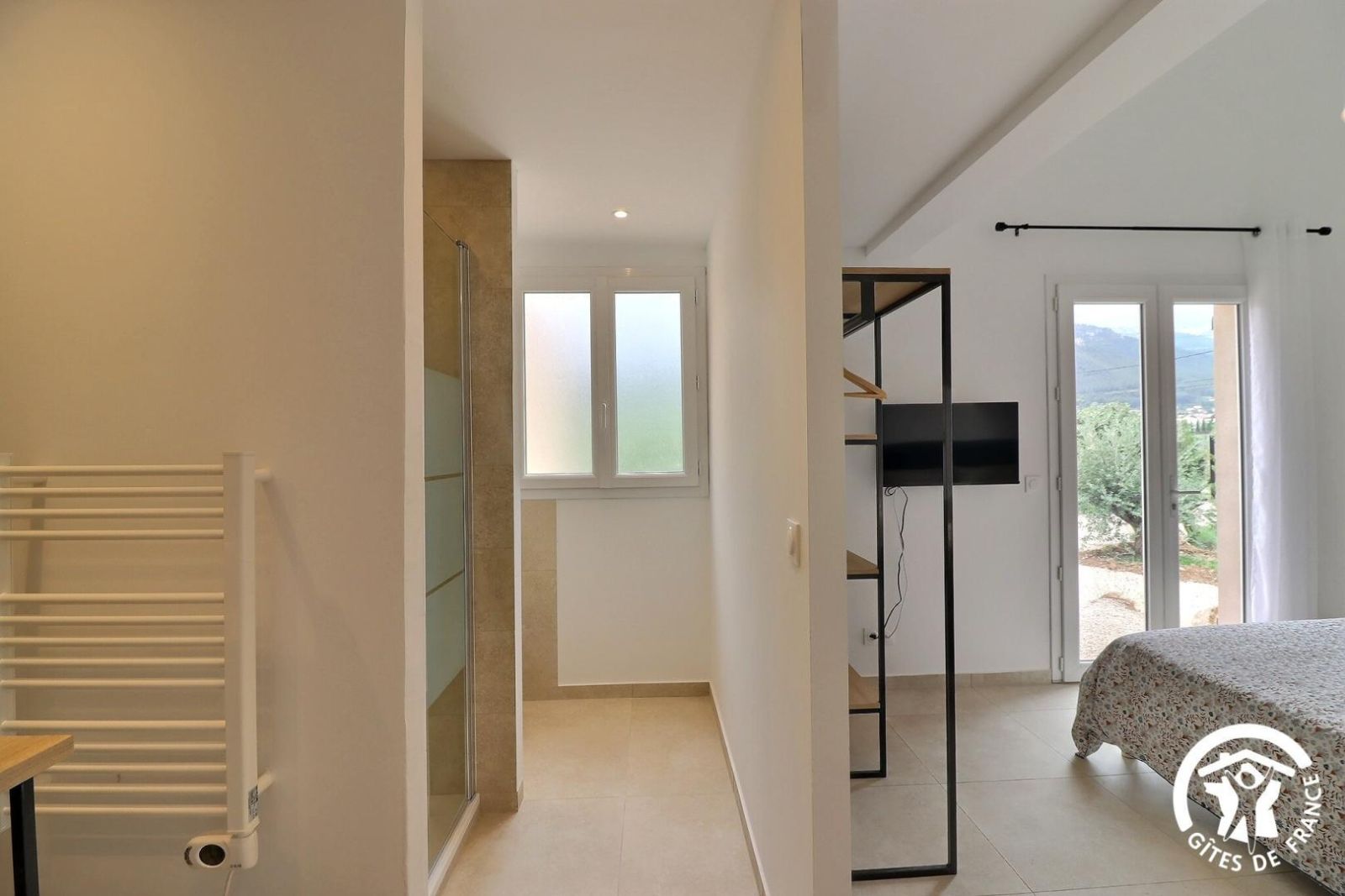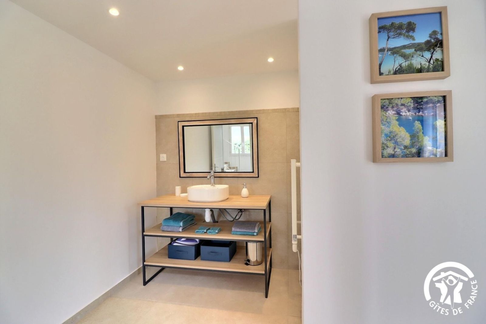 - Une salle de bain avec baignoire, une douche, meuble vasque et un sèche-serviette chauffant