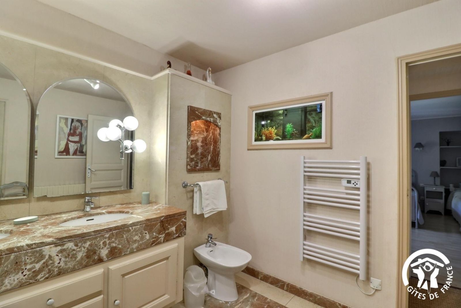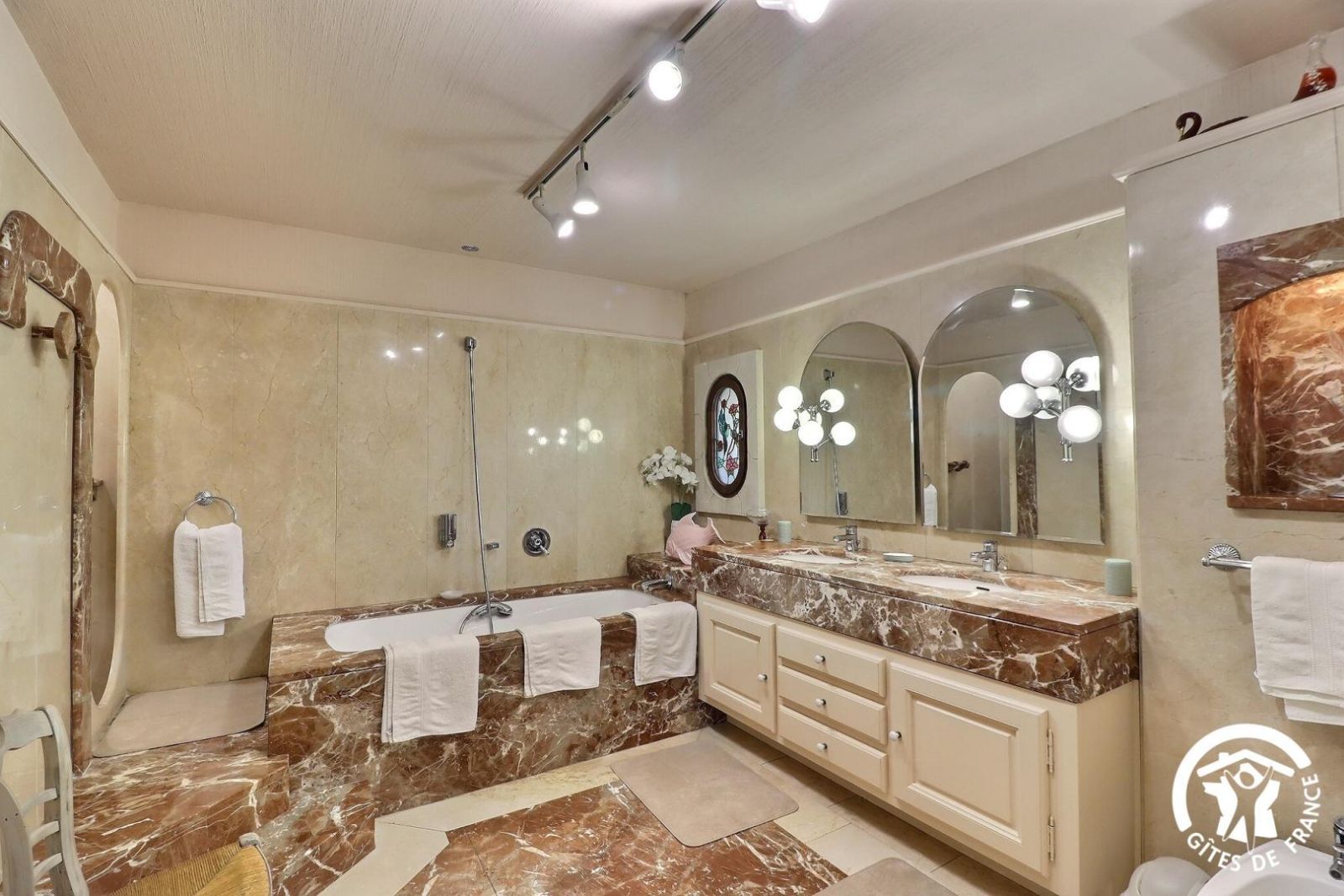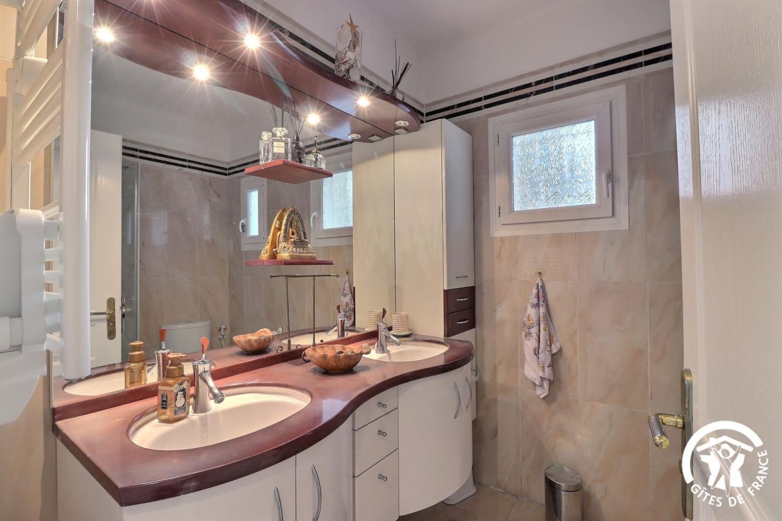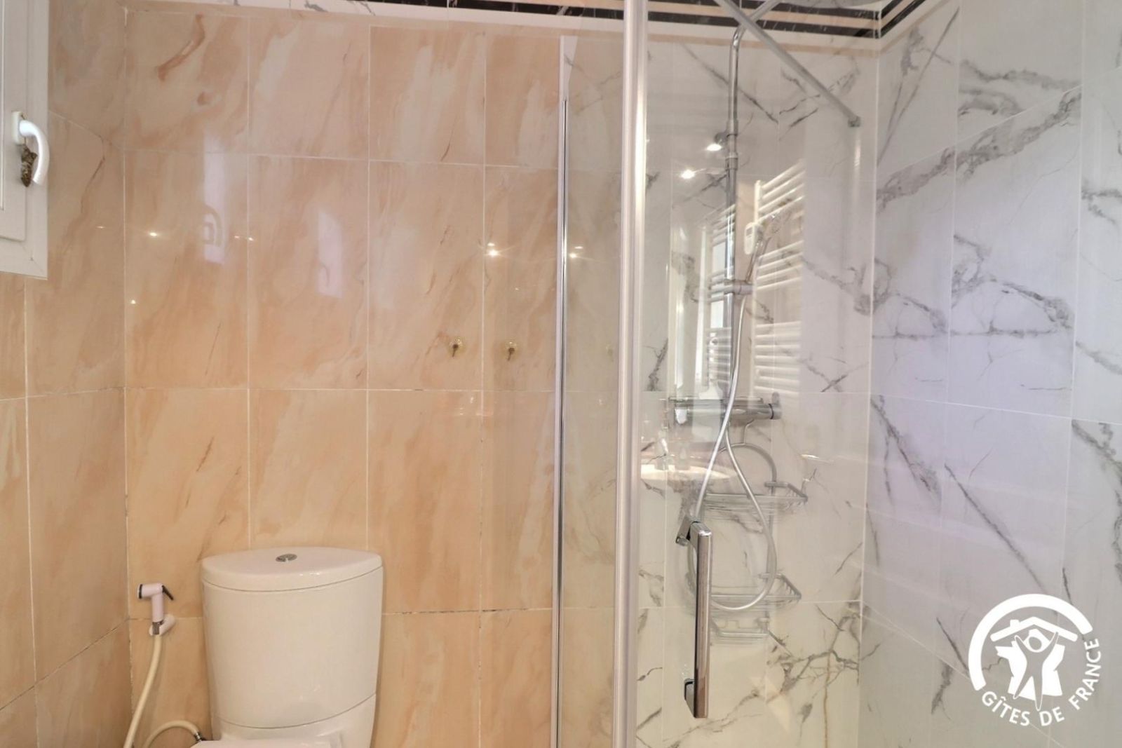 - Une salle de bain avec baignoire, une douche, meuble vasque et un sèche-serviette chauffant