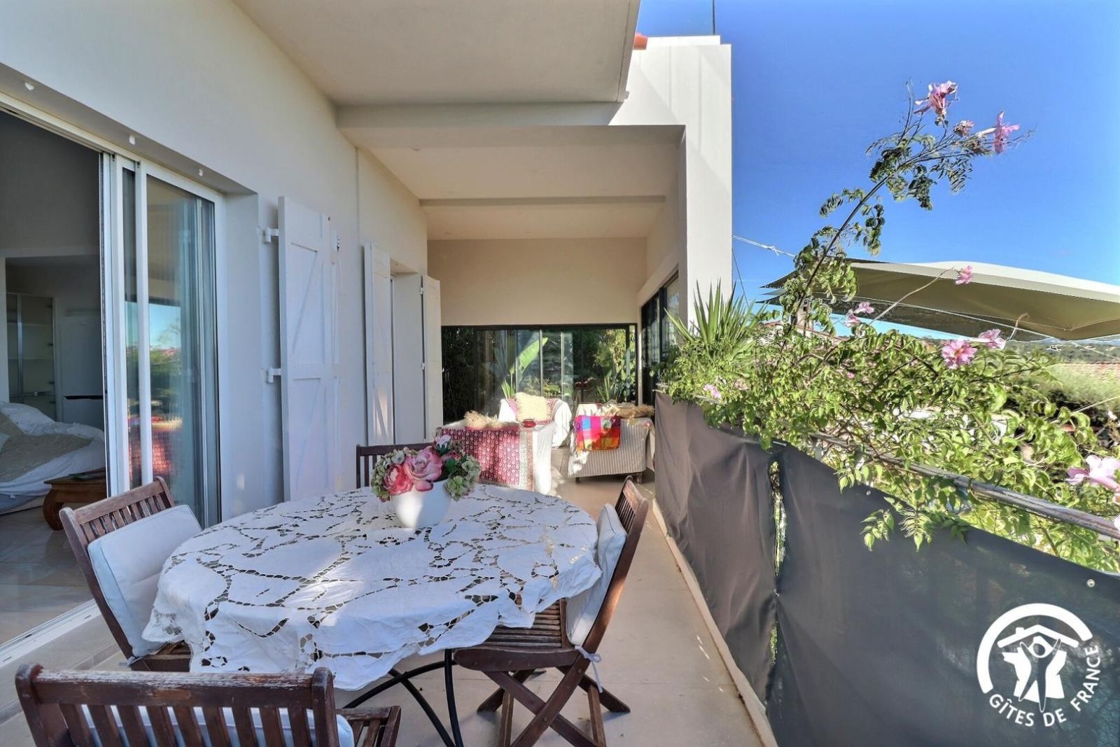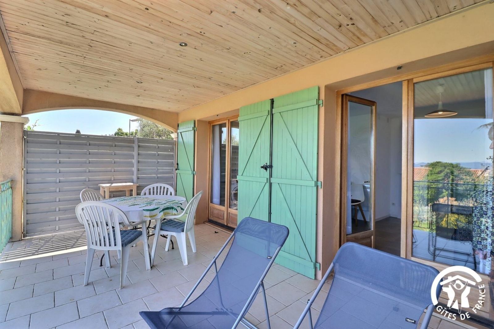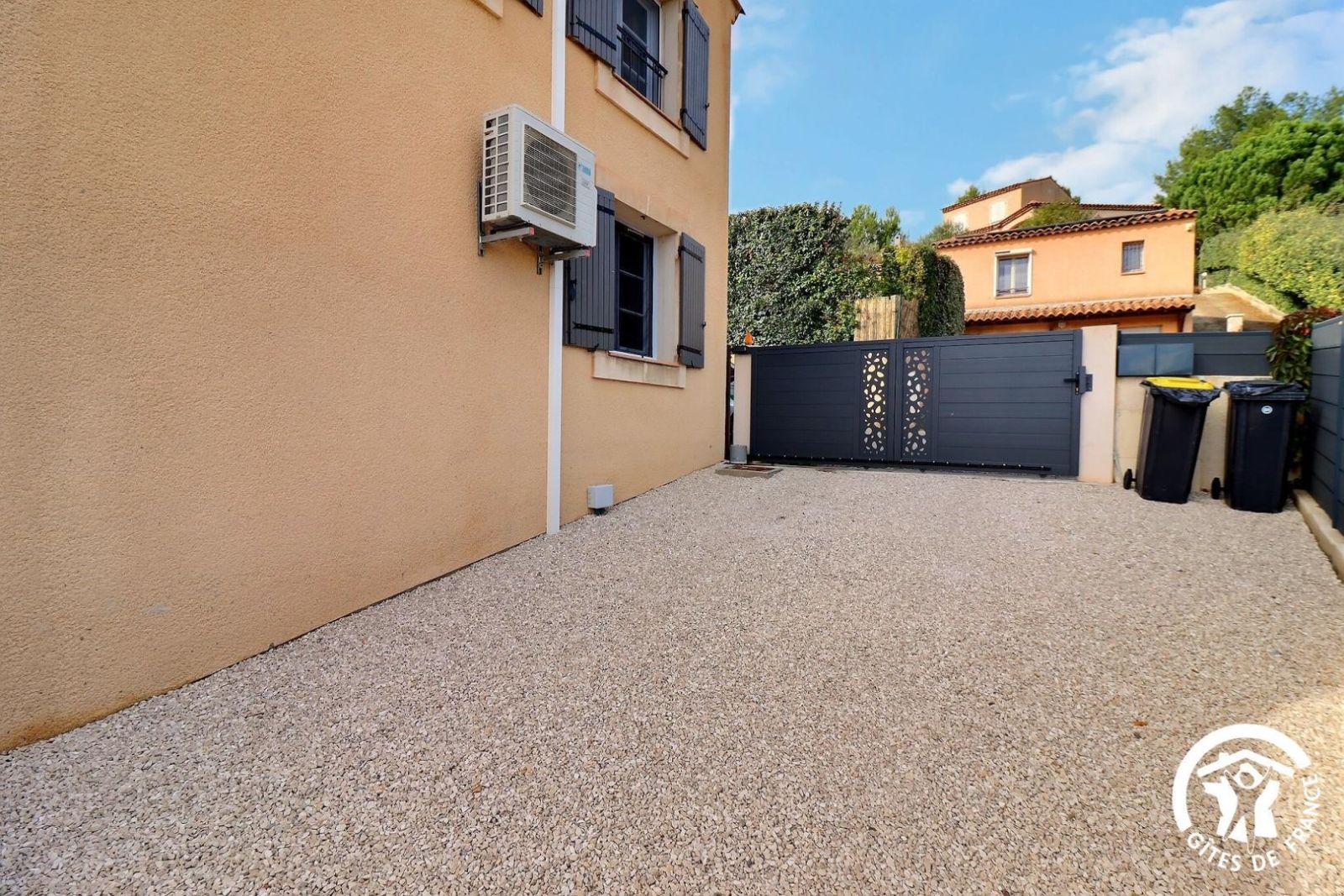 La cour avant permet de stationner deux voitures. Le garage, partagé avec les propriétaires, dispose d'une machine à laver.
