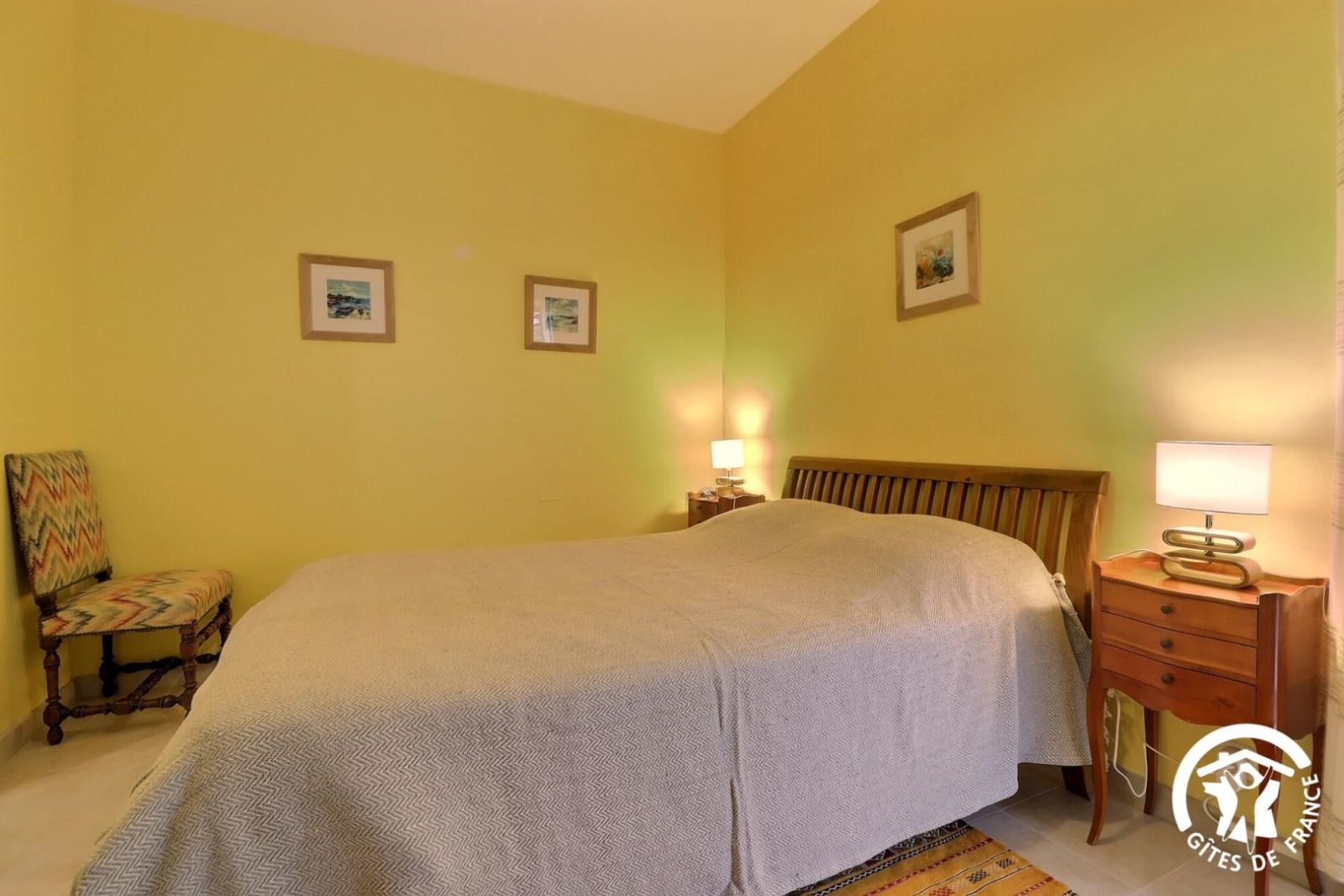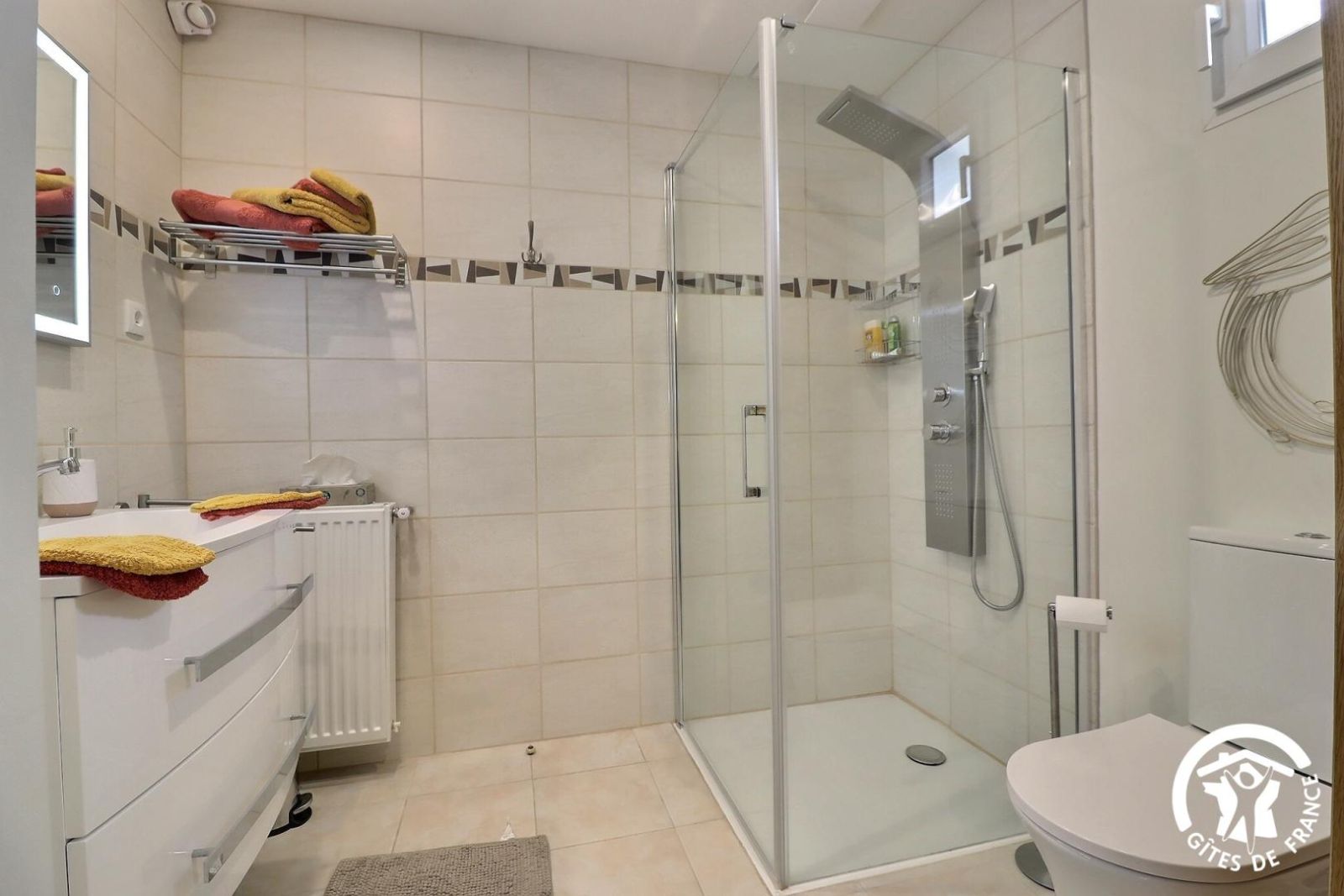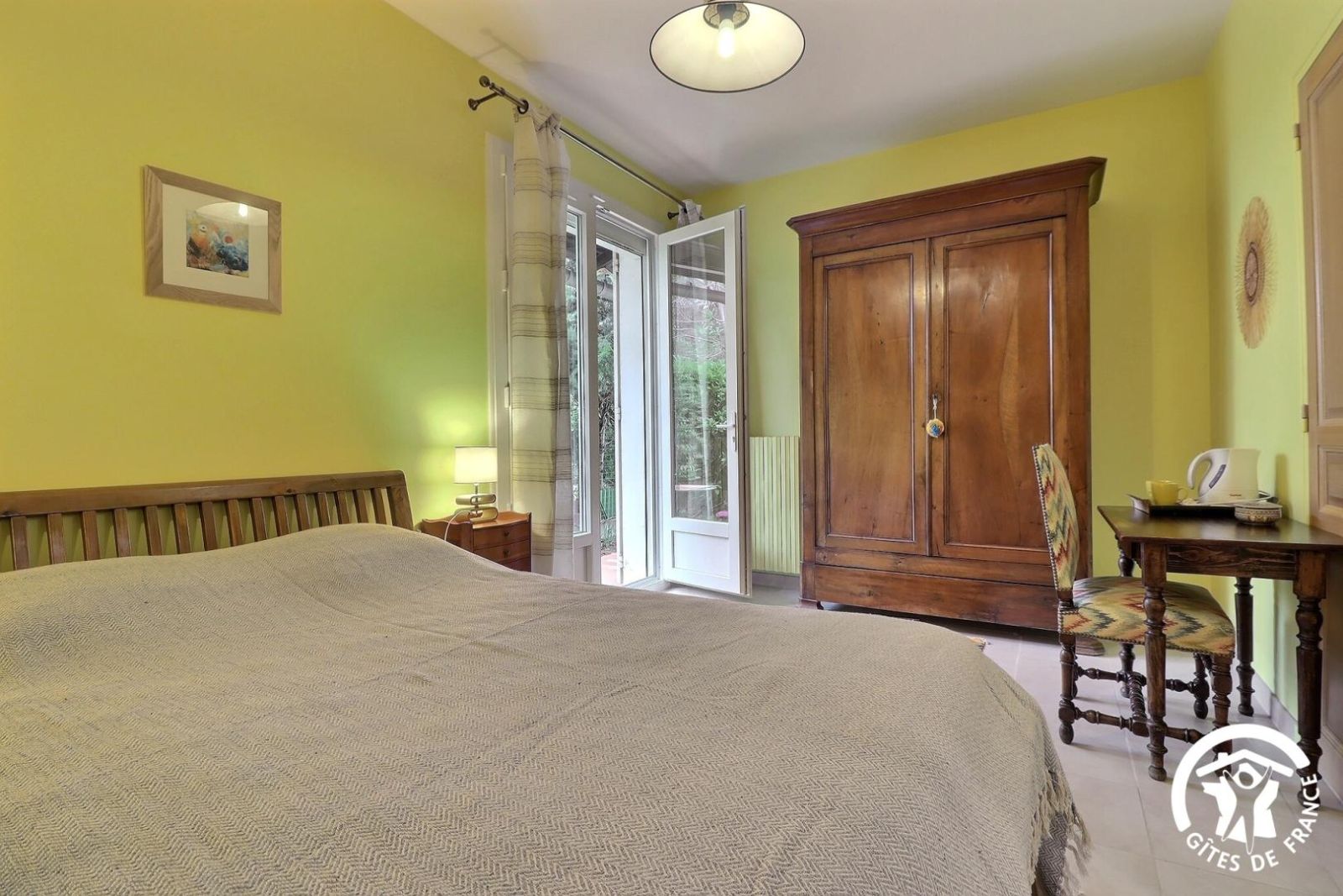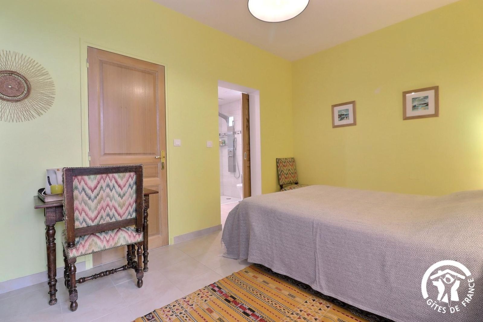 La chambre est accessible de façon indépendante à l'arrière de la maison. Elle est composée d'un lit 140x190cm, d'une grande armoire avec penderie et d'un petit bureau avec fauteuil. Une salle d'eau avec douche, WC et vasque est privative à la chambre. Plateau de courtoisie. Petite terrasse avec salon de jardin.