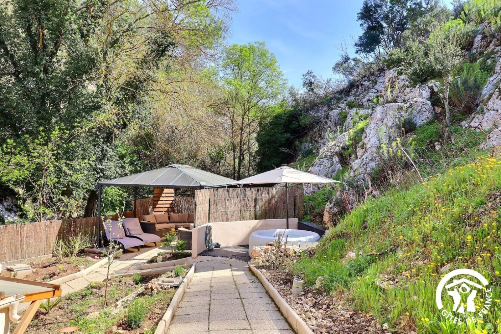 En contrebas, au bout du terrain, beau salon de détente extérieur couvert, avec bains de soleil. Spa gonflable privatif à disposition.