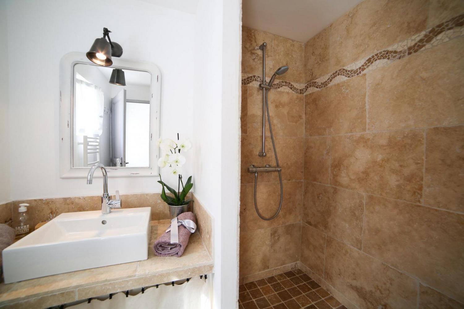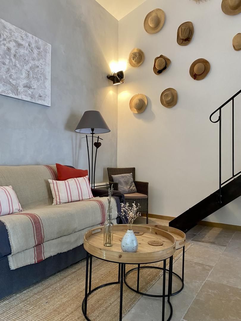 Au rez-de-chaussée : entrée indépendante avec grands placards de rangement, lave-linge et lave-vaisselle. Séjour avec belle hauteur sous plafond et poutres apparentes, coin cuisine intégrée et équipée (four, plaque vitrocéramique, hotte aspirante, micro-ondes, cafetière de type Nespresso et traditionnelle à filtres . Espace repas. Salon avec canapé convertible), TV écran plat, bureau, chaîne hifi, lecteur DVD. Salle d'eau avec jolie douche à l'italienne (mitigeur thermostatique), vasque en pierre, porte-serviettes chauffant, WC.
