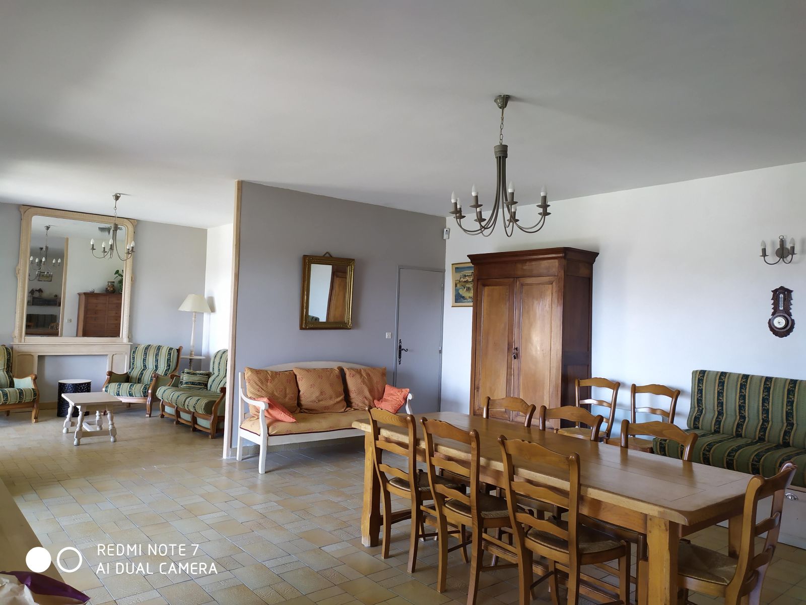 - Séjour + salon : 65 m² (table avec rallonges , 9 chaises , cheminée avec insert bois a disposition ,3 banquettes, salon avec 2 fauteuils et un canapé, TV écran plat 98 cm, wifi BOX, climatiseur).