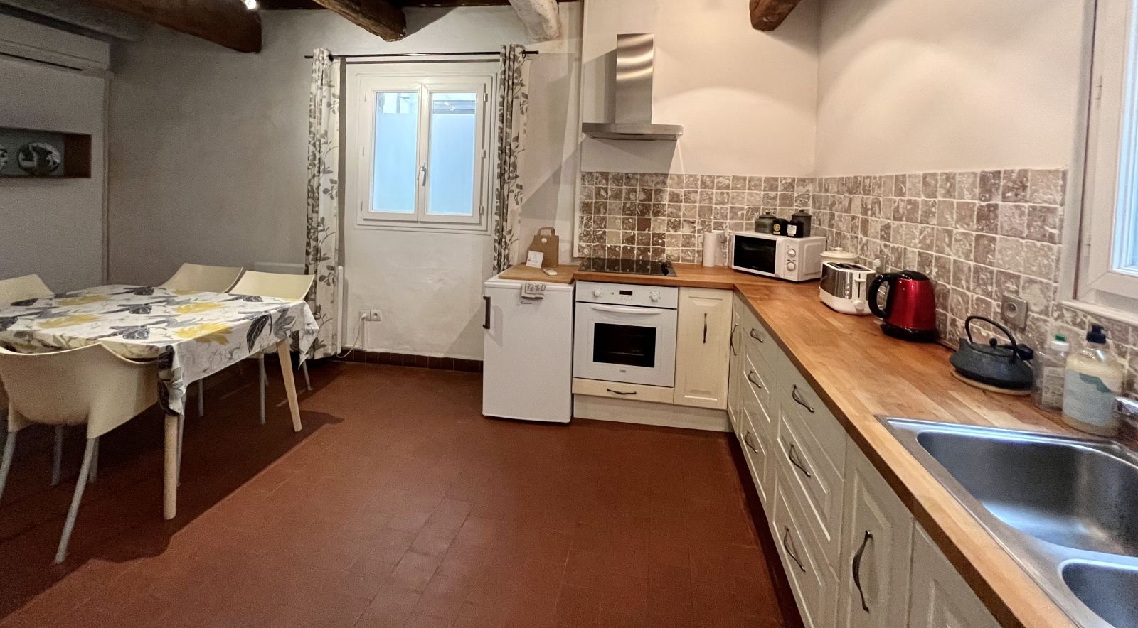 Réfrigérateur-congélateur, four, plaques de cuisson, bouilloire, lave vaisselle, machine à café senseo, vaisselle et accessoires de cuisine etc...