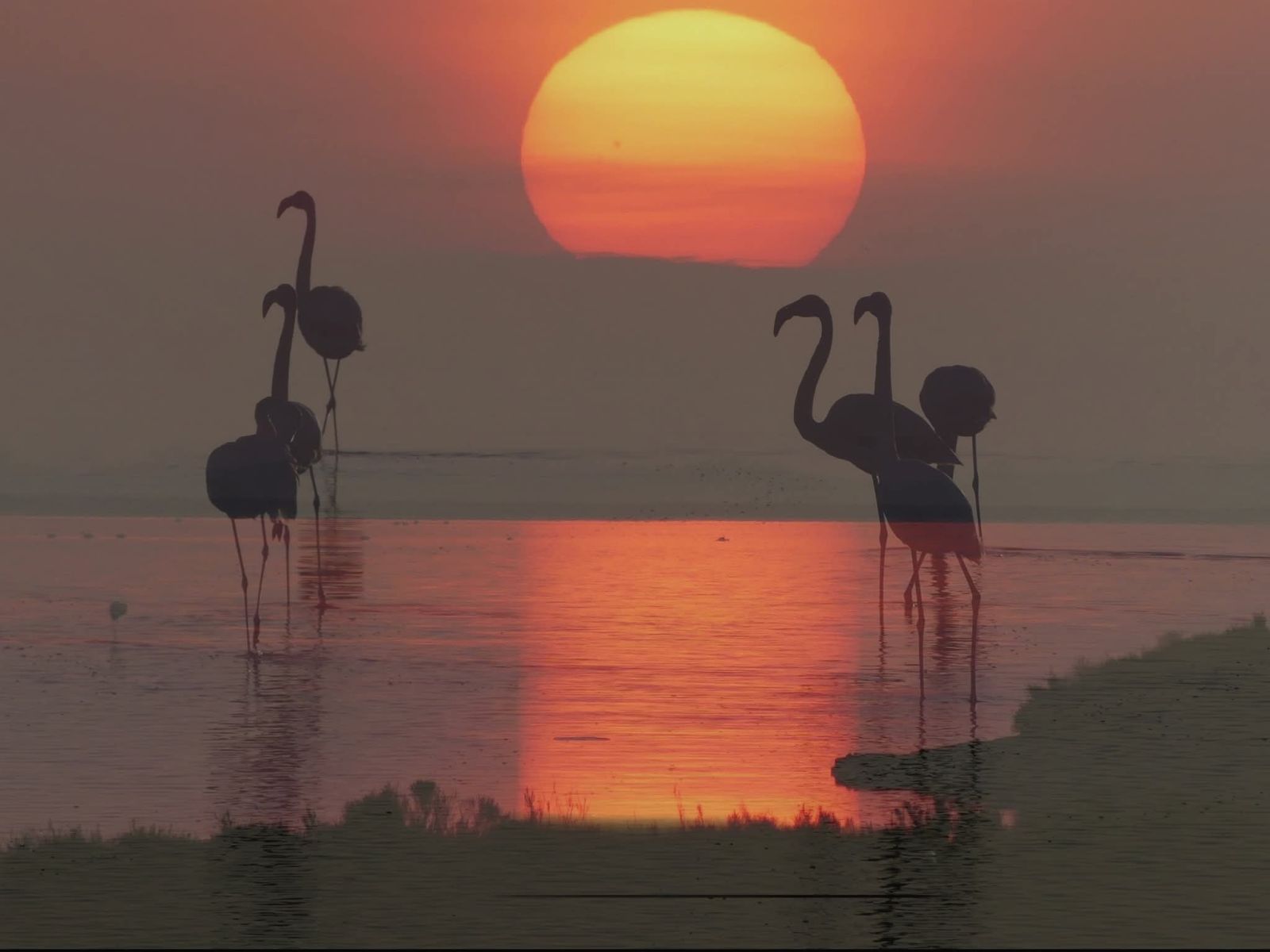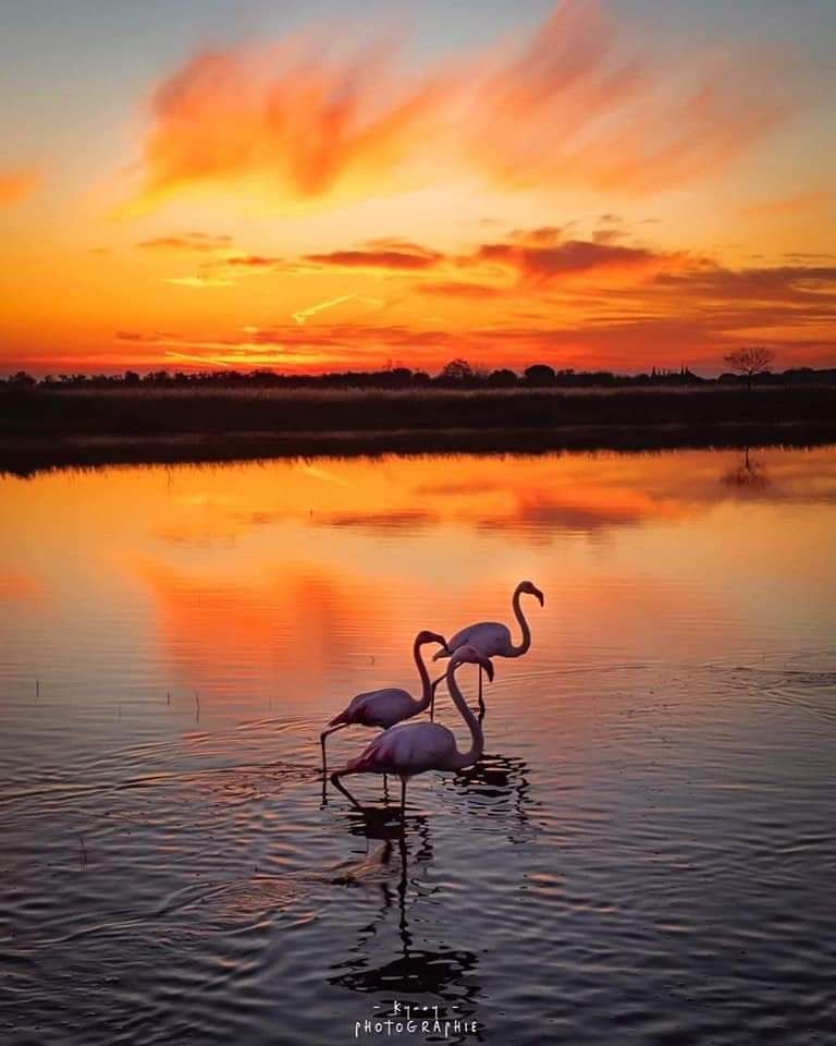 © flamands au coucher de soleil sur les marais
